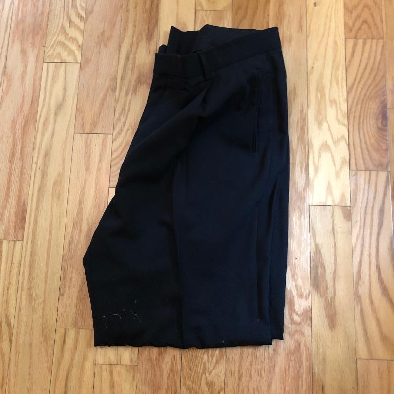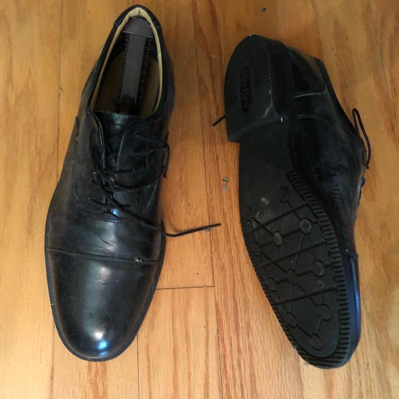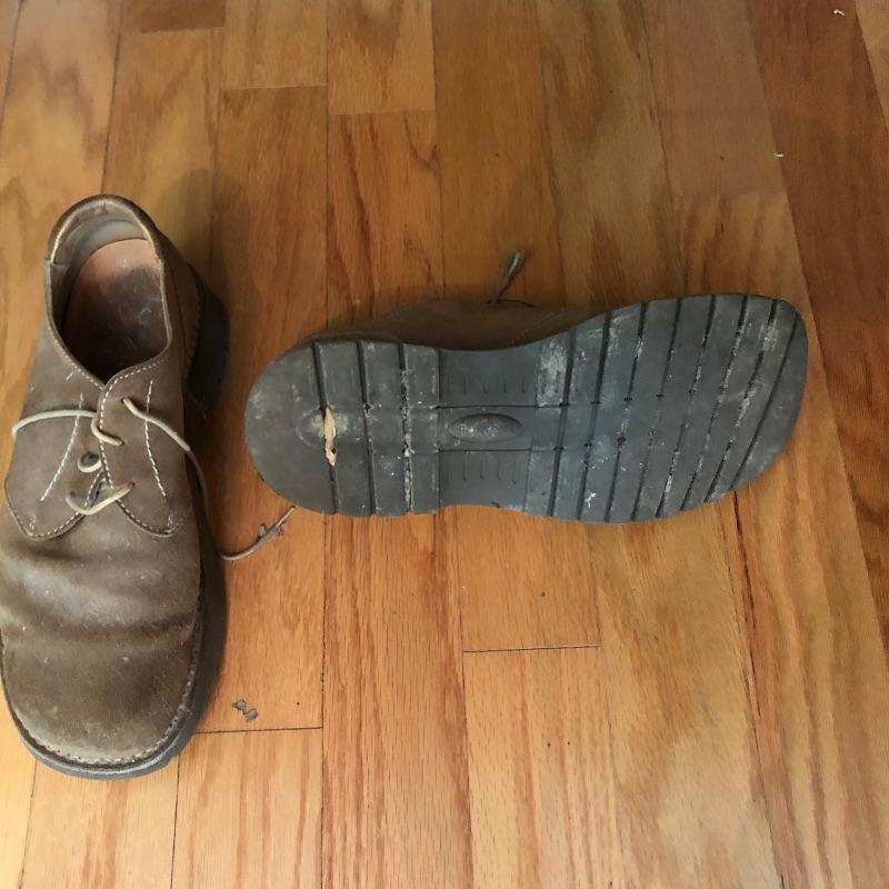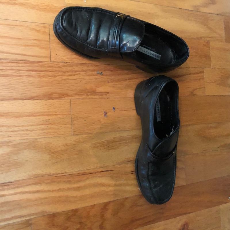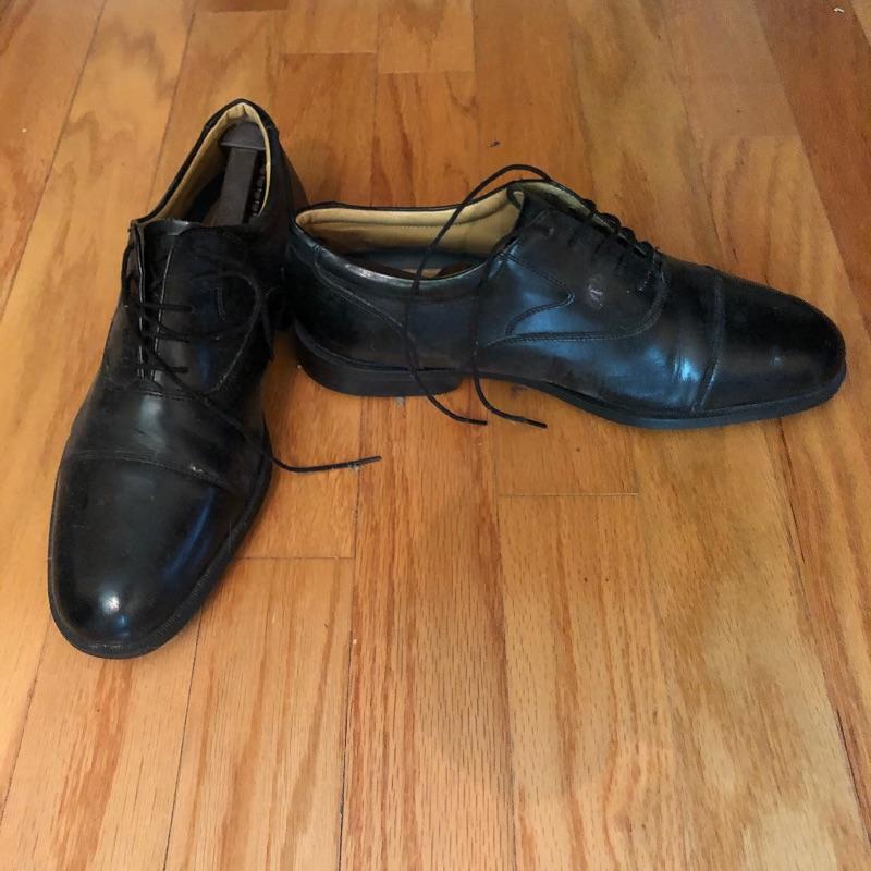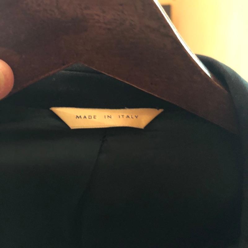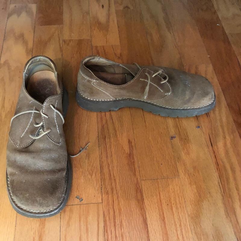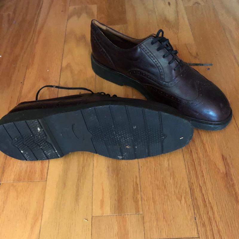 The London Fog grey wool coat measures 19” shoulders, 23” chest and 48” long. The Donna Karen suit is made in Italy and the suit coat measures 19” x 23” x 34”. Also included are sweaters and waistcoats in size Large and a total of five pairs of shoes that are size 11, the last pair pictured are Made in Portugal, other brands include Rockport and Florsheim. The Broner hat is extra large.