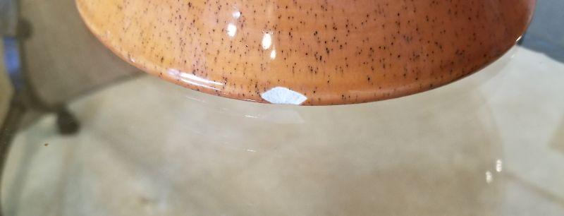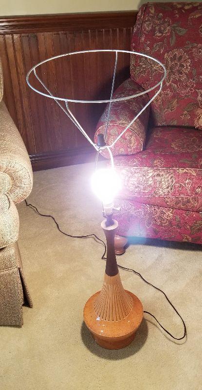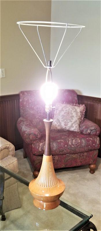 Check out this cool attic find - mid-century table lamp (1960's), ceramic base, wood acccents. As you see here. Note: one small chip to the base. Stands 38.5" tall.