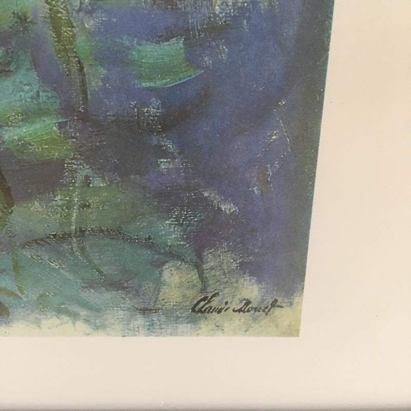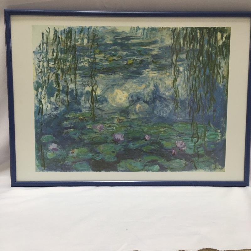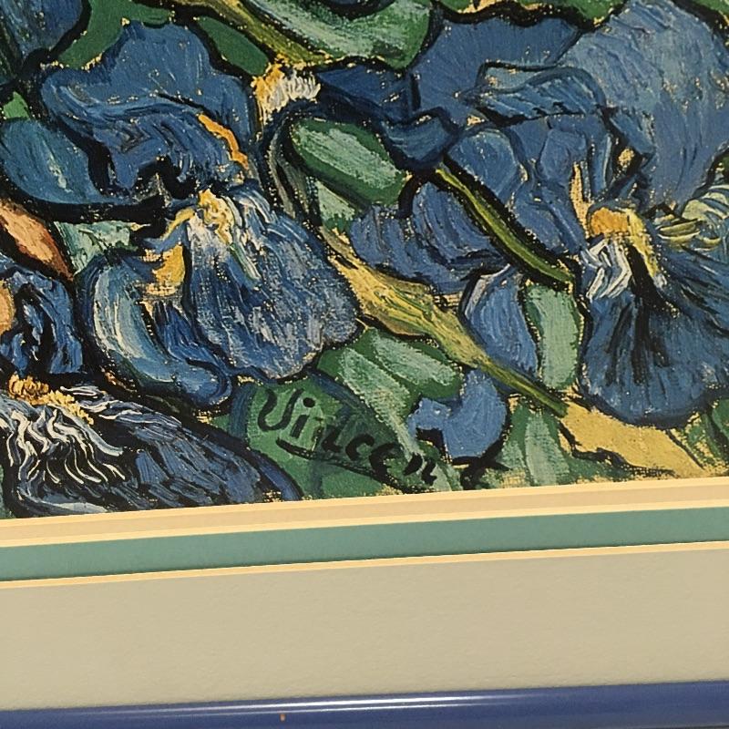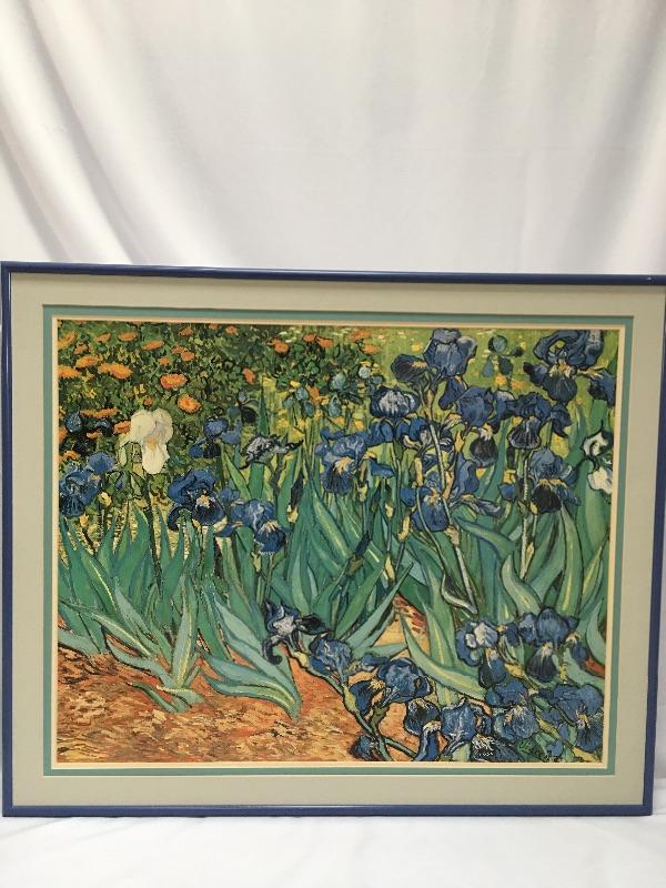 Monet framed artwork titled Water Lilies and a Van Gogh Framed and matted artwork titled Irises with notecards. Largest frame measures 32.5” x 38.75”.