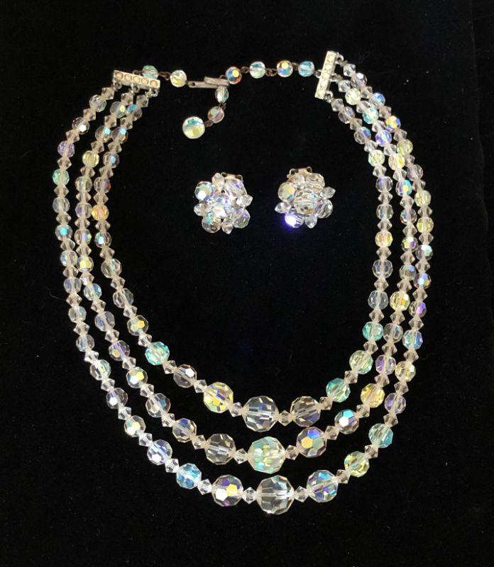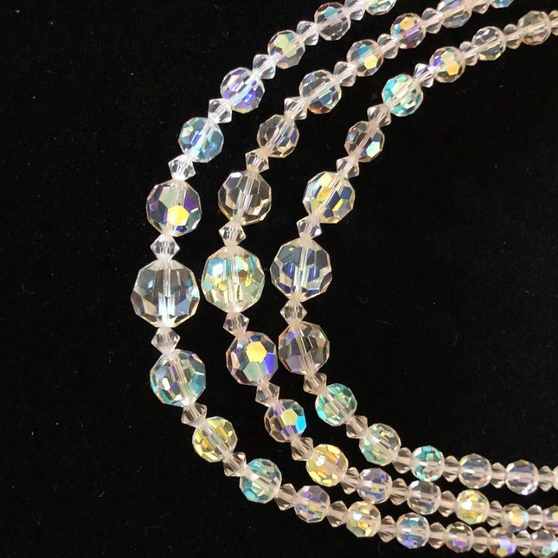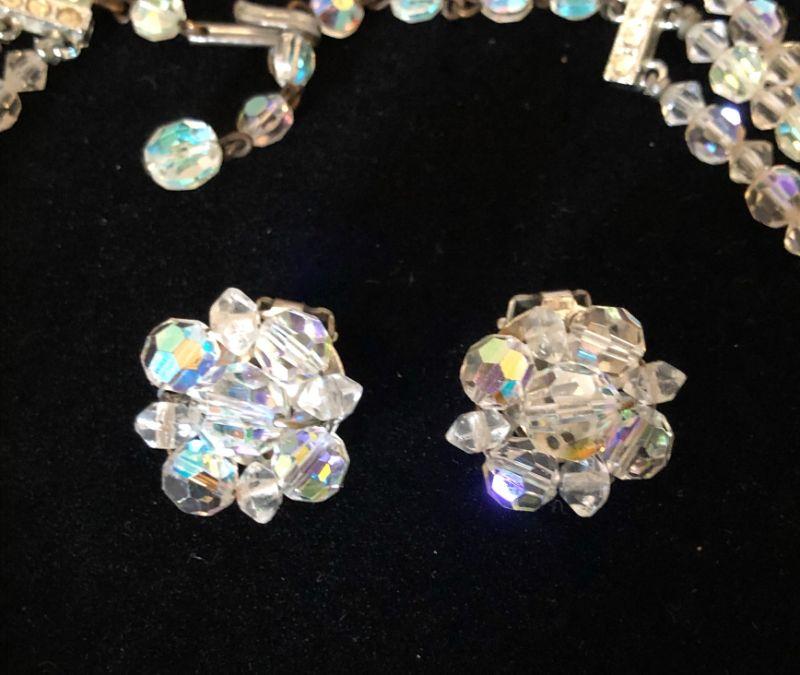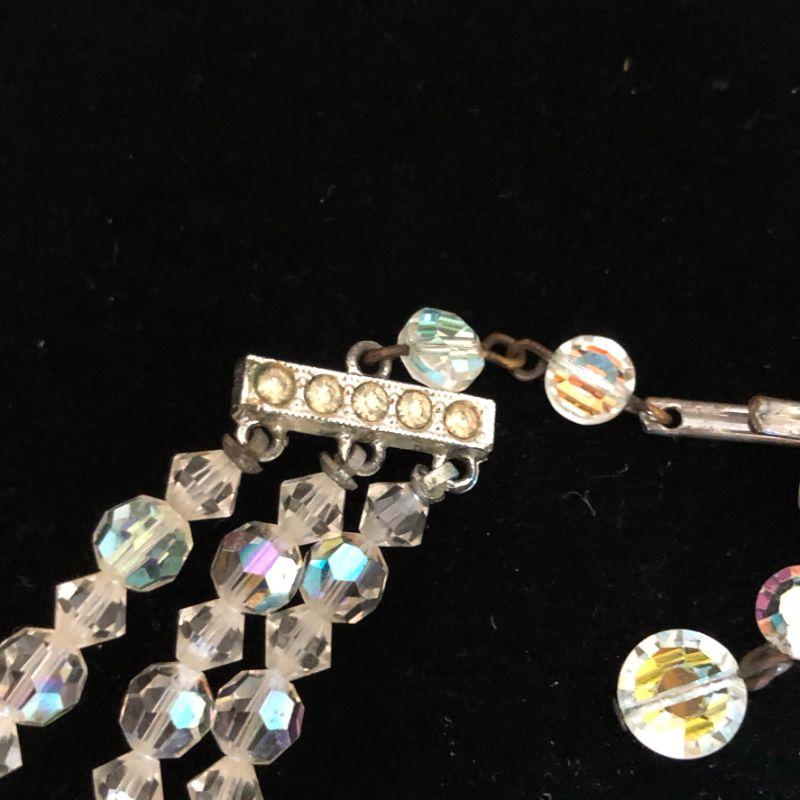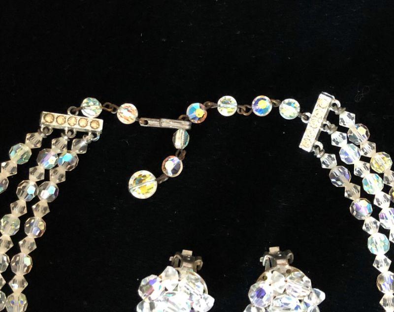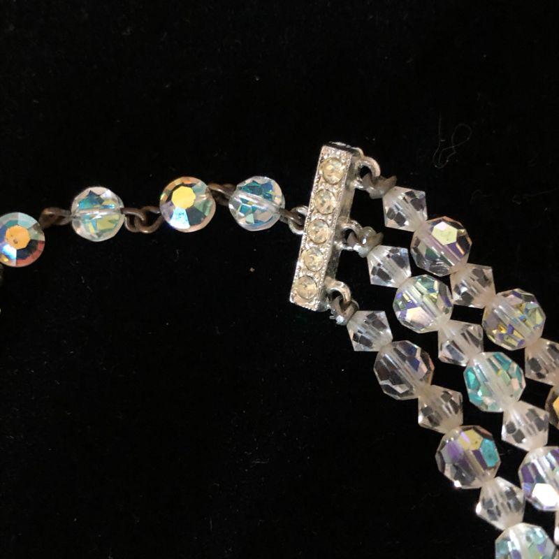 These are in great condition, but there are not any maker's marks that I can find. By the weight of the choker, I'm assuming that the iridescent beads are glass. Both sides of the clasp has additional bling.