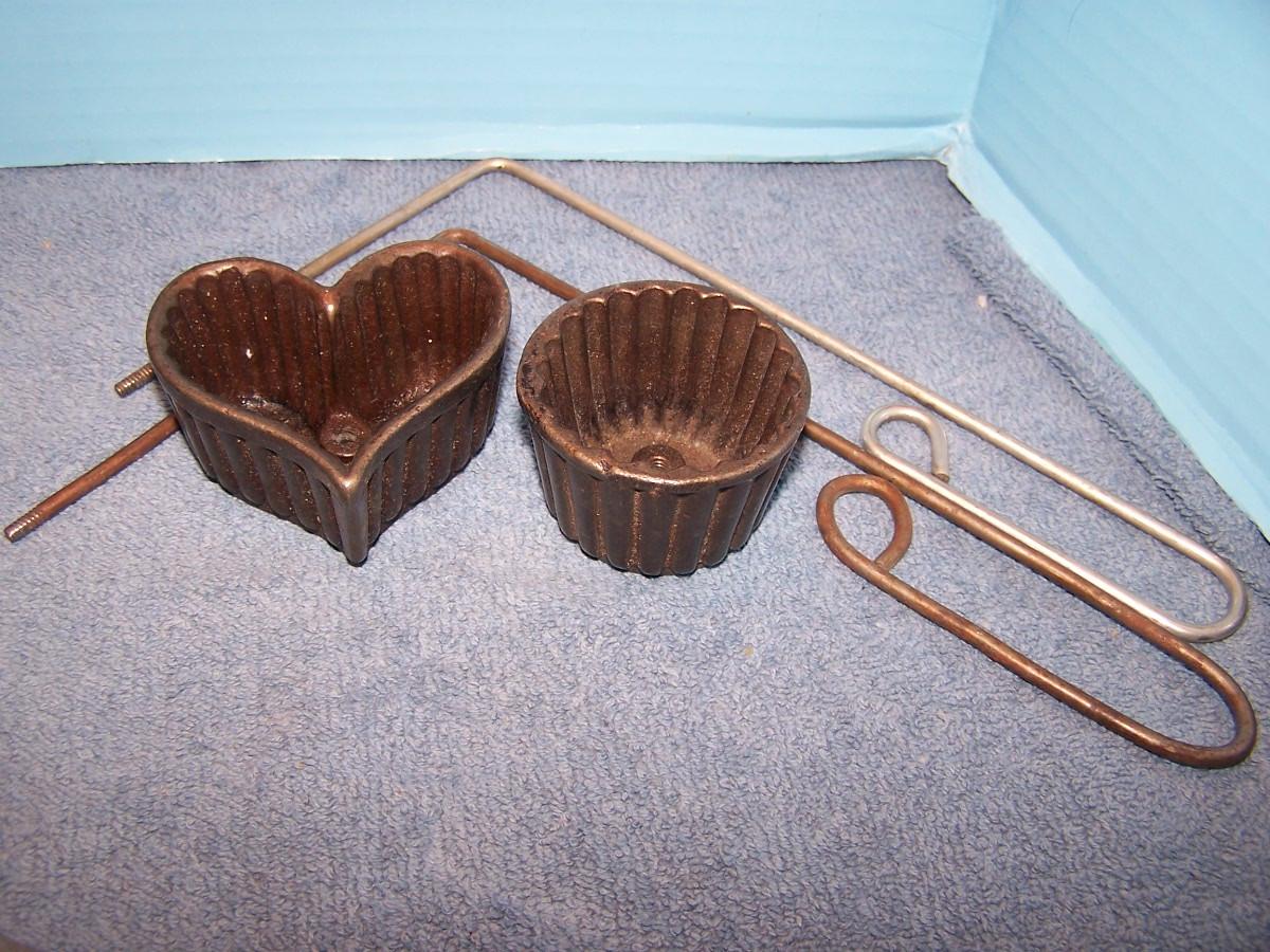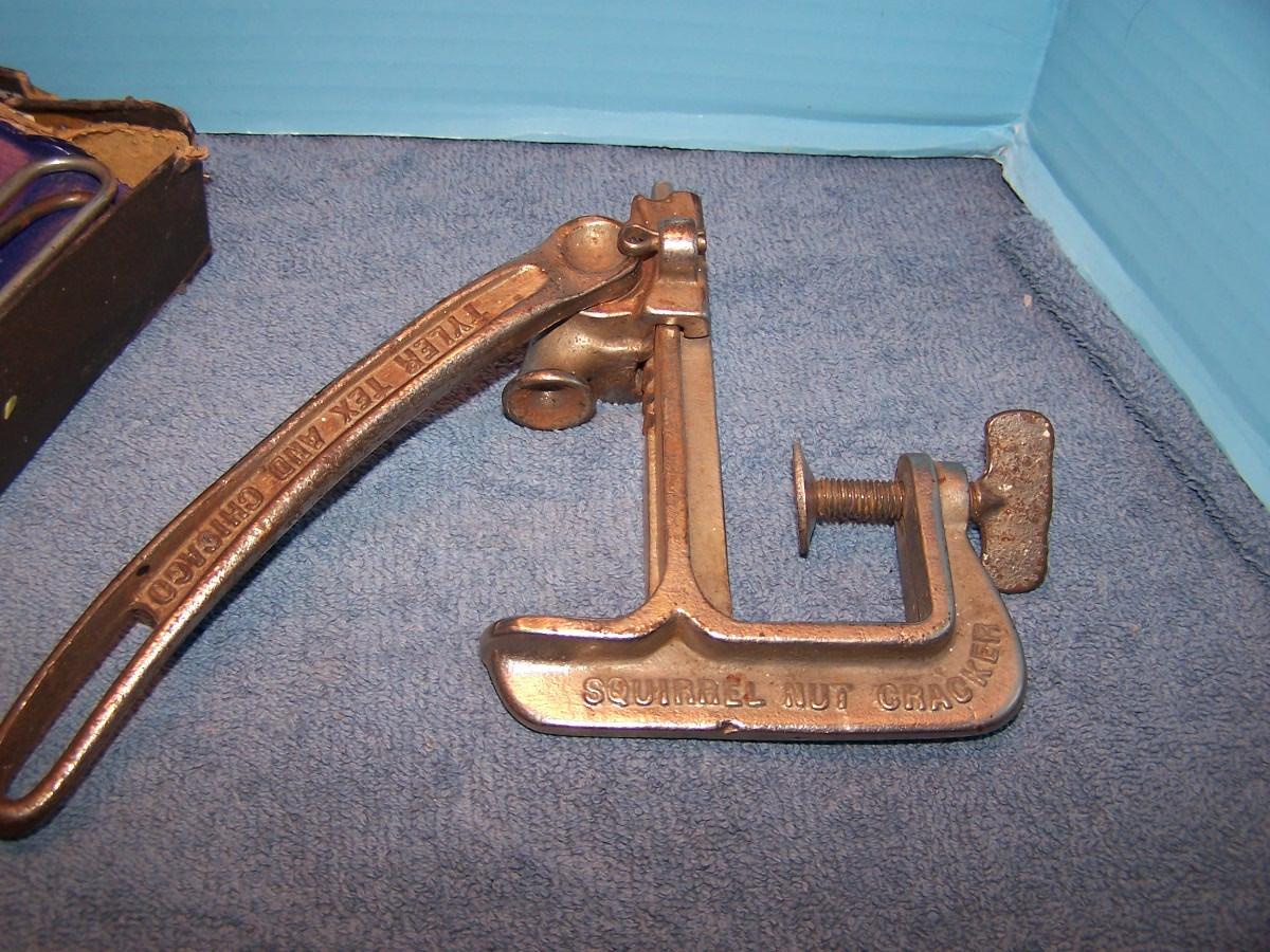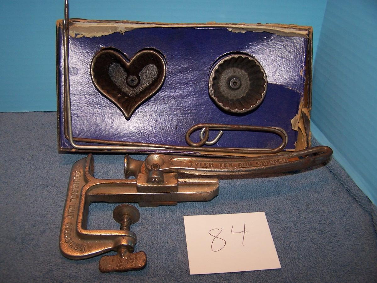 GREAT OLD KITCHEN GADGETS!!!! ROSETTE IRON IN BOX(TORN/DAMAGED BOX) HAS AN EXTRA PIECE... THE NUT CRACKER IS CAST/NICKLE PLATED.... LIGHT WEAR TO THE UTENSILS....