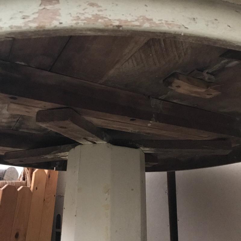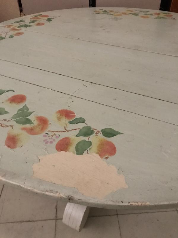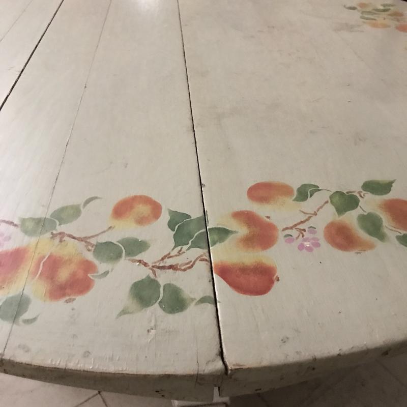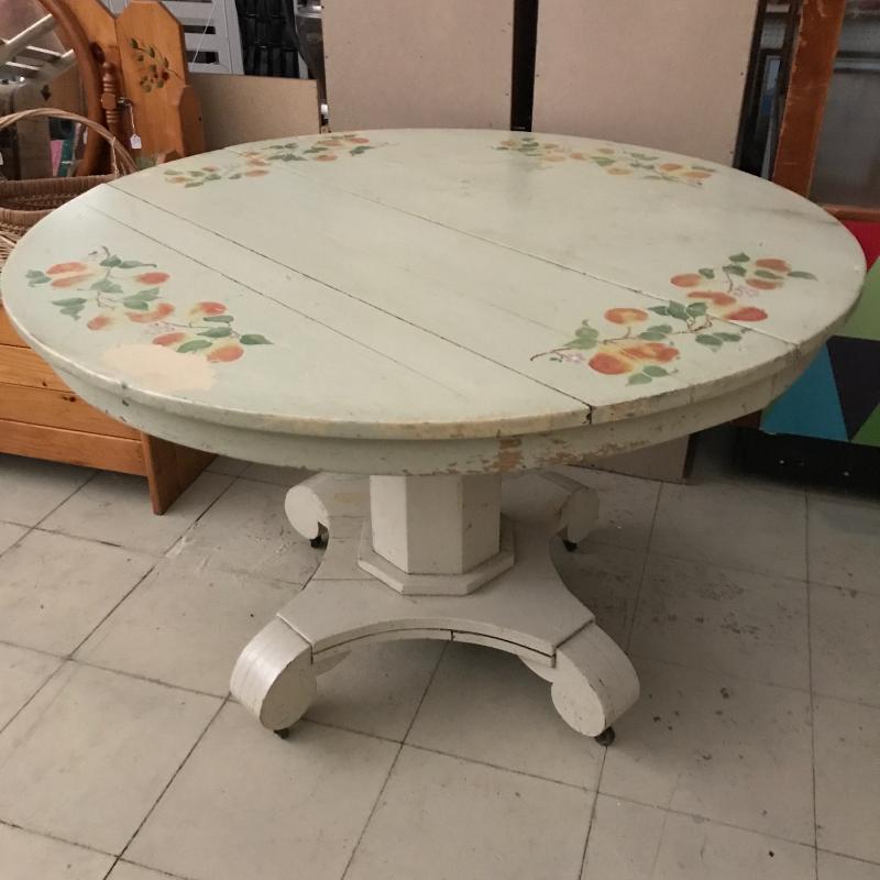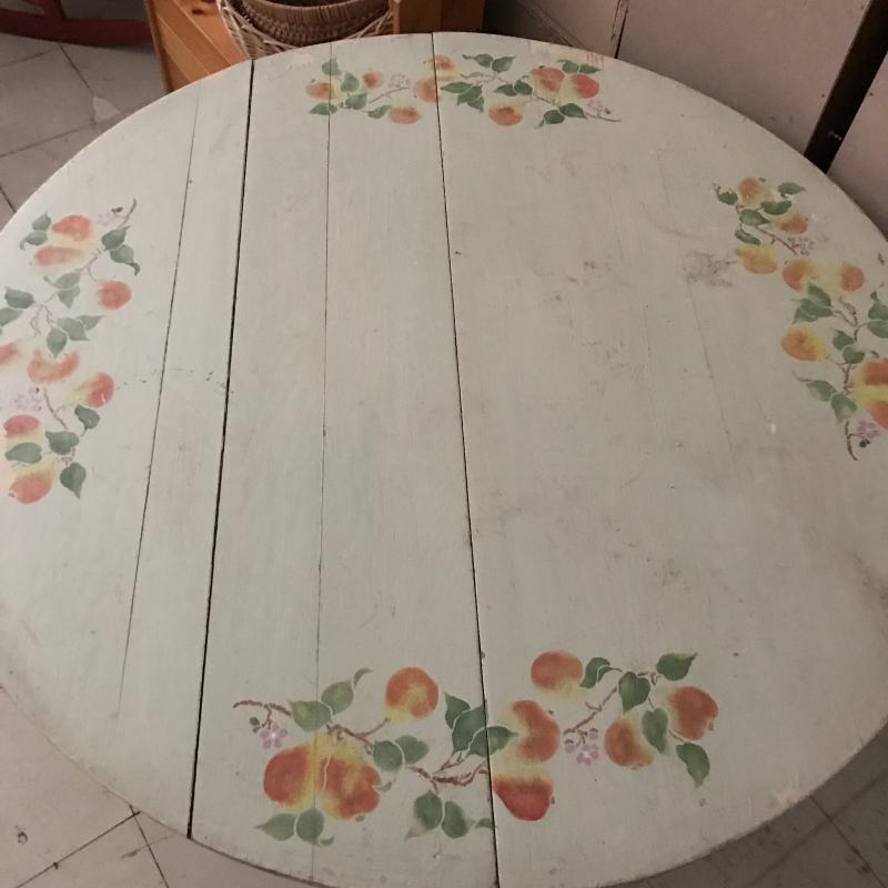 Cute round wooden table with fruit painted on top. Light green base color with a bit coming off on one side. See pics. Wheels on table base. Measures 45” d x 30” h. No shipping. Local pick up only in Maggie Valley.