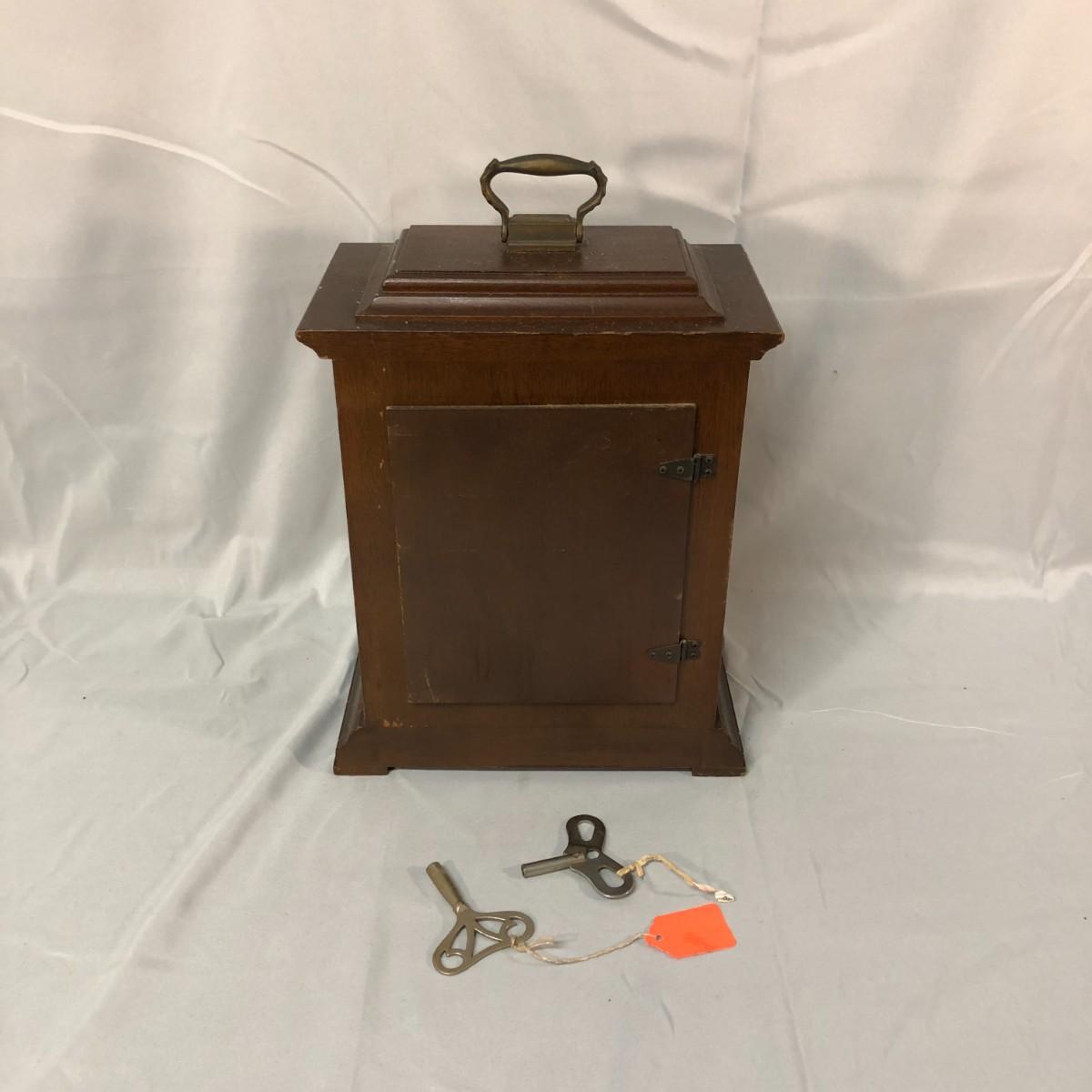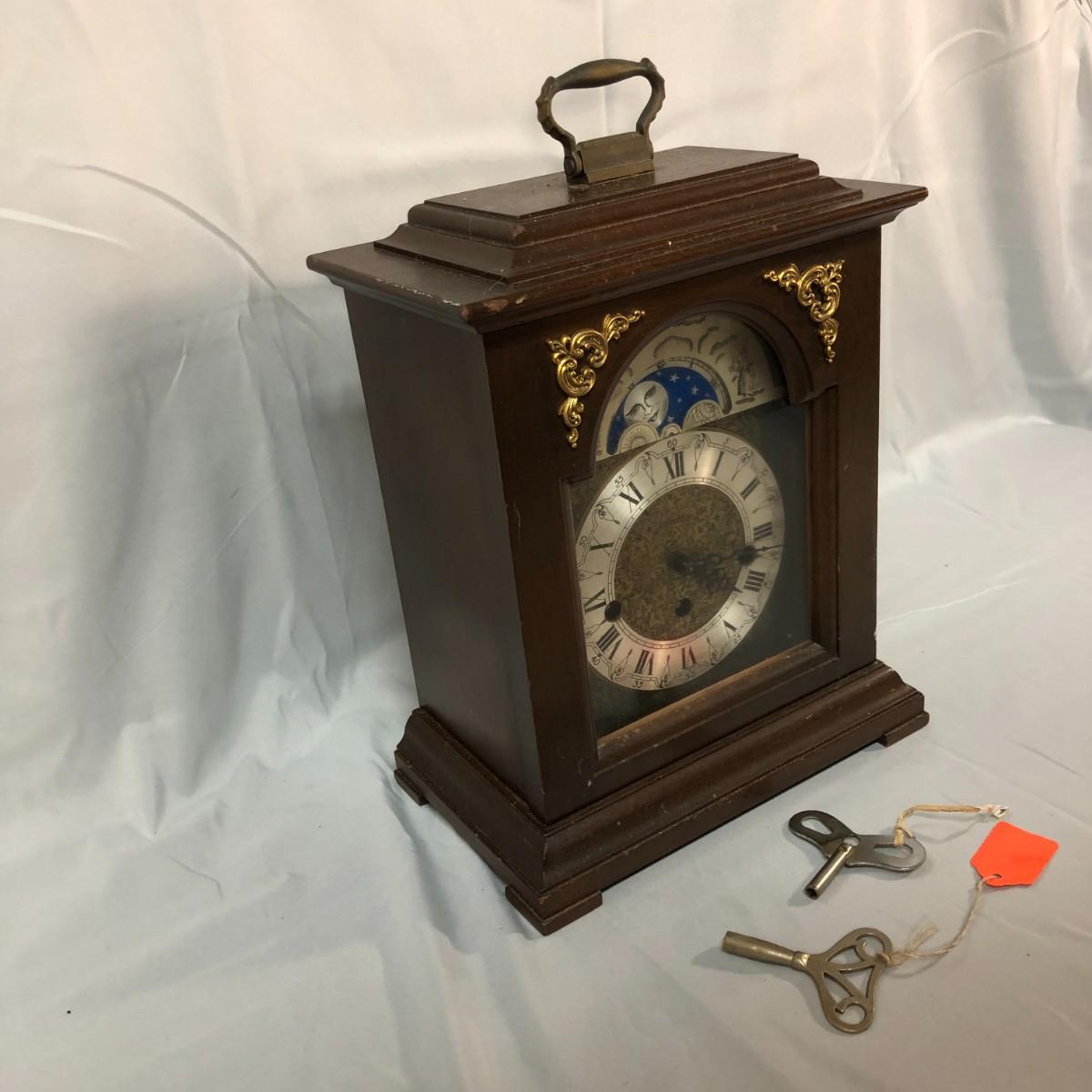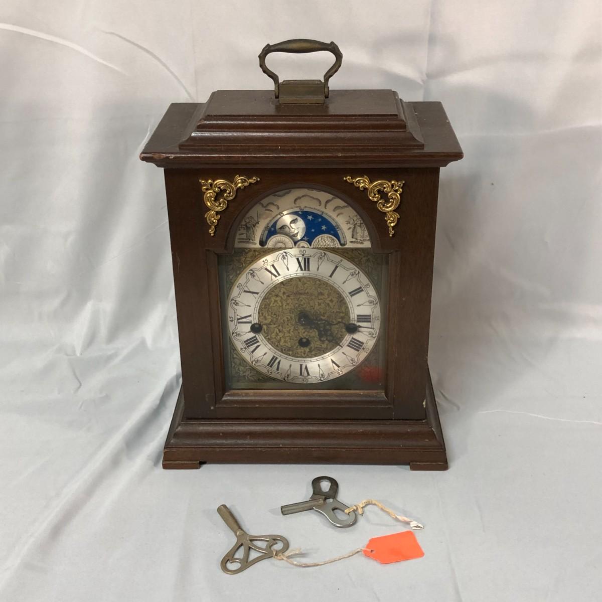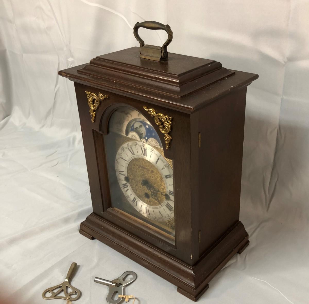 This is a wind up clock that has two keys. It chimes on the hour and the half hour. It was wound up before taking the pictures and has been working well for at least an hour. If things change, I'll update the listing. It stands about 13.5" tall.