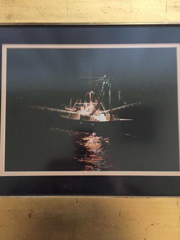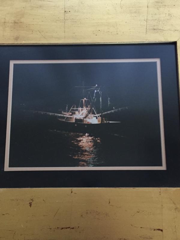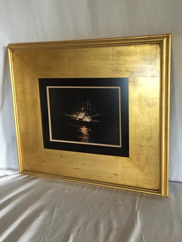 Nighttime print of shrimp trawler, matted and framed. Frame measures 23.5” x 20.75”. Local pickup only.