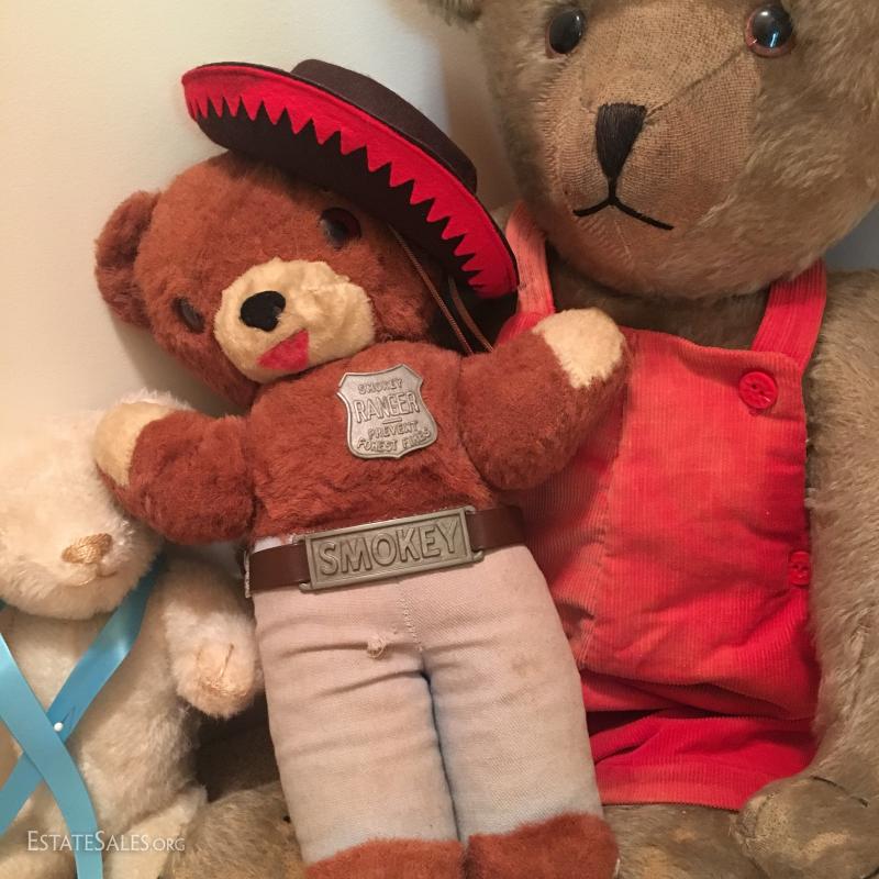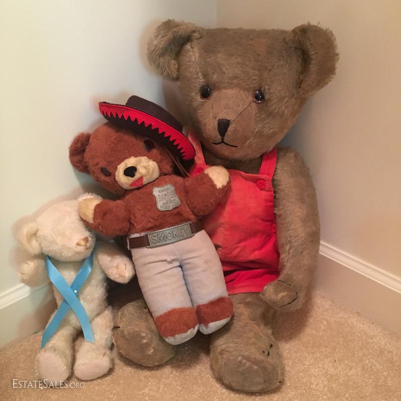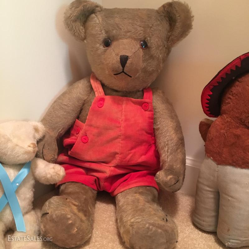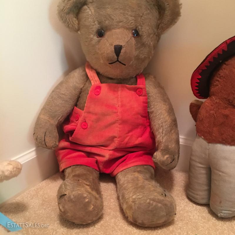 German white mohair bear, vintage Smokey Ranger, large vintage bear with red overalls.