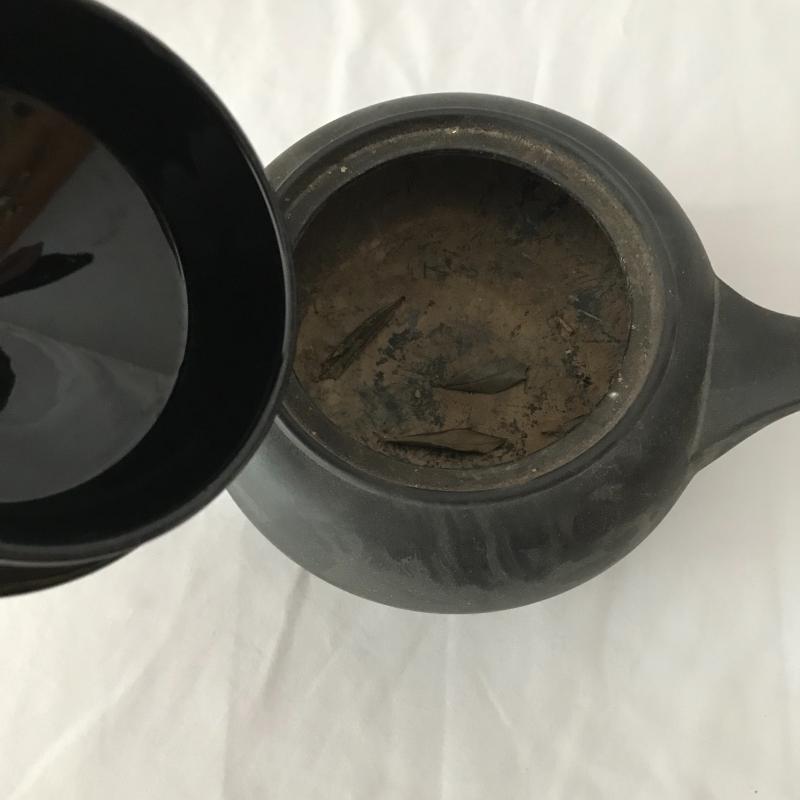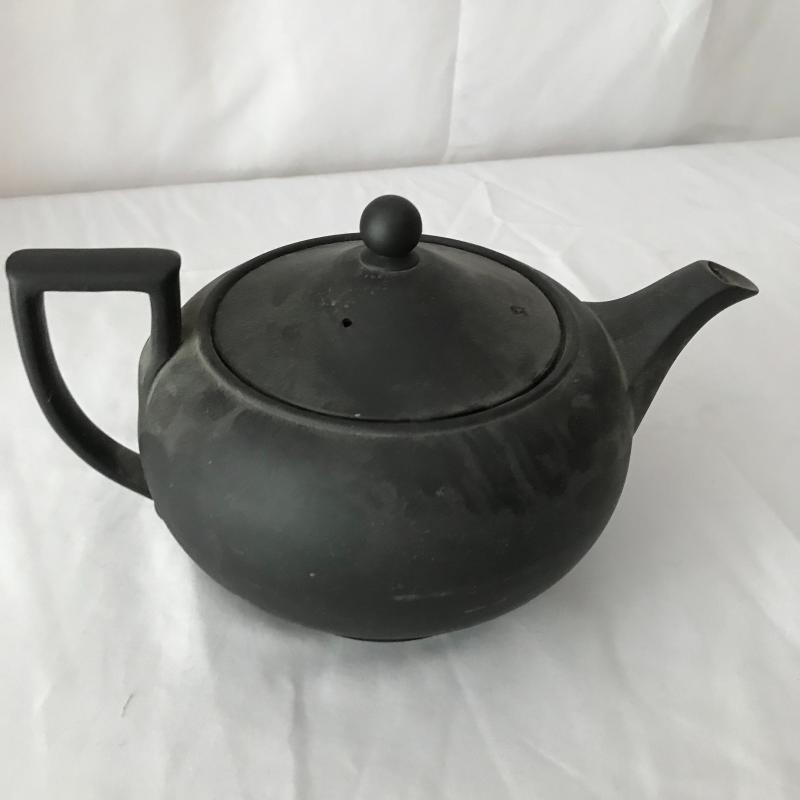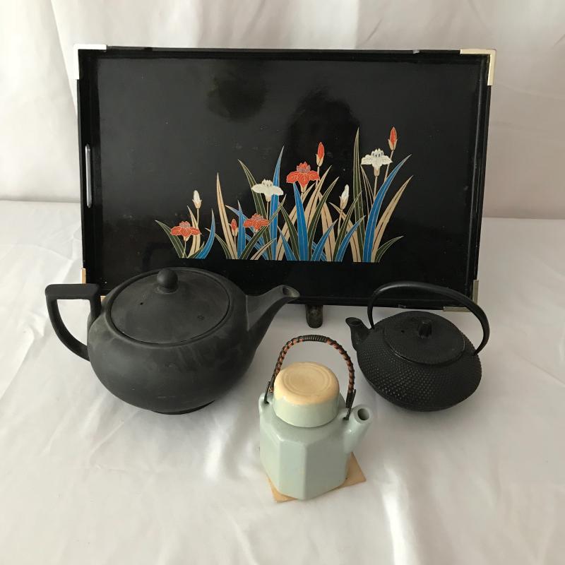 Three teapots and a vintage plastic serving tray. Largest teapot is approx. 5” tall and 8.5” wide. Tray is approx. 16.5” x 10.5” x 1.5”. No shipping available. Local pickup only in Asheville, NC.