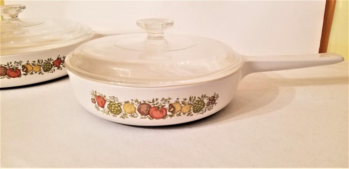Lot of two Corning Ware Spice of Life Range Topper skillets - both have lids. You get the 10" skillet and the 8.5" skillet - both are gently used.
