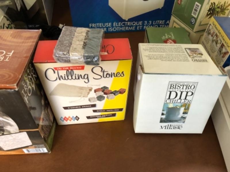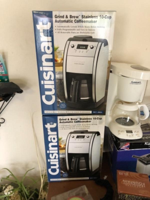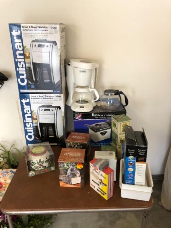 Lot 84. Two new Cuisinart coffee makers still boxed, used white Cuisinart pot, deep fryer, two tranquility fountains, two dip chillers, Hawaiian mugs, space bags, extra glass coffee pot, etc.--WAS $65““NOW $32.50