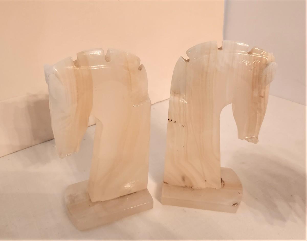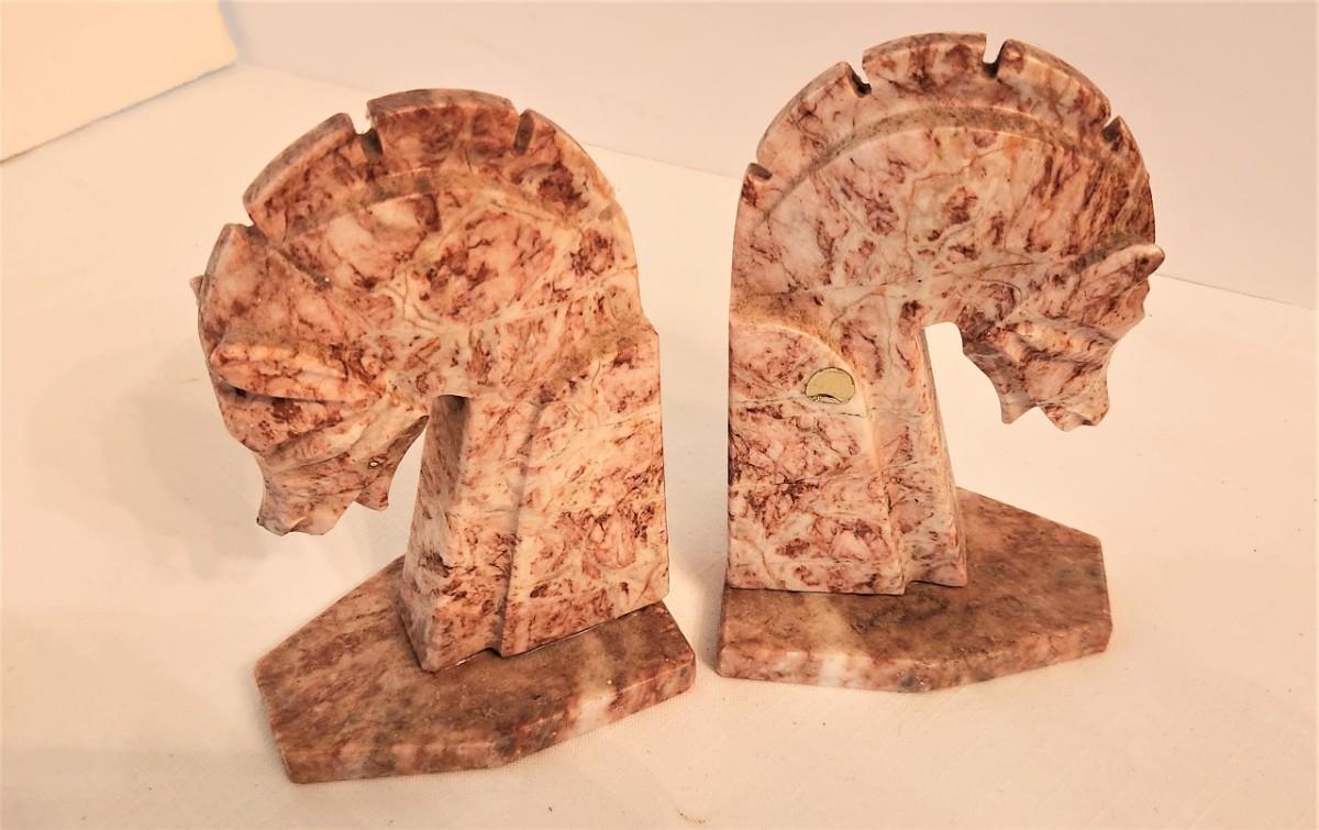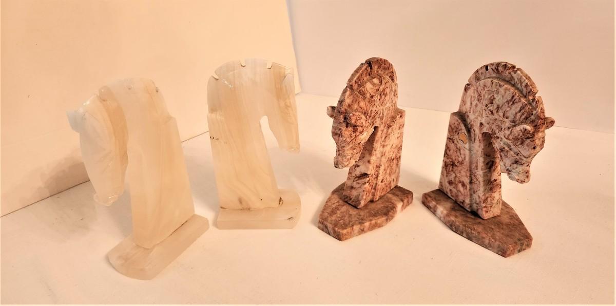 Two pair of vintage carved stone souvenir Mexican bookends in the form of horse's heads. One white, one multi-color. Each stands 7.5" tall. Good vintage condition.