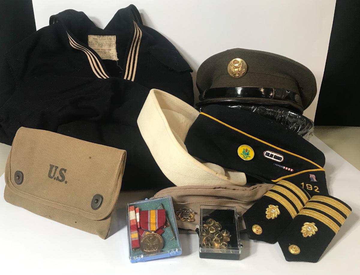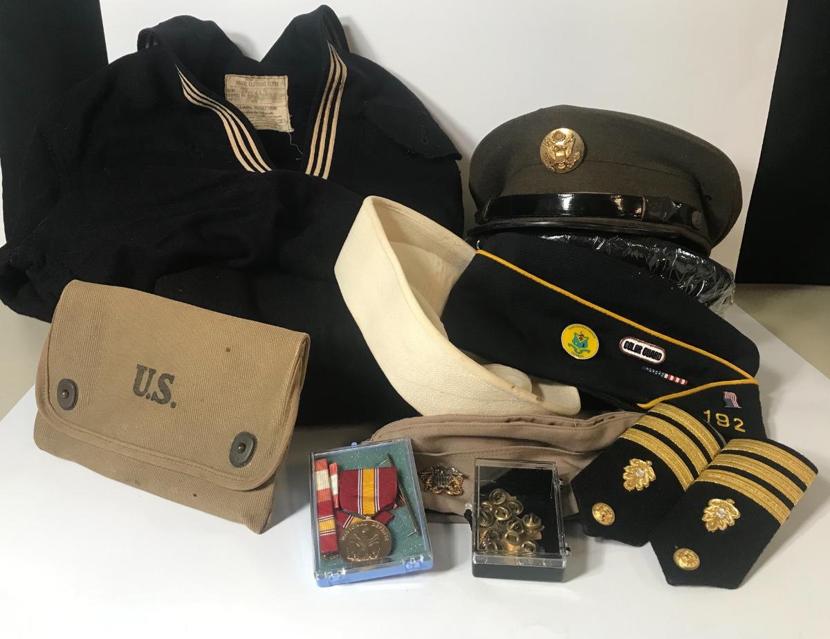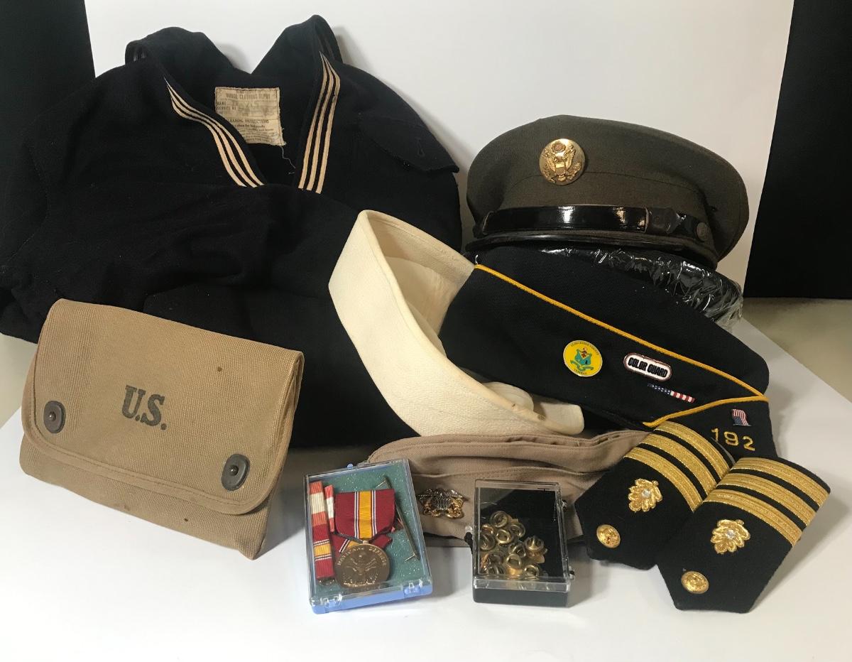U.S. Military Uniform Pieces and Hats - Navy. Please see all pictures as they are the best representation of the items. The pictures show condition, measurements if taken, and what is included in the lot. Due to the large amount that we photograph and the time frame, we are not always able to take measurements. All items unless noted, are pre-owned and have been used. Please bring packing materials for your items. If you purchased furniture, you must bring help. We do not allow one person to carry large furniture out on their own. Bring help, tools and a truck for your personal safety. Company policy. Thank you.