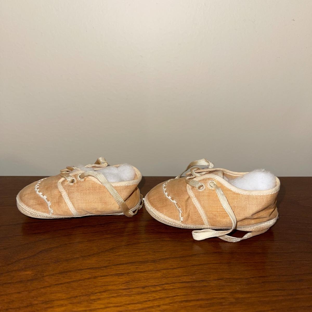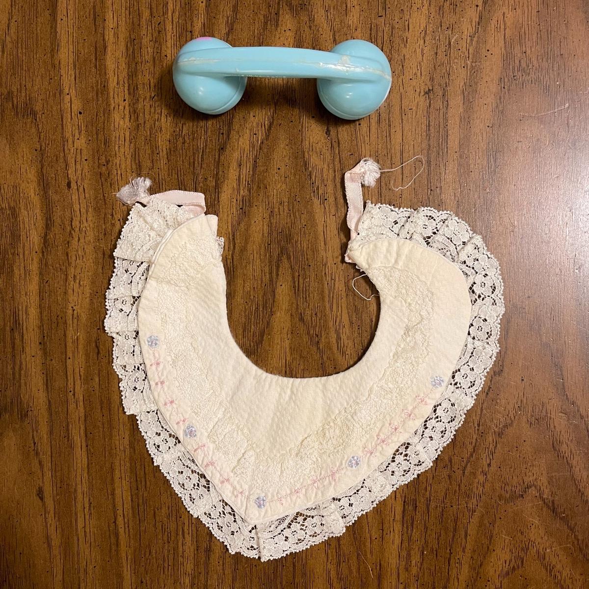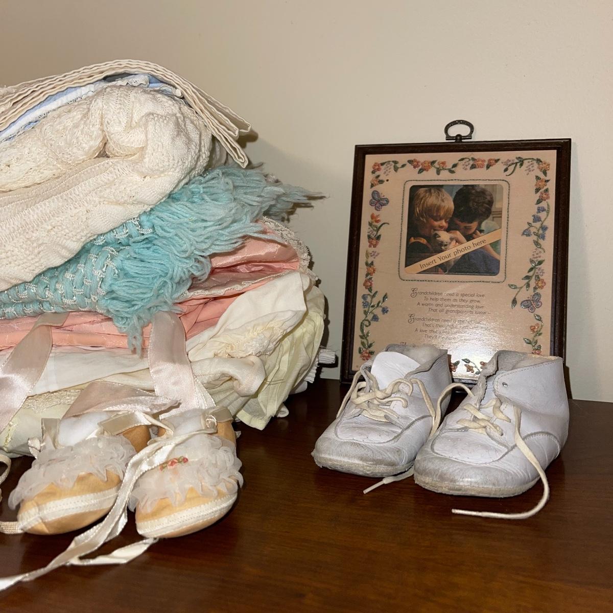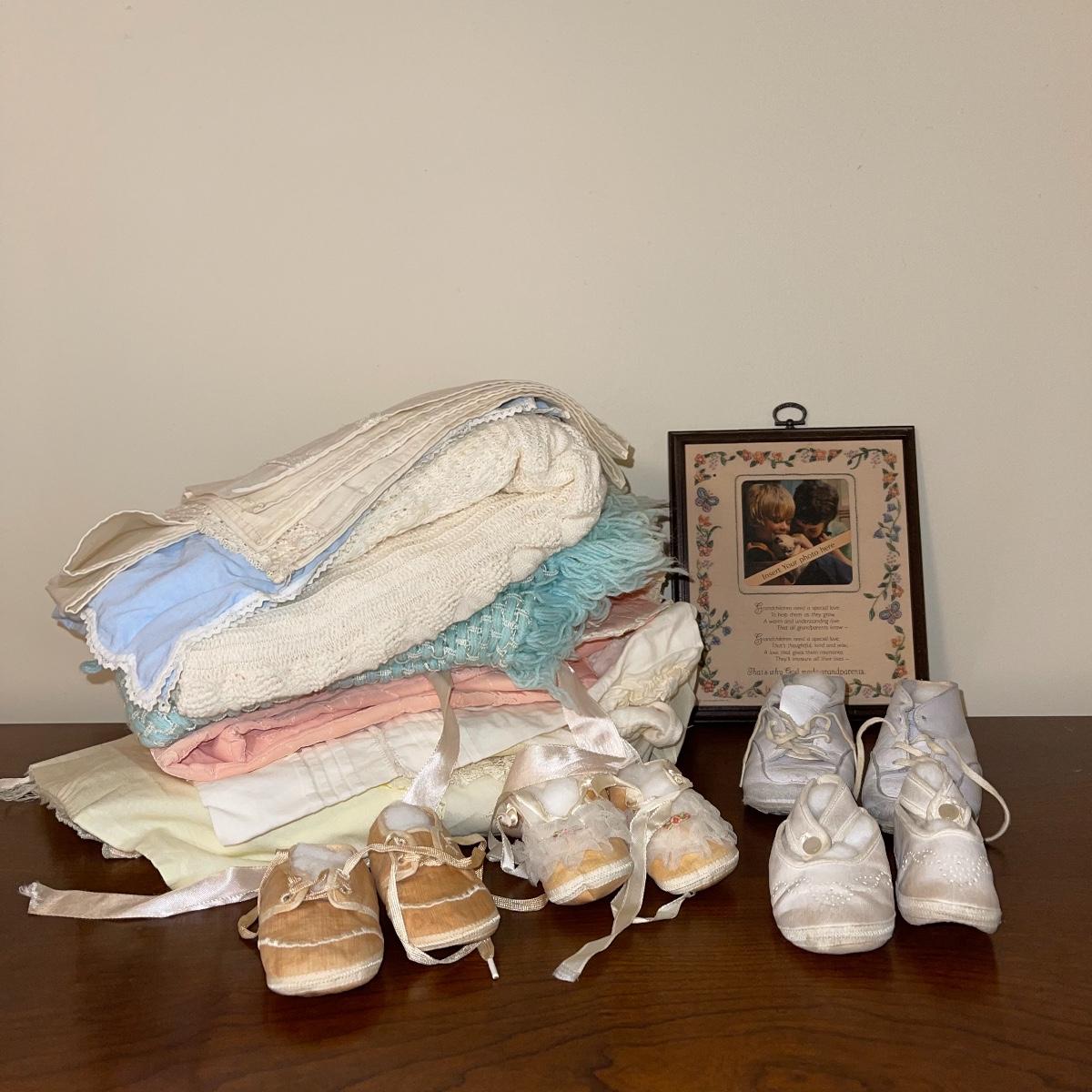 Between the baby shoes, clothing, and embroidered burp cloths, this lot has the cute small clothing that any one with a baby or dolls would want to dress them in. These vintage baby items are in good condition and include a pillowcase as well as four pairs of shoes, about ten pieces of apparel and two blankets with a couple more sweet vintage linens.