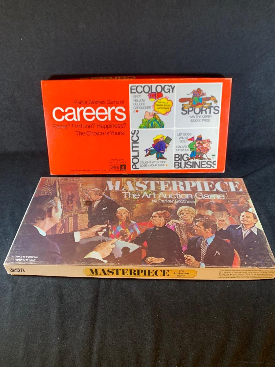 Lot includes the 1970 Parker Bros Masterpiece The Art Auction board game complete with all instructions. Also includes the 1971 Parker Bros Careers board game. This game comes with instructions and pieces but would need more scoresheets that could be created or scanned from old ones included.