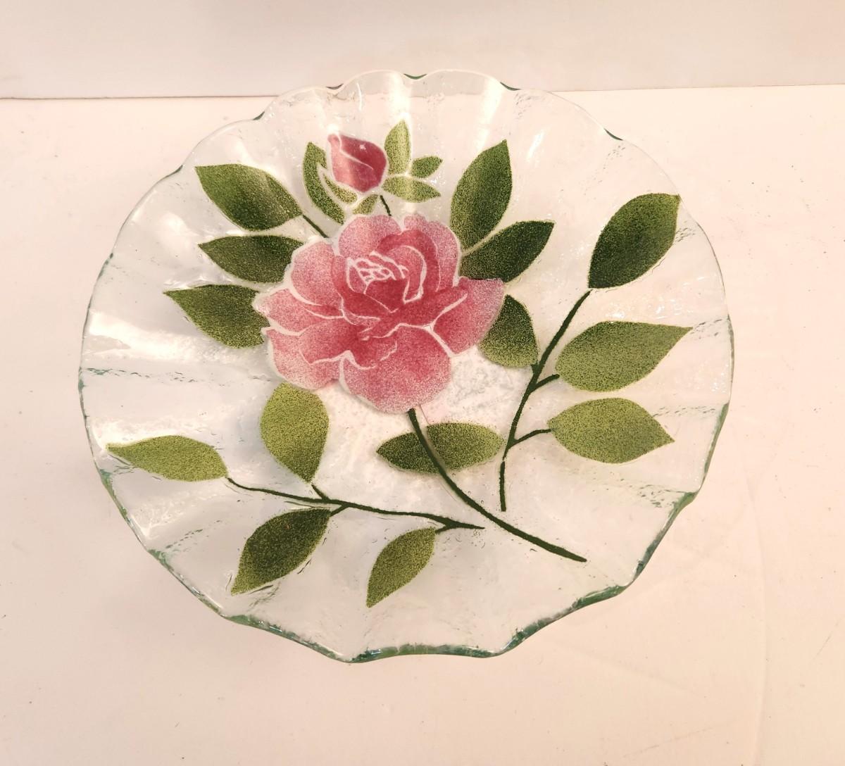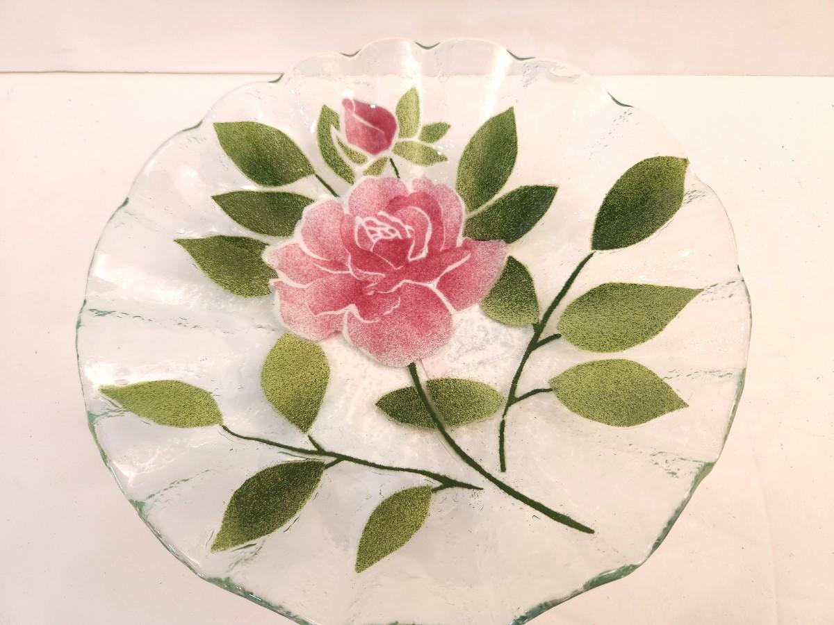 Pretty vintage Sydenstricker cased glass plate - rose motif. 7.75" across, 1.5" tall.