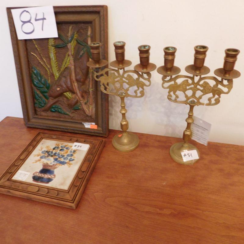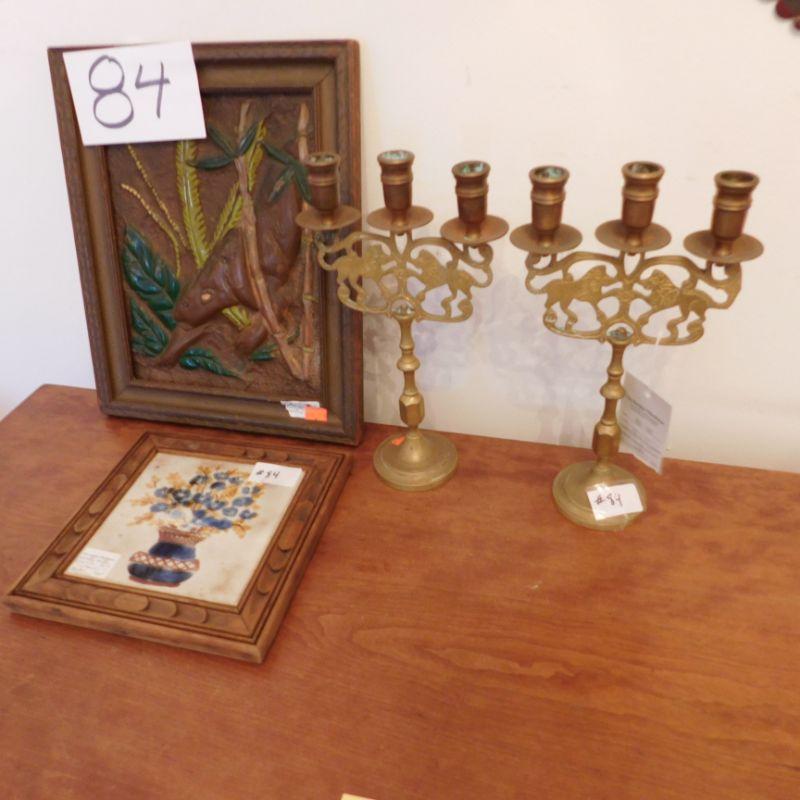 Lot 84 vintage framed tile in vintage copper picture/painting and a pair of Chinese brass candlesticks