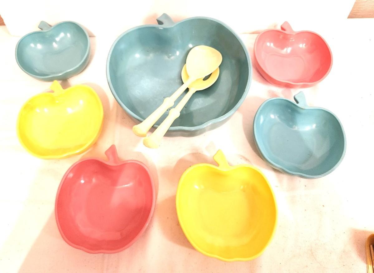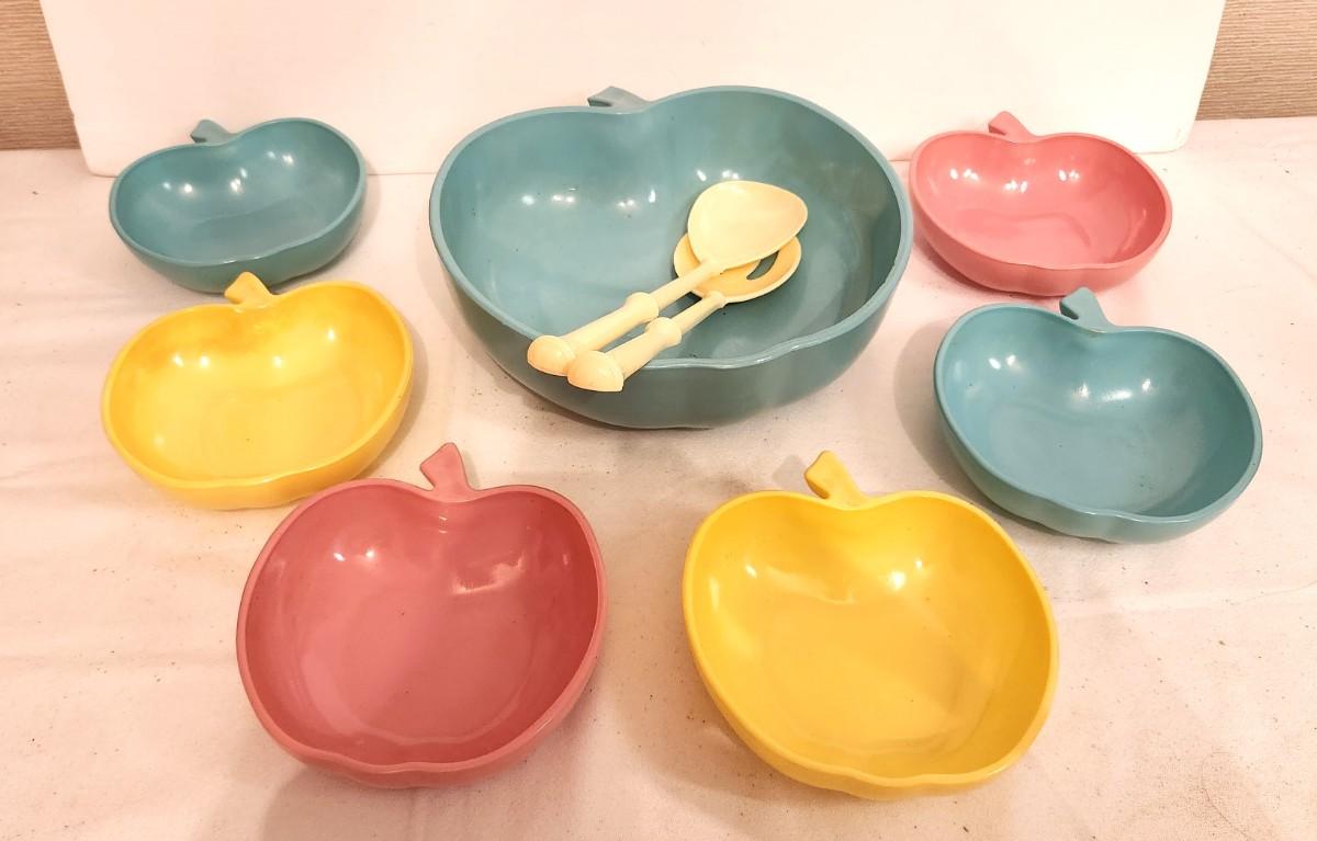 Scarce Vintage Hazel Atlas Orchard Ware salad set with implements - in ORIGINAL box. Attic find! Rarely seen complete with implements. 10" Serving bow with 6 matching salad bowls. Excellent, unused condition.