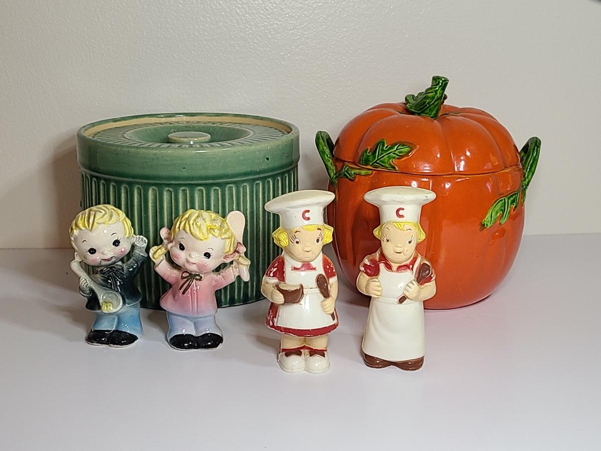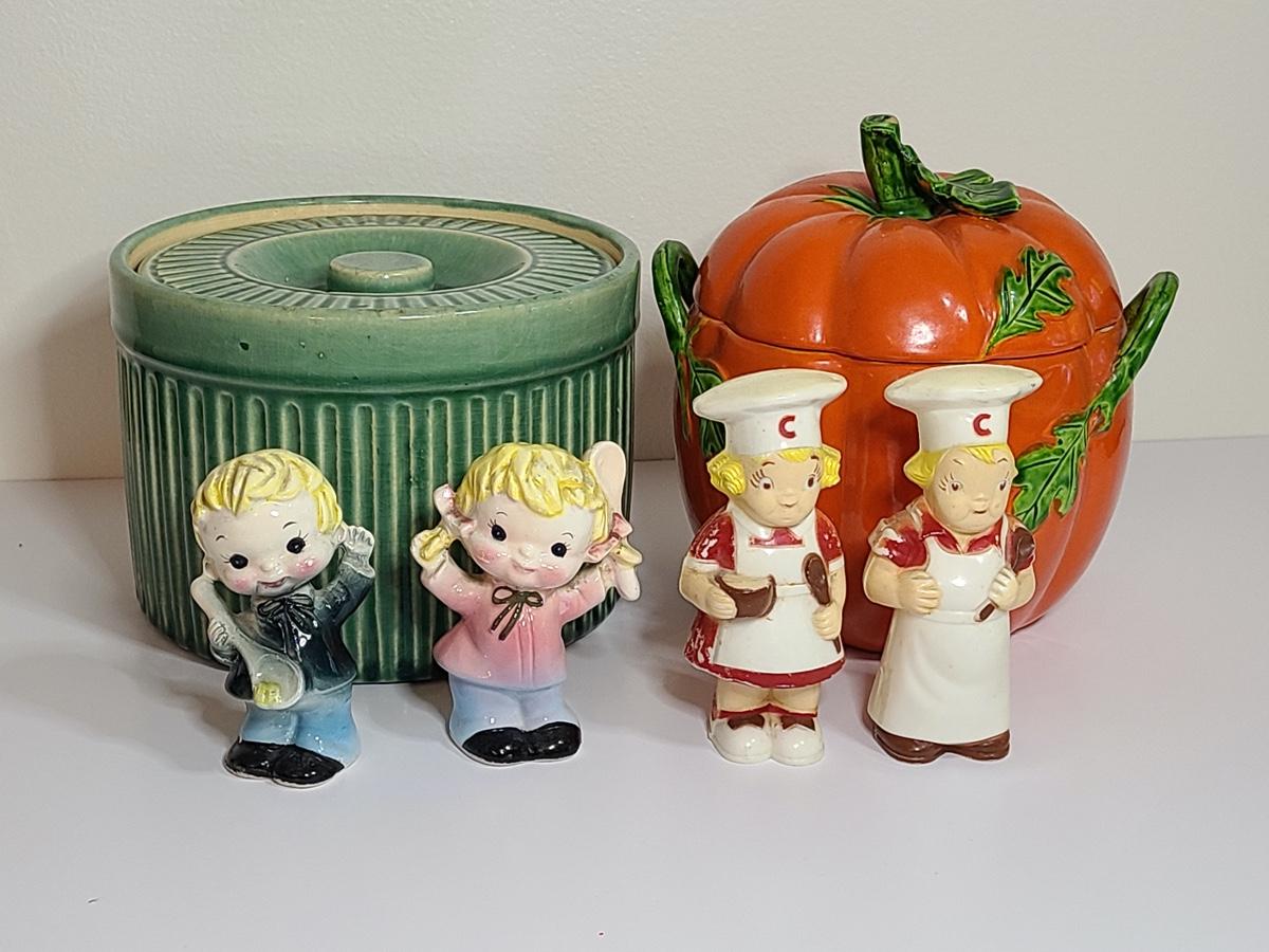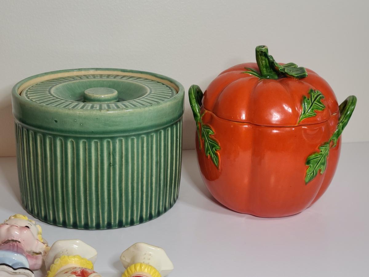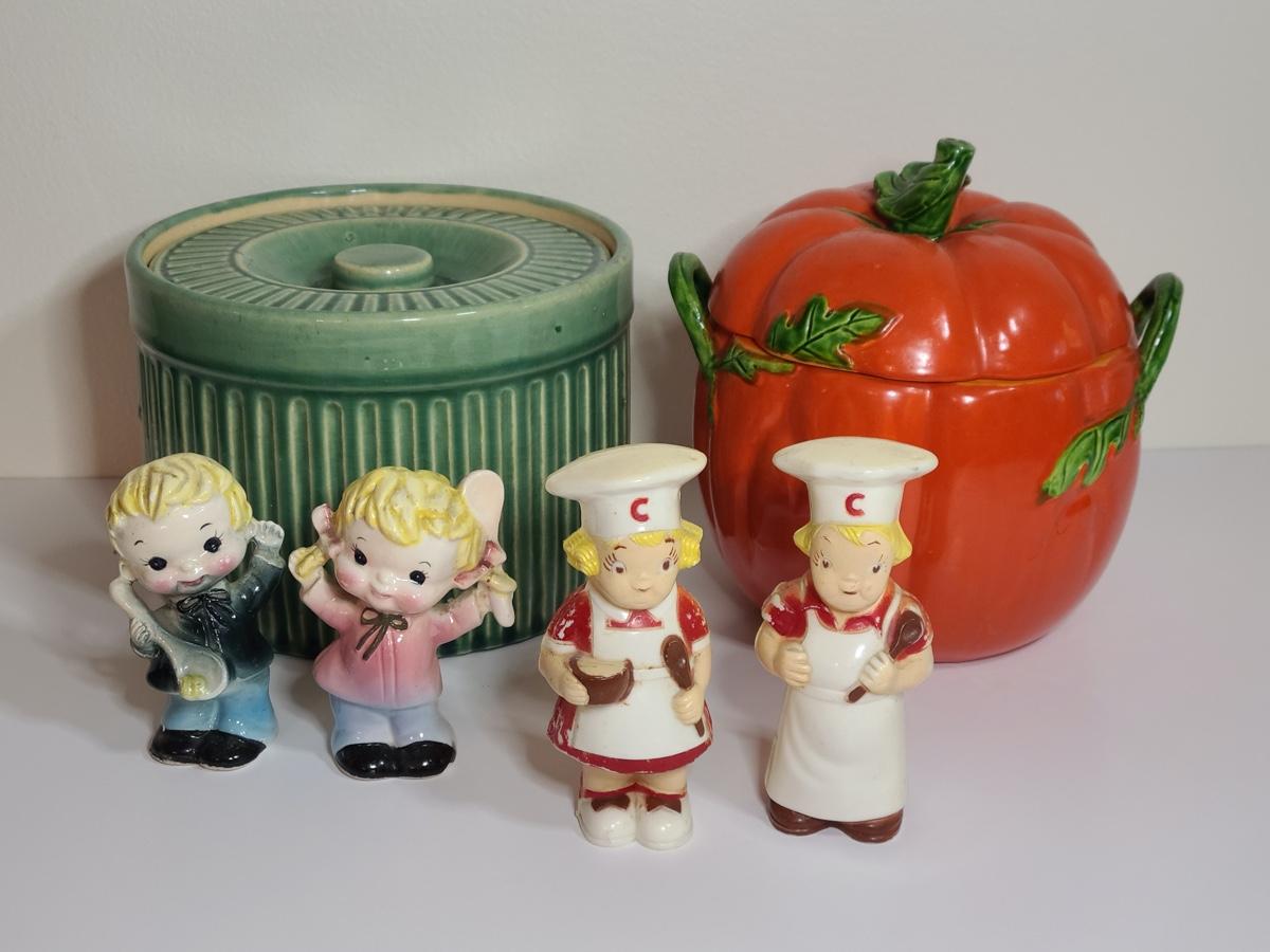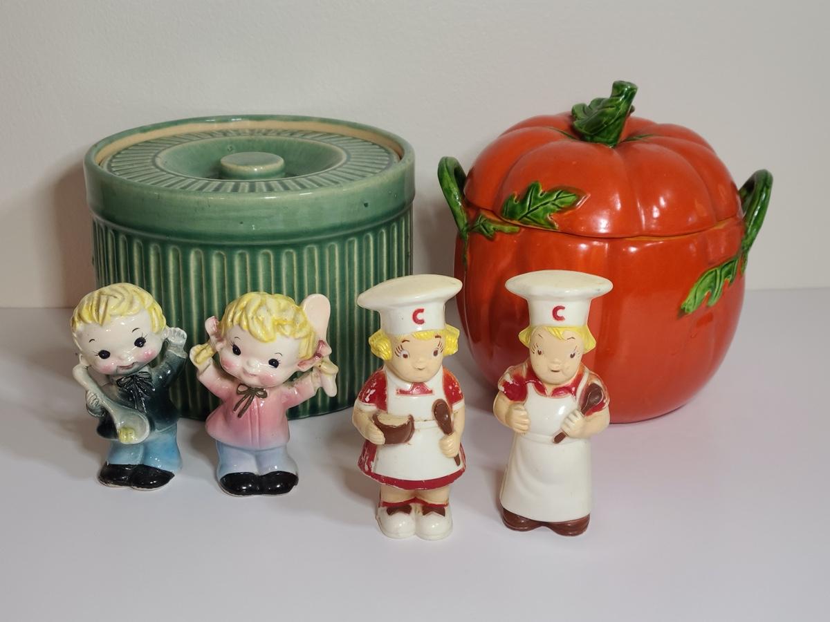 Lot 84: Vintage Kitchen Pottery Canister, Tomato Canister & Salt/Peppers