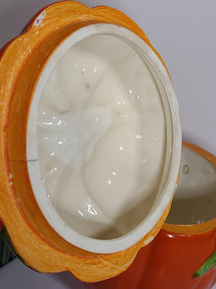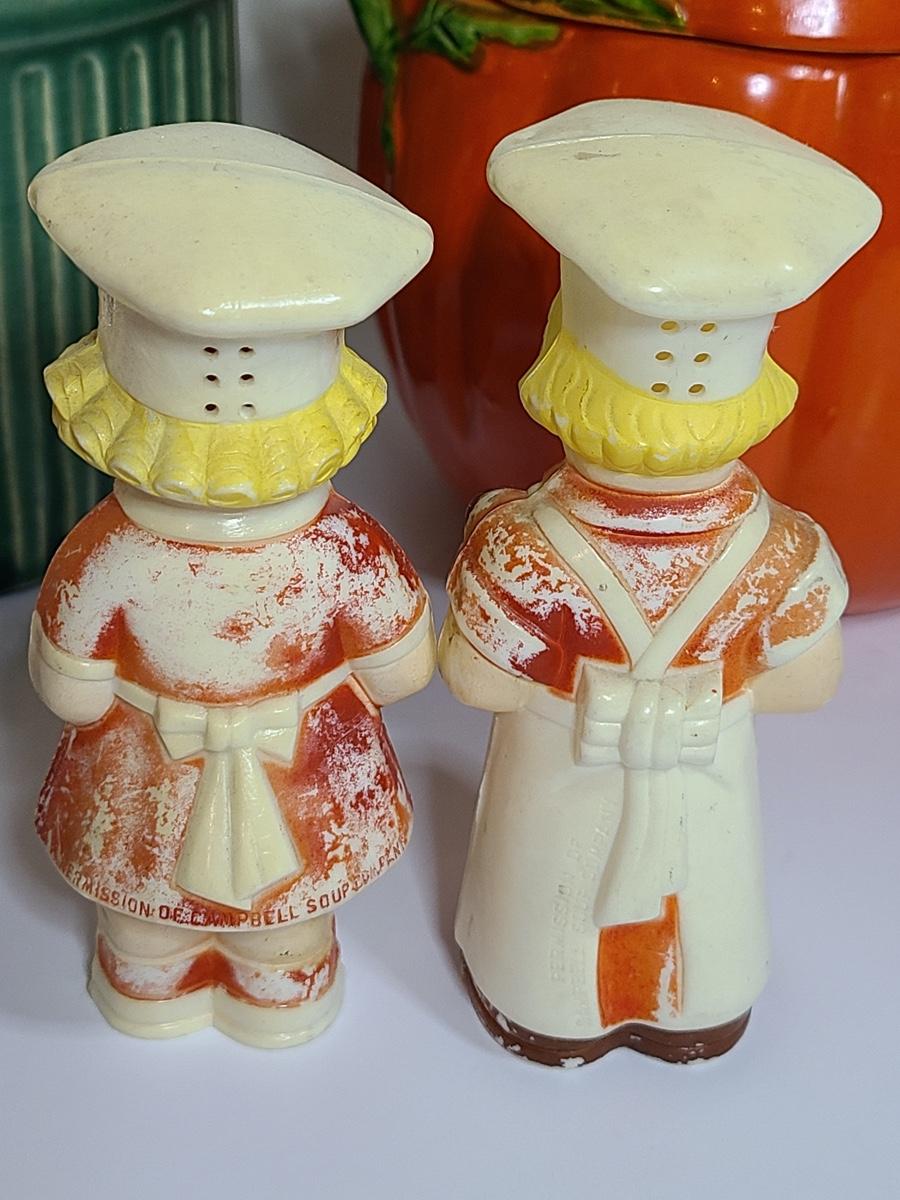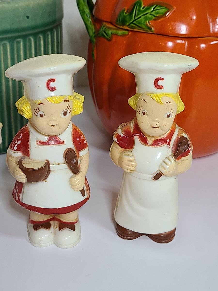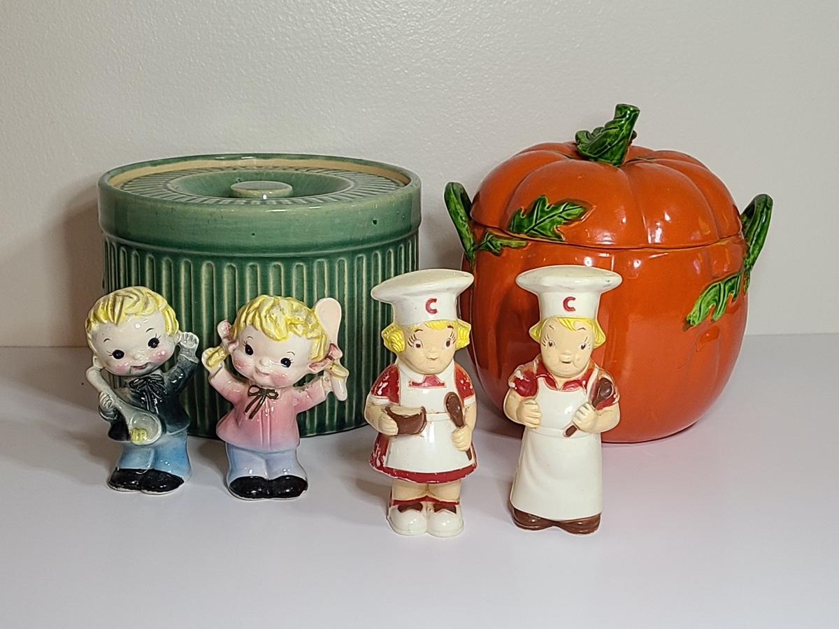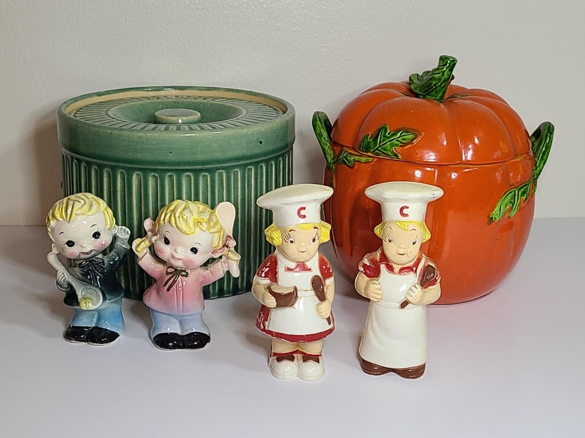 Lot 84: Vintage Kitchen Pottery Canister, Tomato Canister & Salt/Peppers