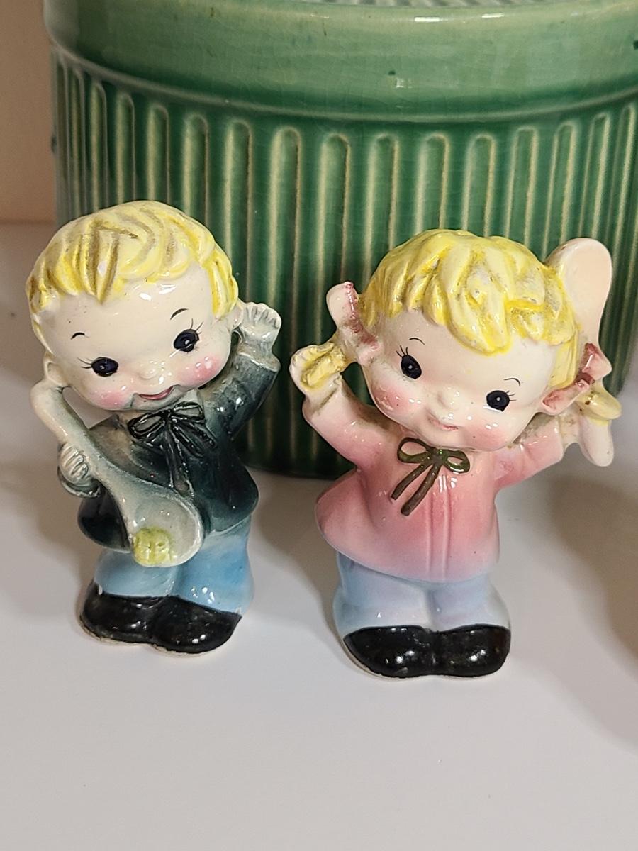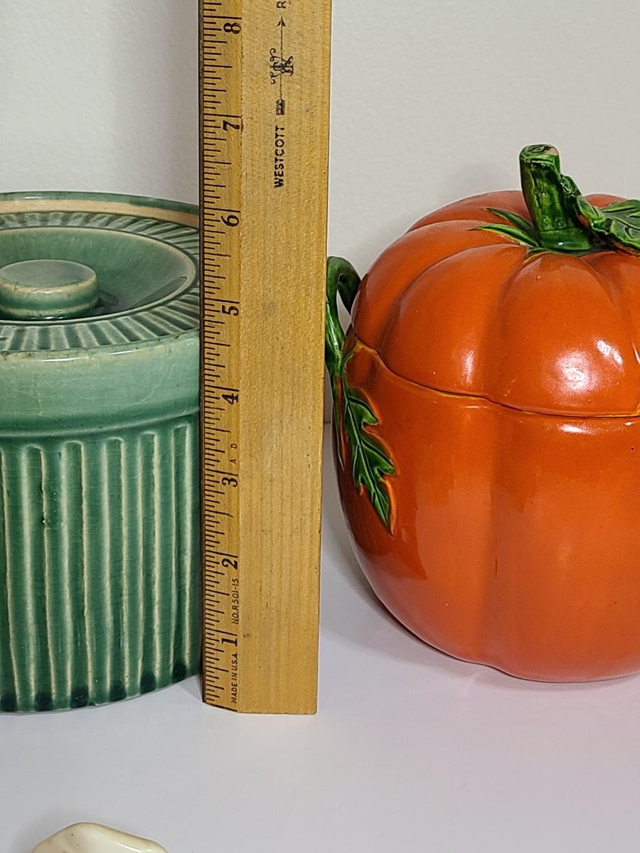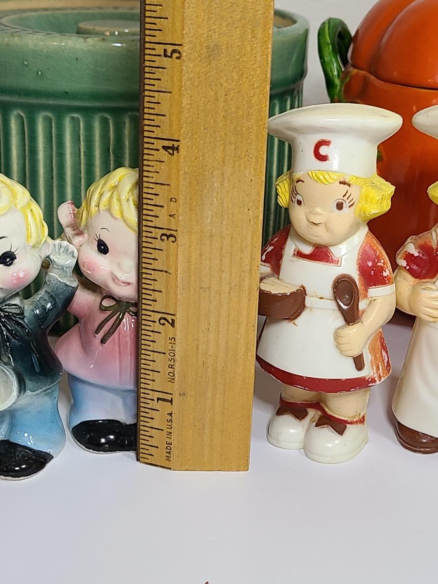Fun lot of vintage kitchen items including: two sets of salt and pepper shakers, a ceramic tomato canister, and a green lidded pottery canister! Please see all pictures as they are the best representation of the items. The pictures show condition, measurements if taken, and what is included in the lot. Due to the large amount that we photograph and the time frame, we are not always able to take measurements. All items unless noted, are pre-owned and have been used. If you purchased furniture, you must bring help. We do not allow one person to carry large furniture out on their own. Bring help, tools and a truck for the safety of our client’s homes, and your personal safety. Company policy. Thank you.