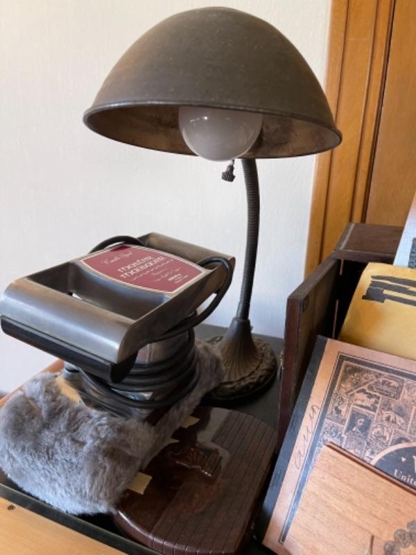 Lot 84. Vintage men’s collectables“”chess games, backgammon, metal in box, drafting tools, bras vintage lamp (1930s), nerve stimulator, vintage massager, mid-century cheese board--$50
