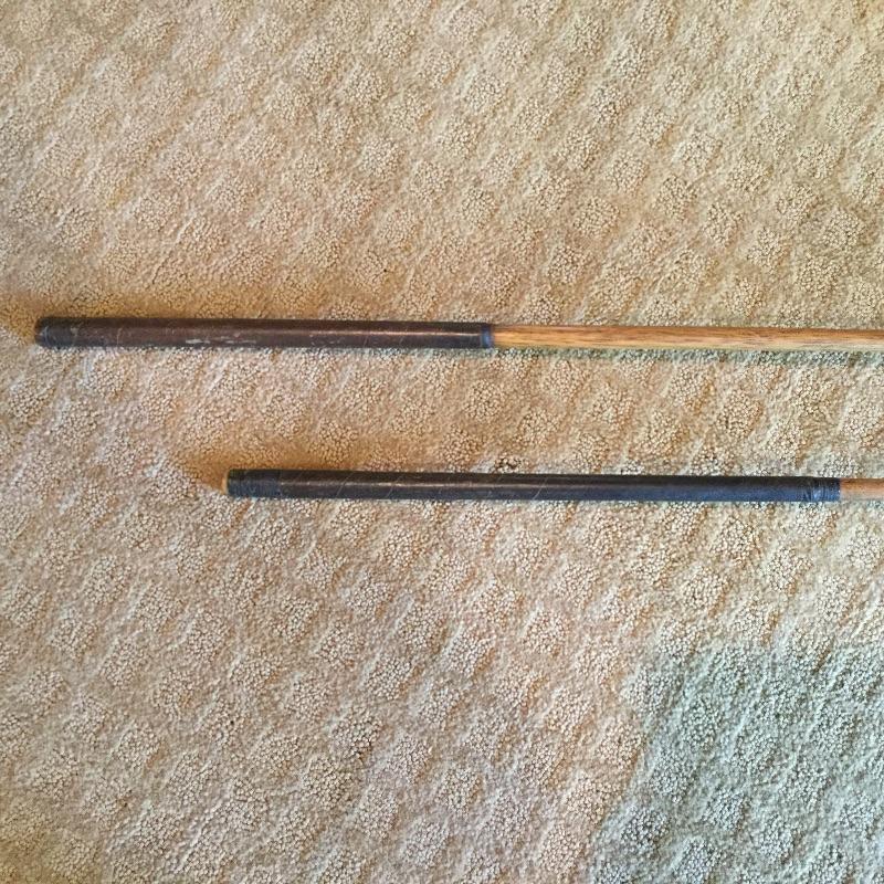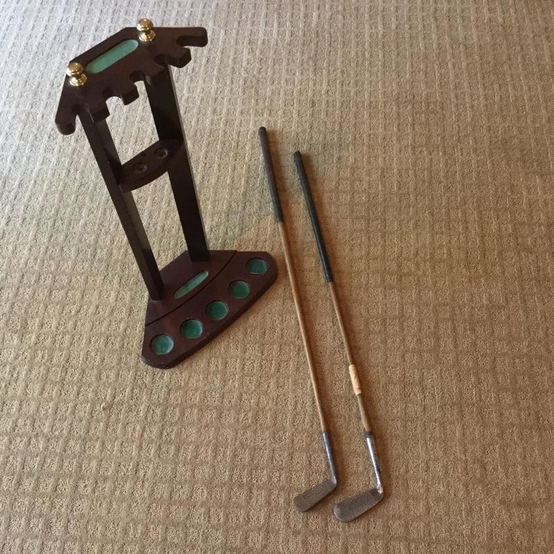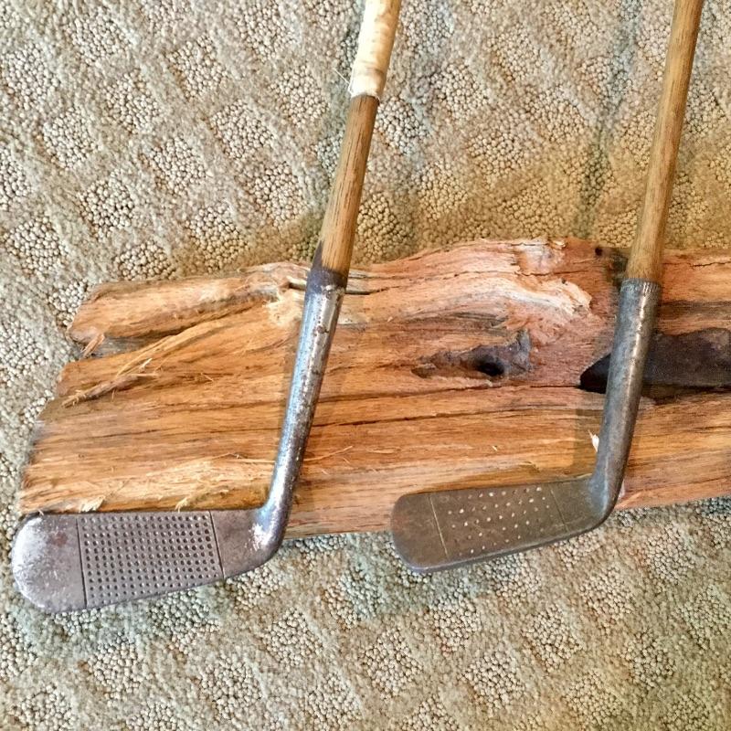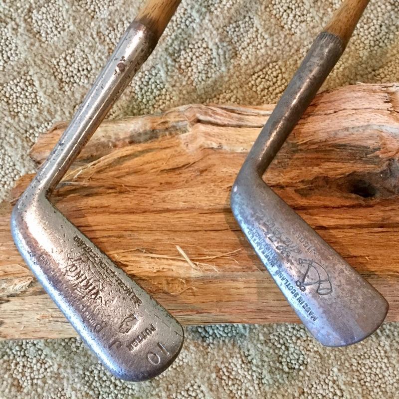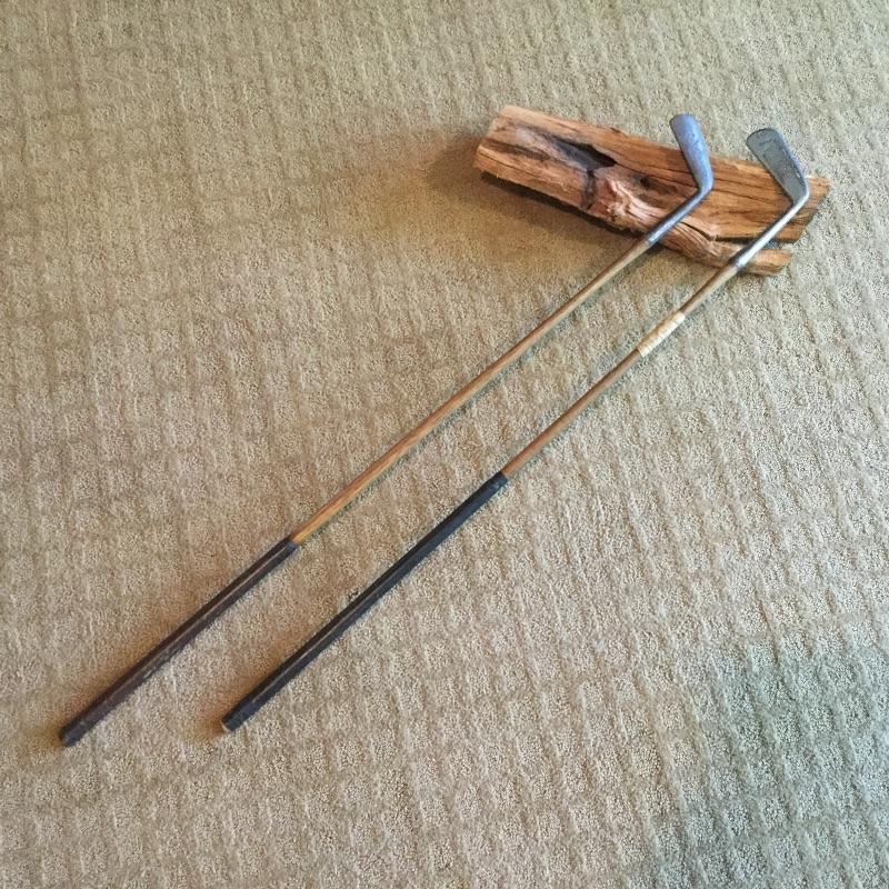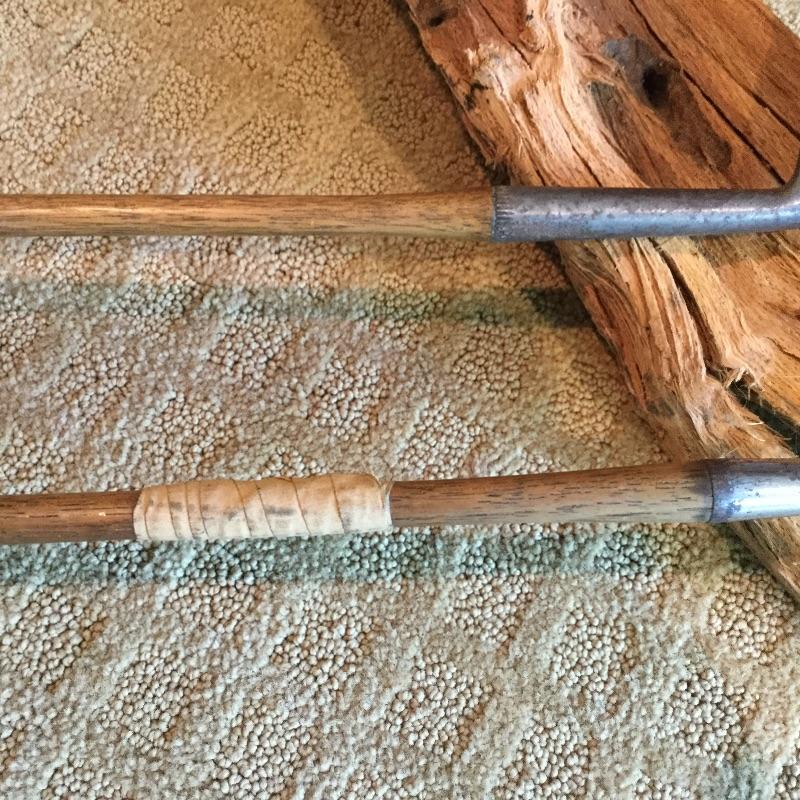Two Vintage Hand Forged Putters With Solid Wooden Shafts and Leather Wrapped Grips.