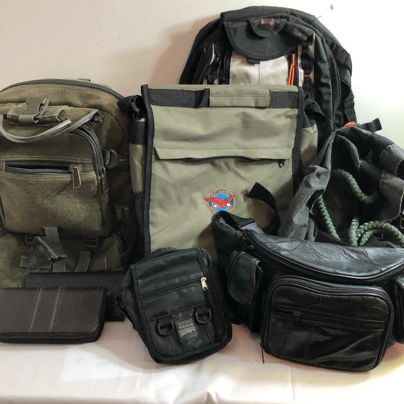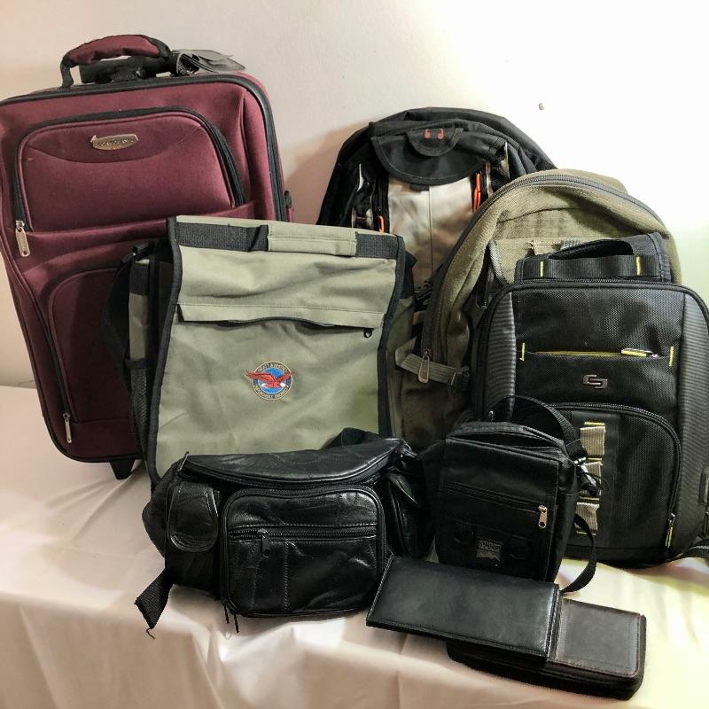 Everything from wallets to a rolling travel bag, this lot has a size for every outing. The Concord dark red travel bag has the retractable handle and wheels. There are 3 backpacks from Granite Canyon, and Lijiebao, and Solo and various bags and wallets and more, See images.