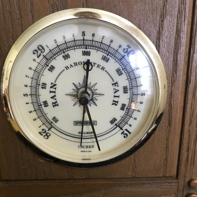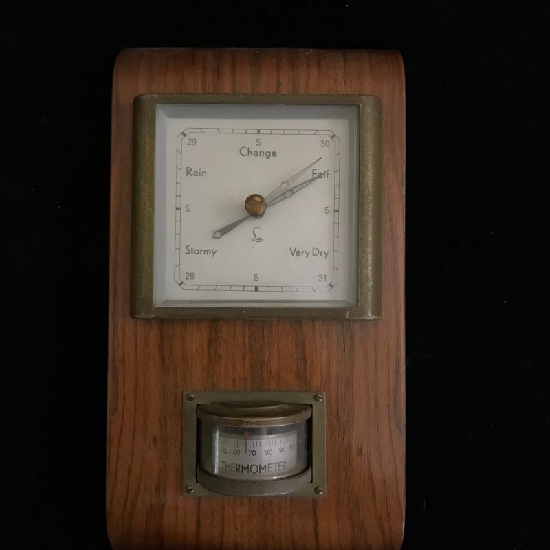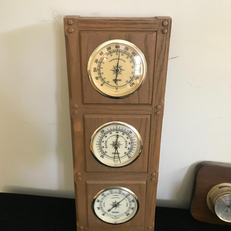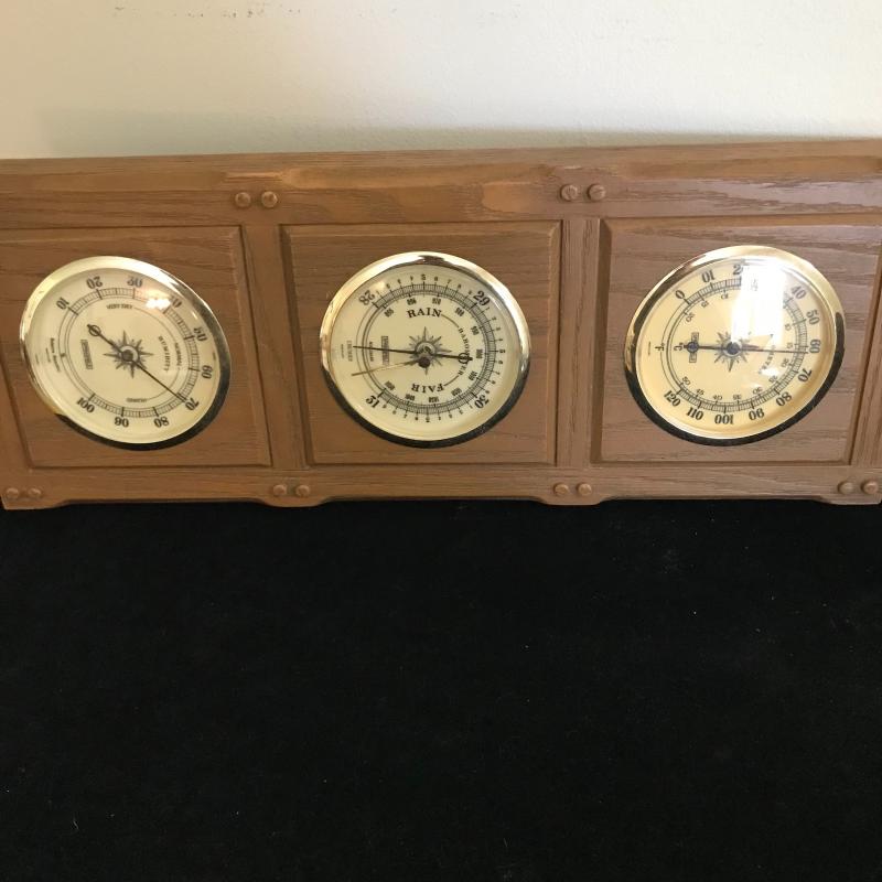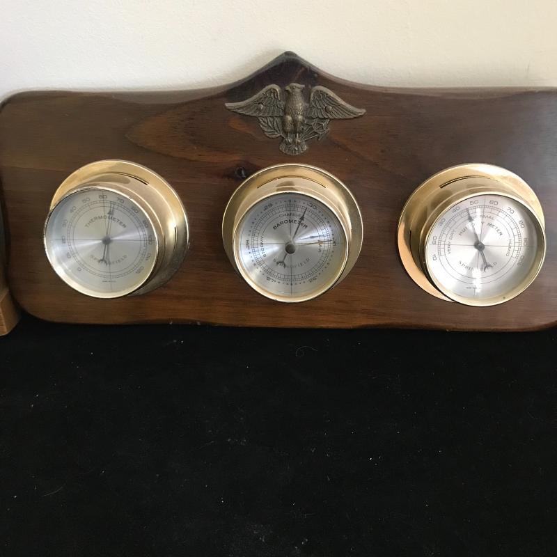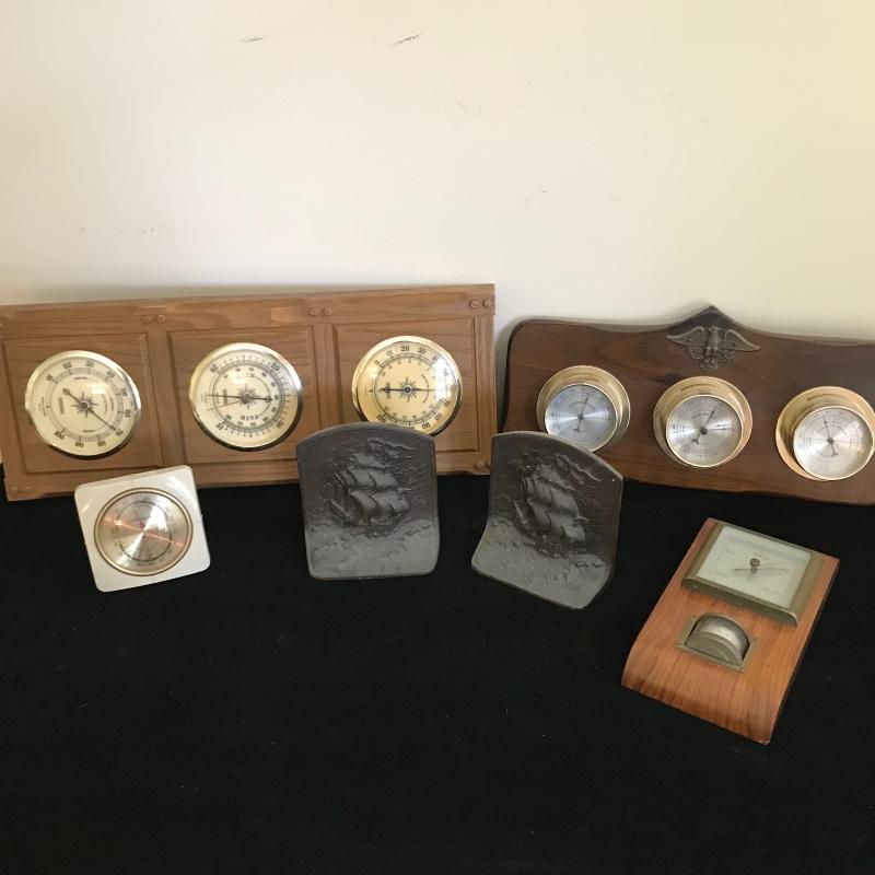 Lot includes four different thermometer/barometers. Two are plastic, two are wood. Largest is plastic and approx. 20” x 8”. Lot also includes heavy copper ship bookends. See pics. Shipping available or local pickup in Hendersonville, NC.