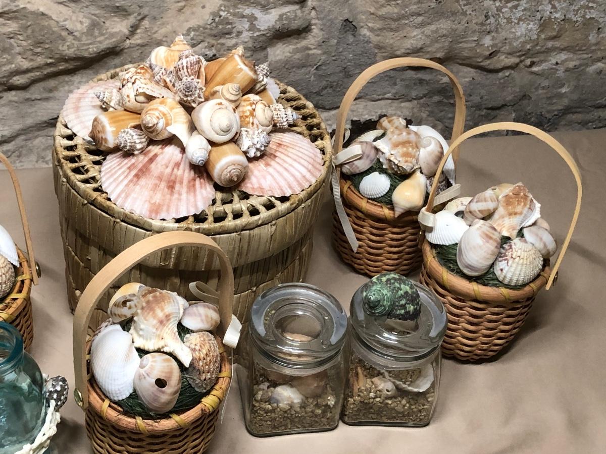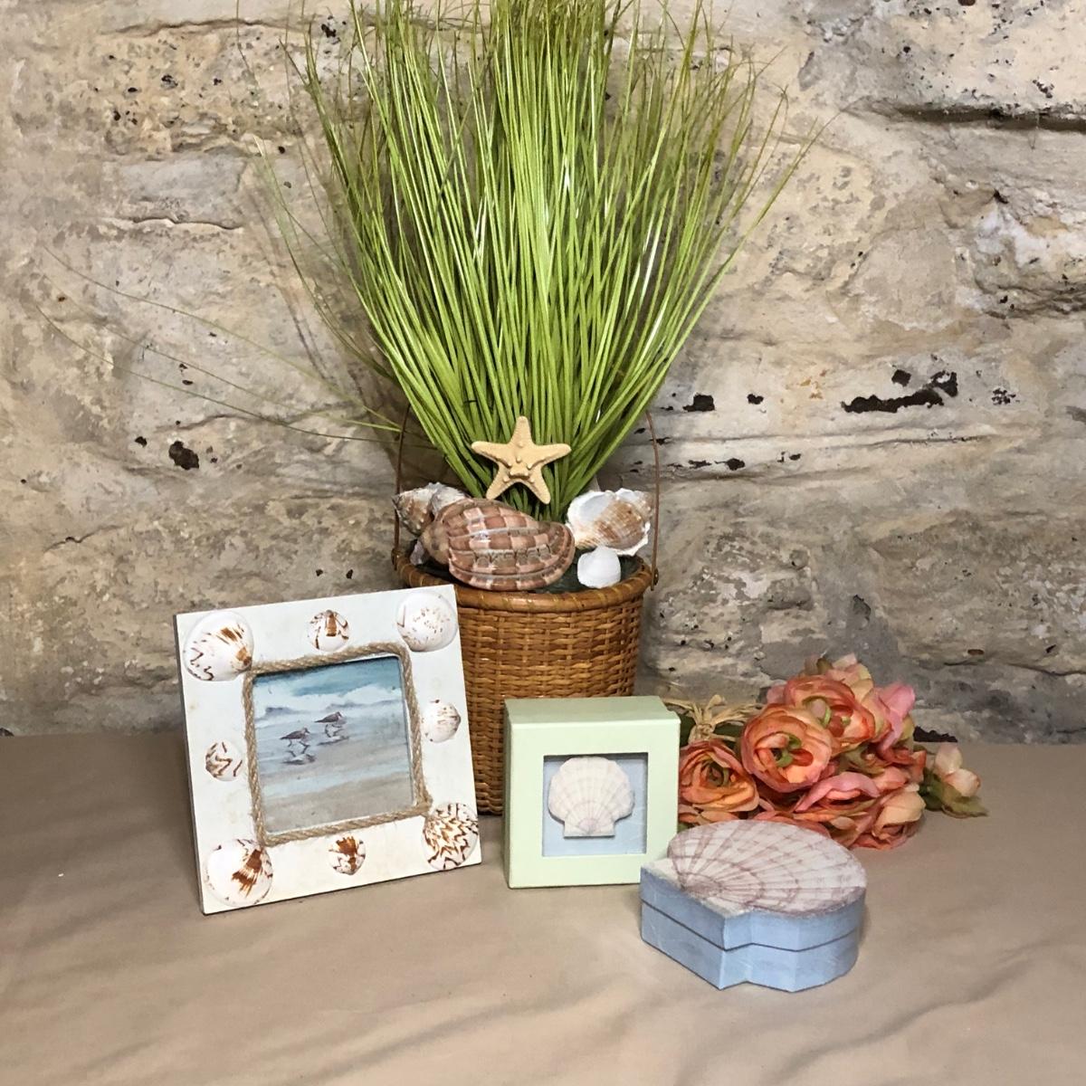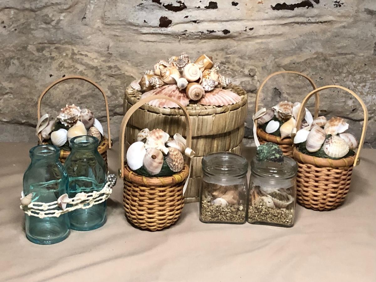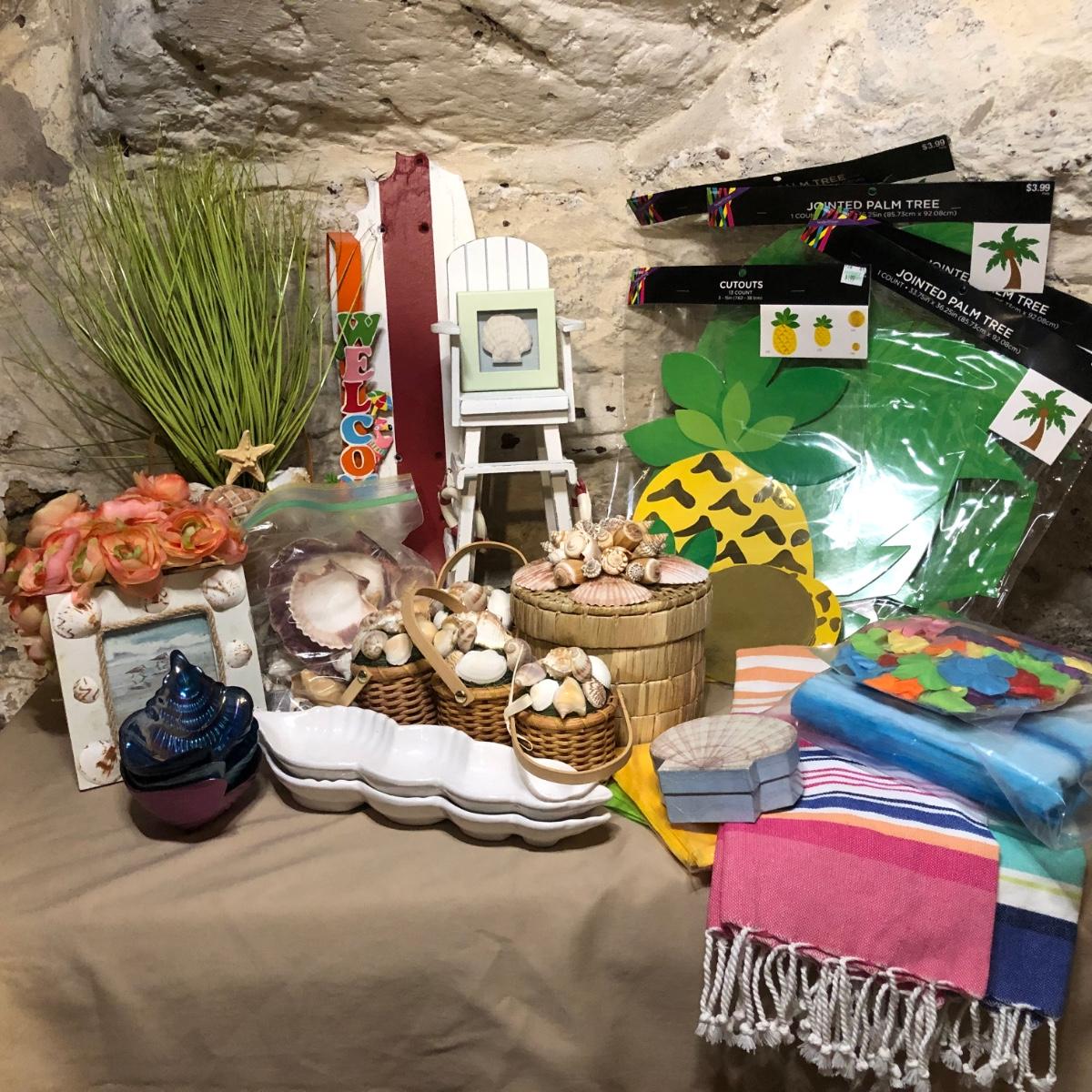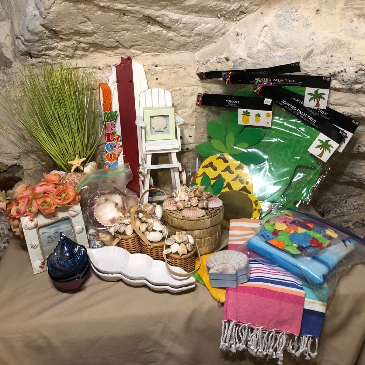A collection of summer and beach themed decorations. Includes ND Hand Painted shell dishes, shell topped baskets, table cloths, wall hangings, a miniature lifeguard chair and more.