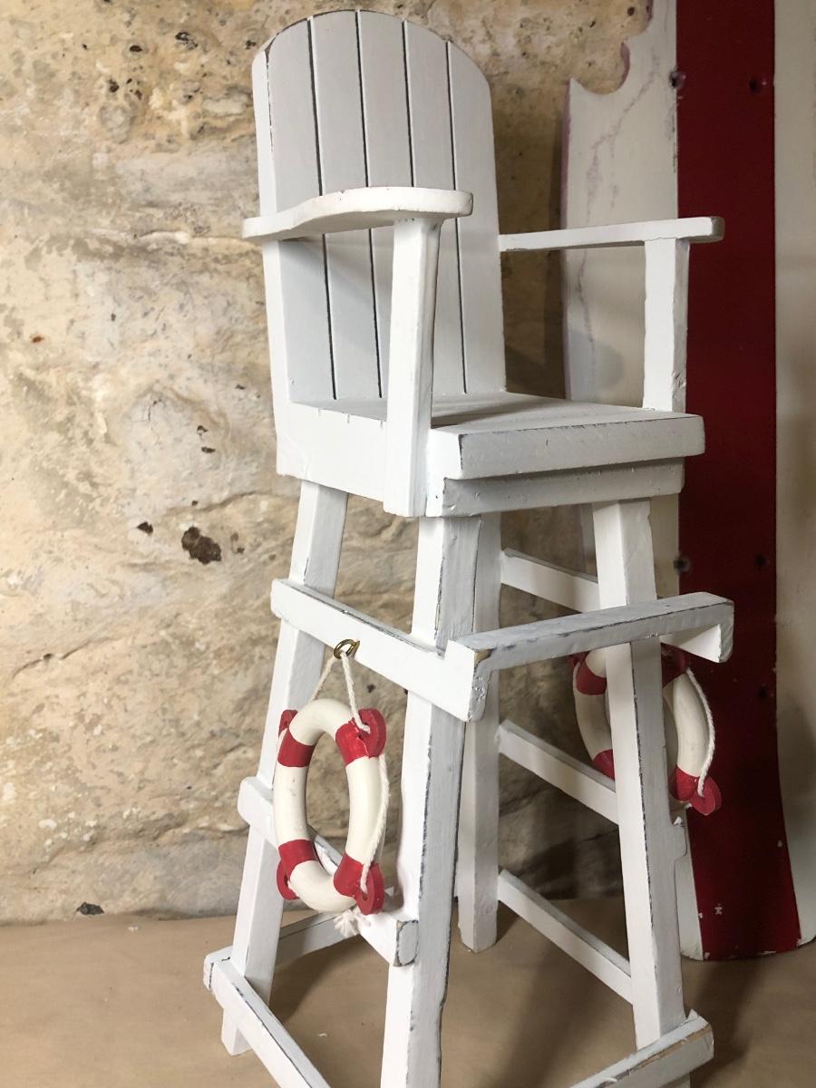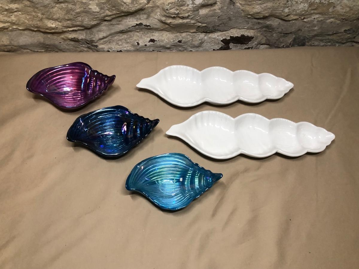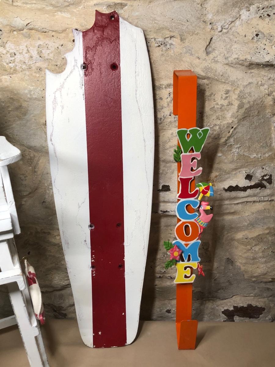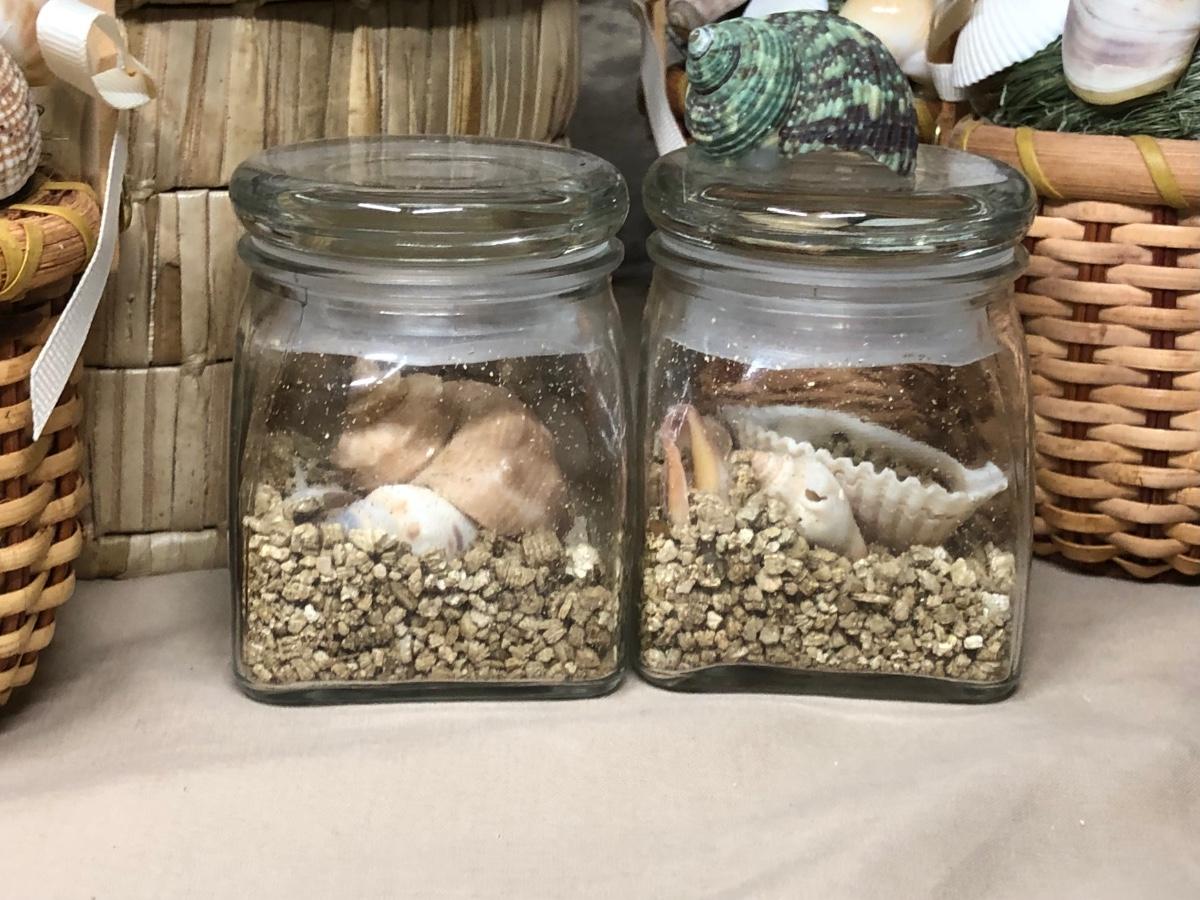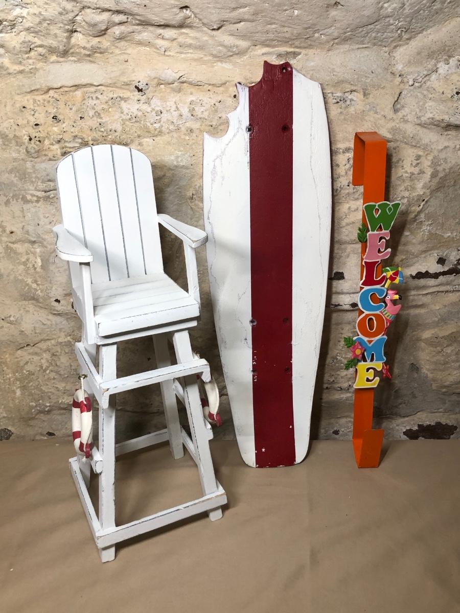 A collection of summer and beach themed decorations. Includes ND Hand Painted shell dishes, shell topped baskets, table cloths, wall hangings, a miniature lifeguard chair and more.