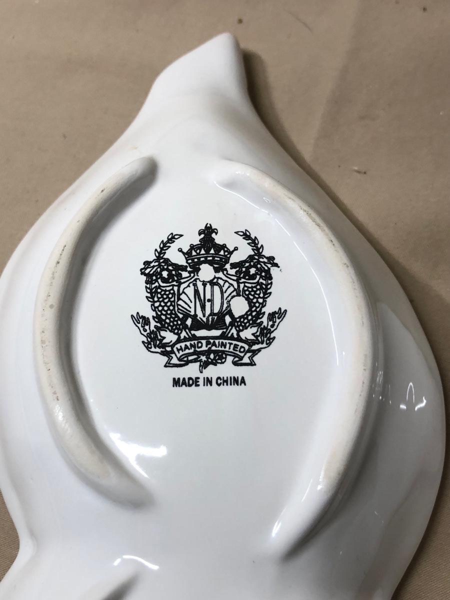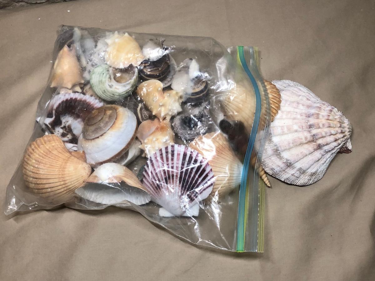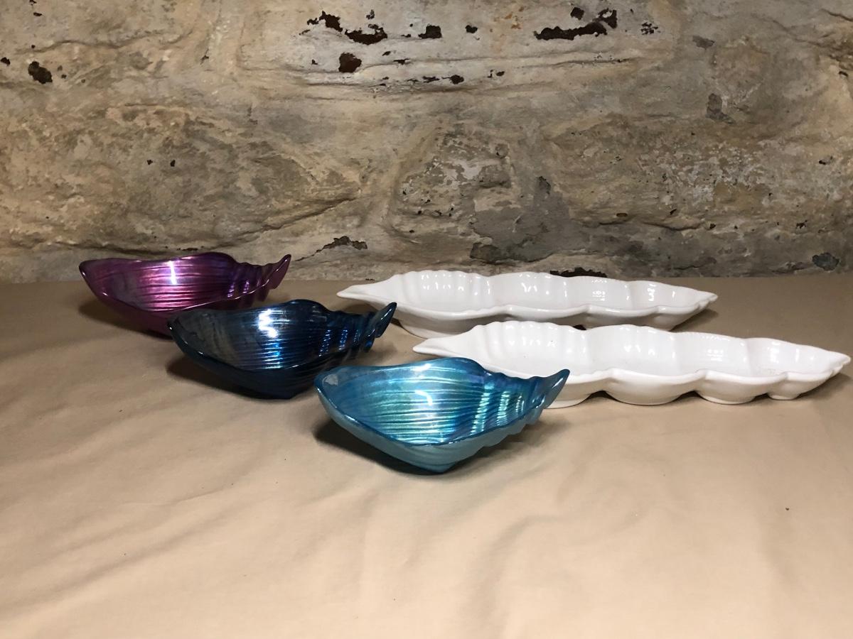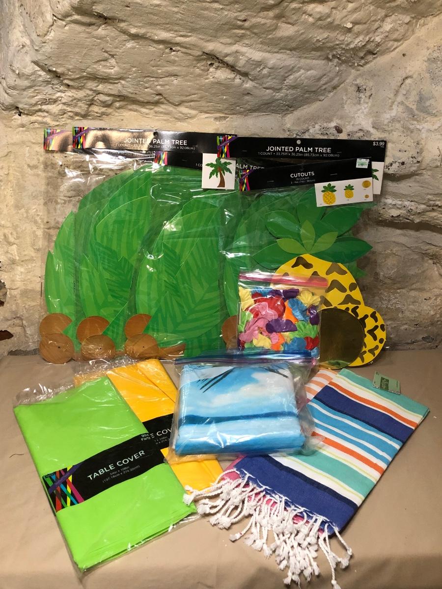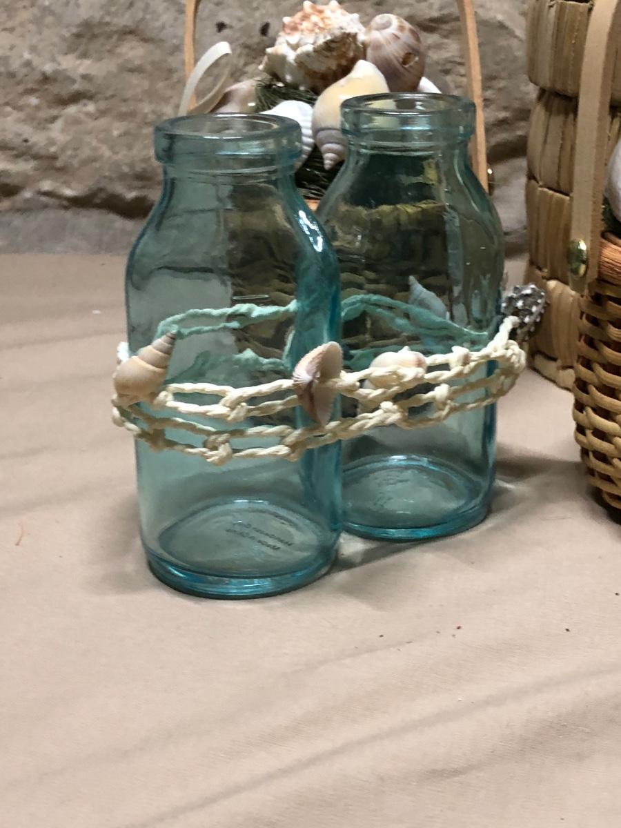 A collection of summer and beach themed decorations. Includes ND Hand Painted shell dishes, shell topped baskets, table cloths, wall hangings, a miniature lifeguard chair and more.
