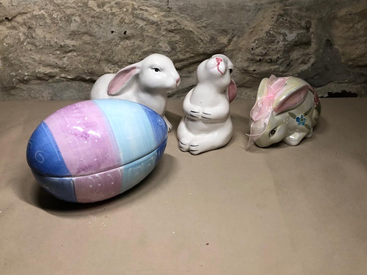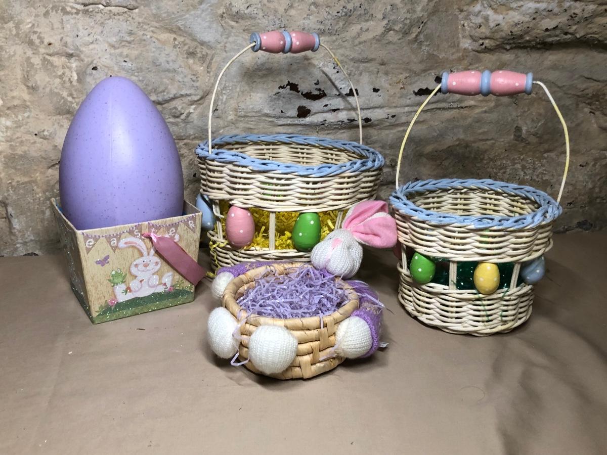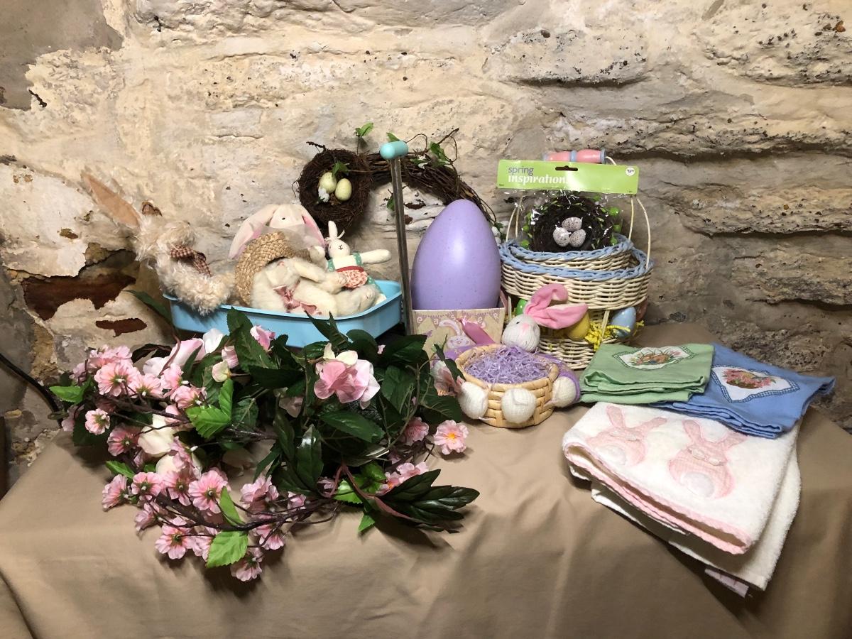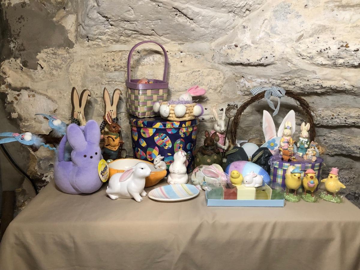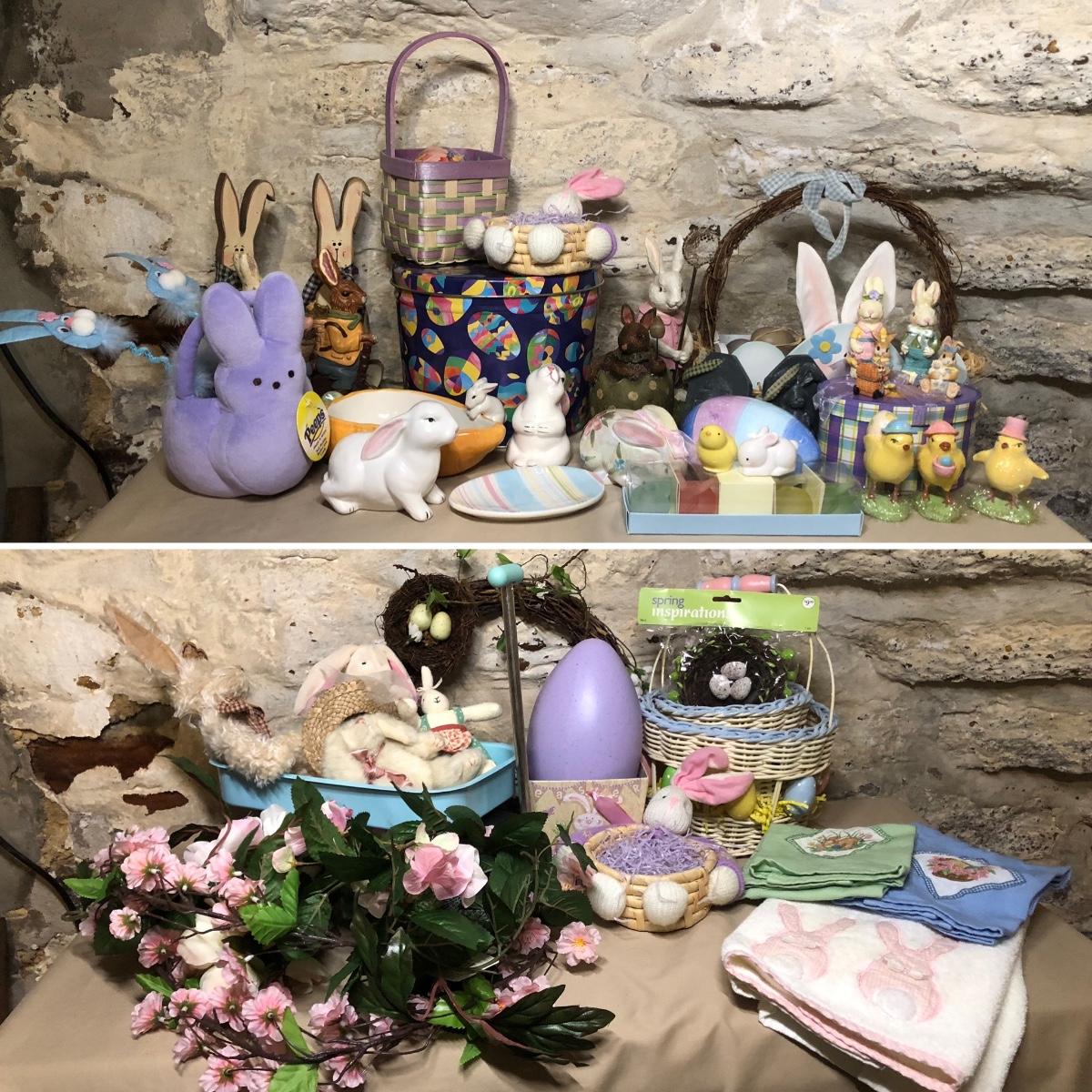 A collection of spring and Easter themed decorations. Includes bunnies, hand towels, Easter baskets, ceramics and more.