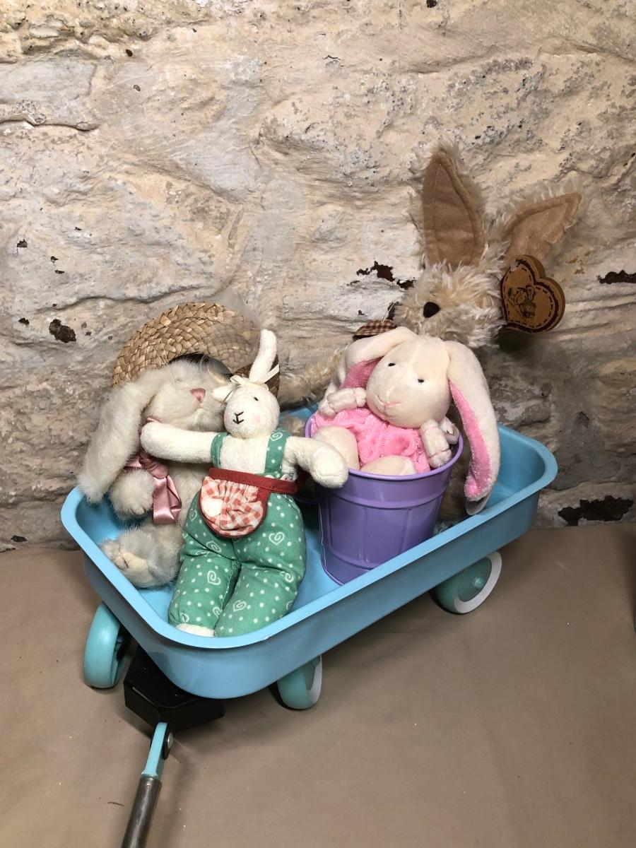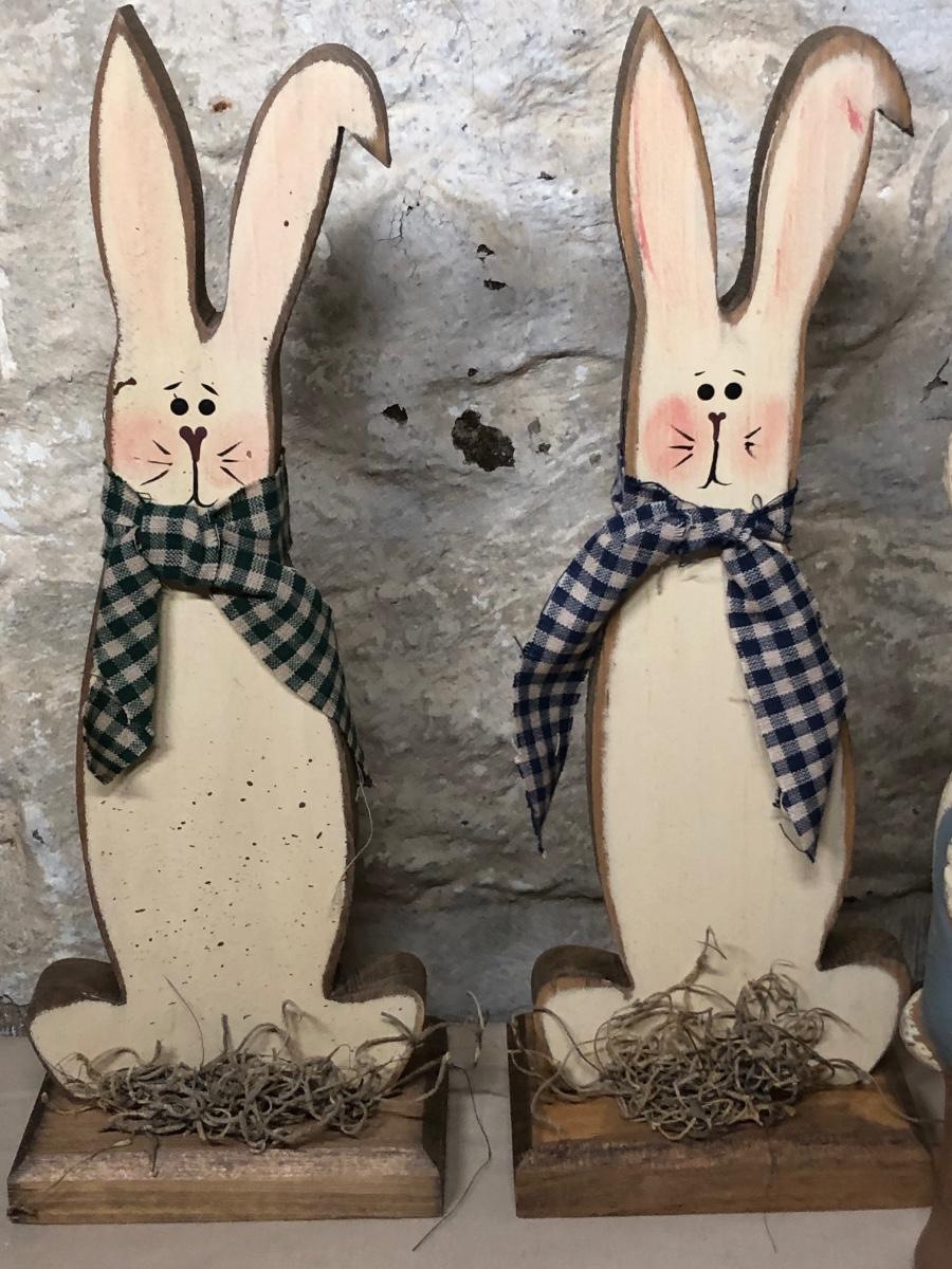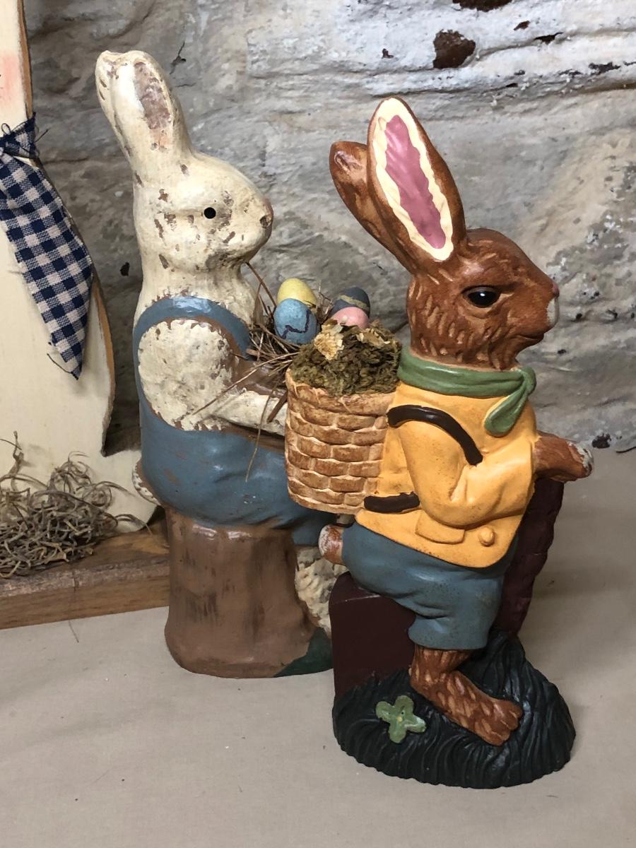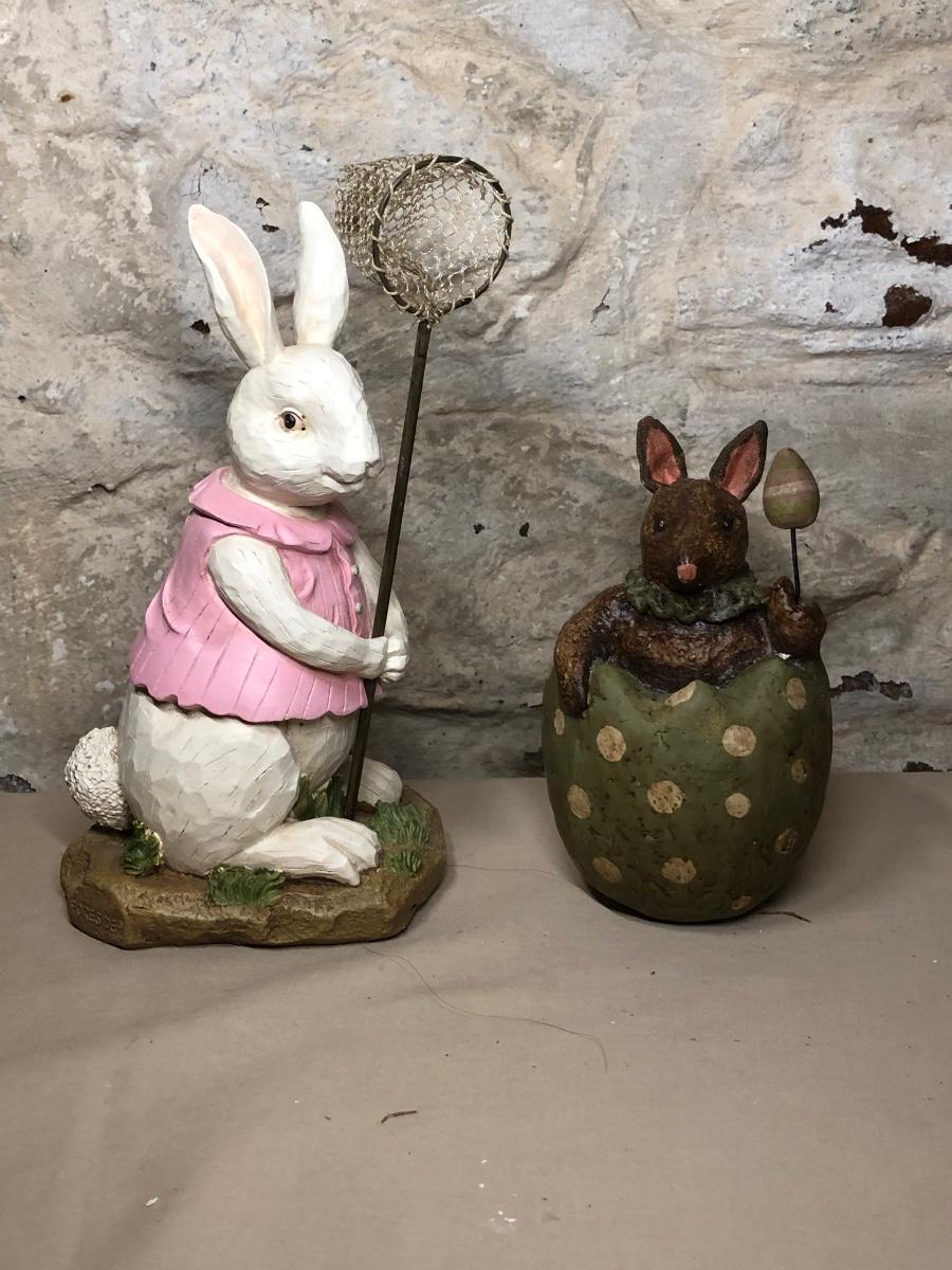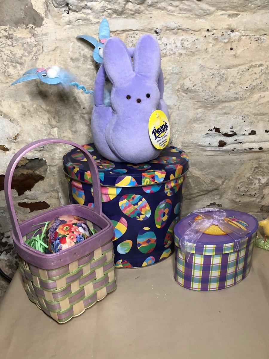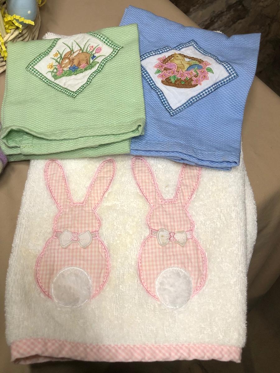 A collection of spring and Easter themed decorations. Includes bunnies, hand towels, Easter baskets, ceramics and more.