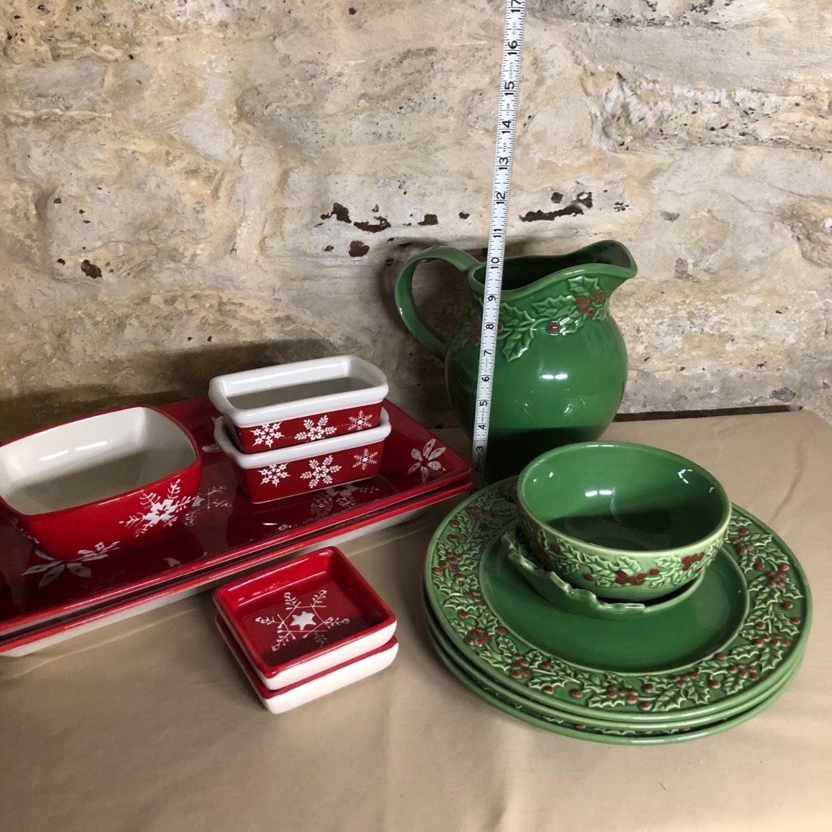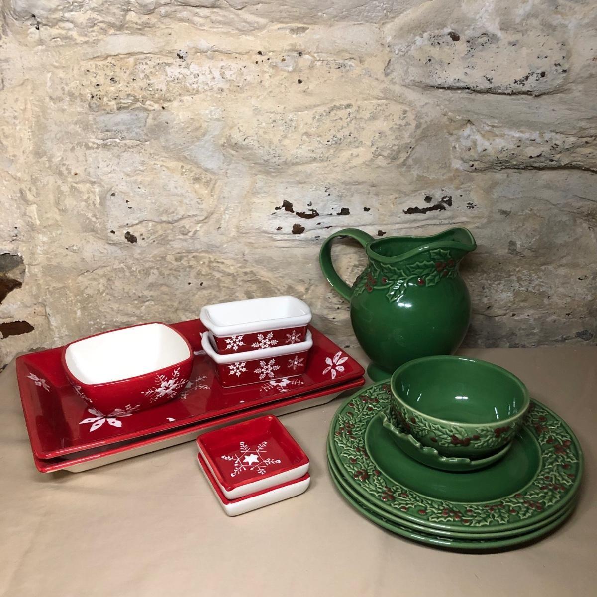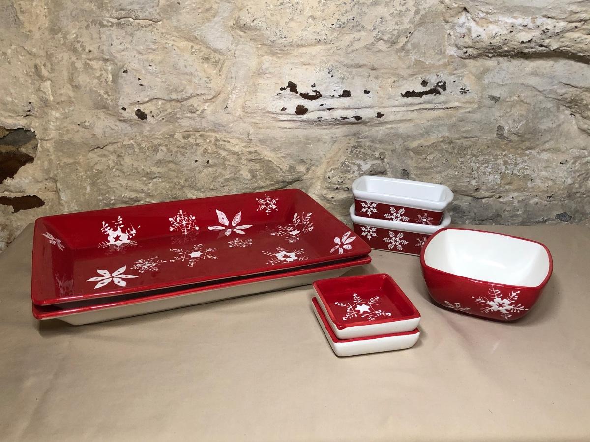 Sonoma set is green with a holly and berries design and includes three plates, a shallow dish, a bowl and a pitcher. ND set is red with a snowflake design and includes two serving trays, two shallow square dishes, a bowl, and two miniature loaf pans.