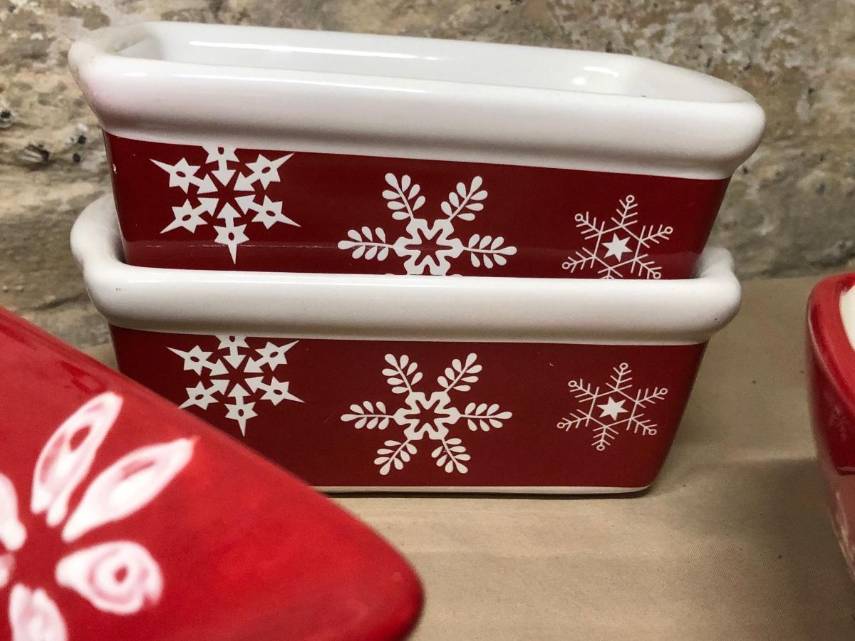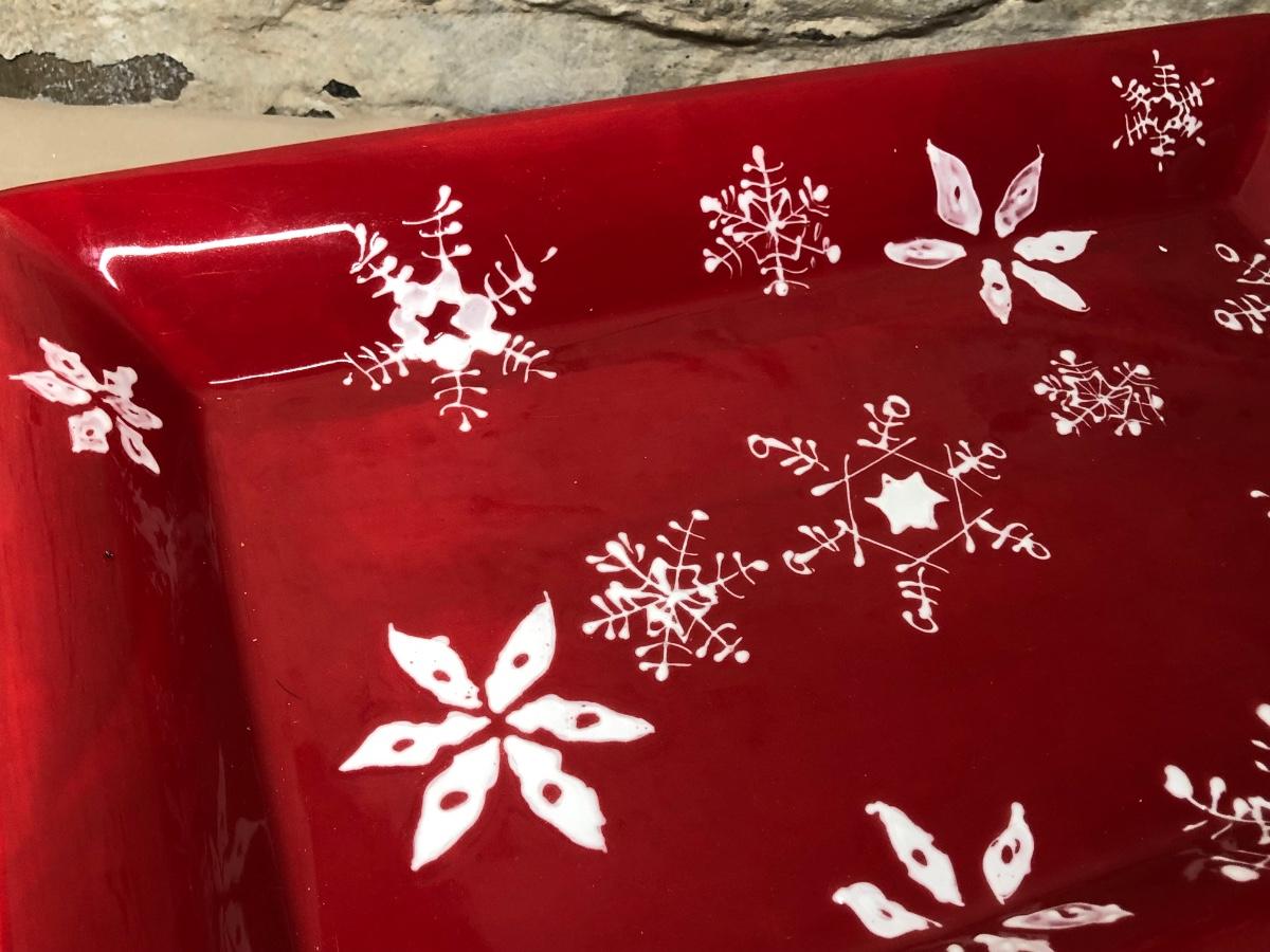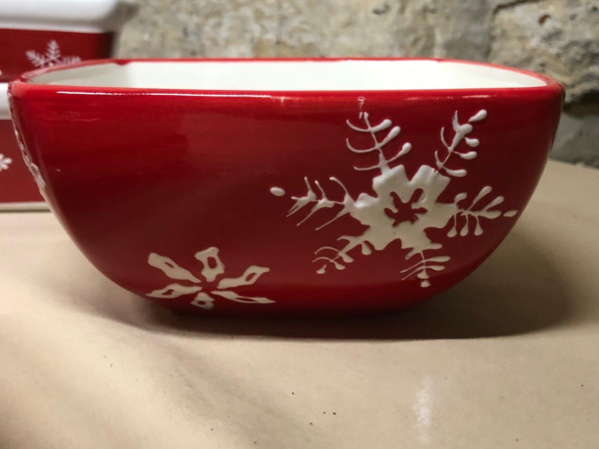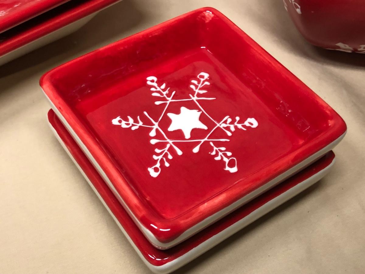 Sonoma set is green with a holly and berries design and includes three plates, a shallow dish, a bowl and a pitcher. ND set is red with a snowflake design and includes two serving trays, two shallow square dishes, a bowl, and two miniature loaf pans.