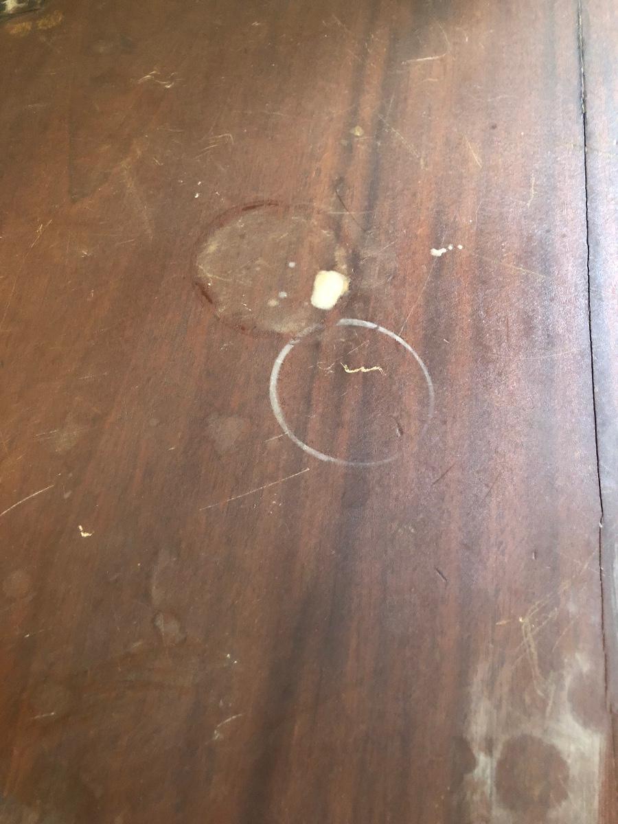 Includes a round table which tilts upwards for storage. Table is used with noticeable damage (see photos). Measures 29 inches in diameter and 29 inches tall when placed flat.