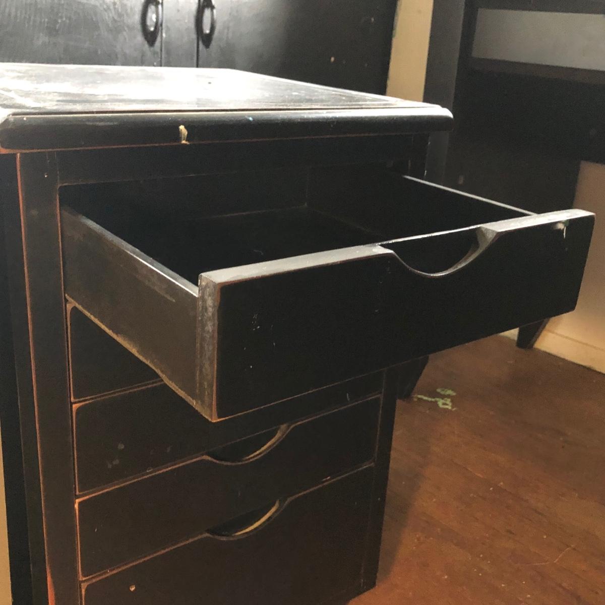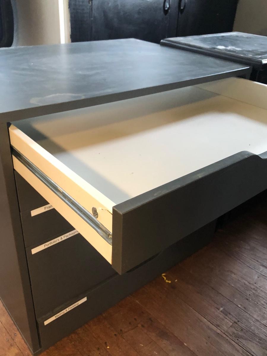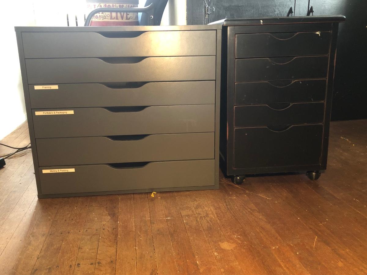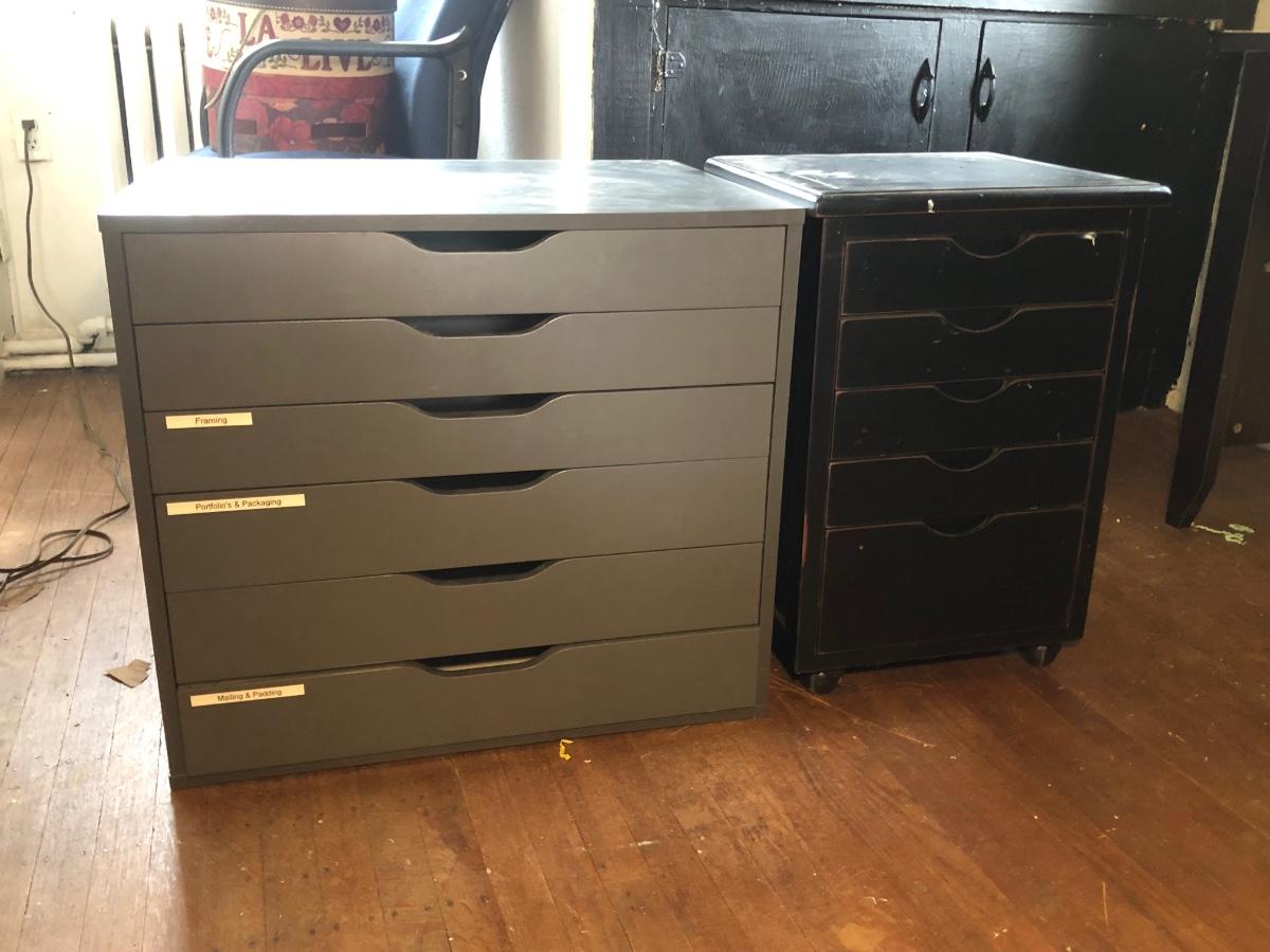 Two sets of drawers great for craft rooms. Condition is used (see photos). Grey drawers measure 26W x 19D x 23H. Black drawers are on wheels and measure 15W x 16D x 25H.