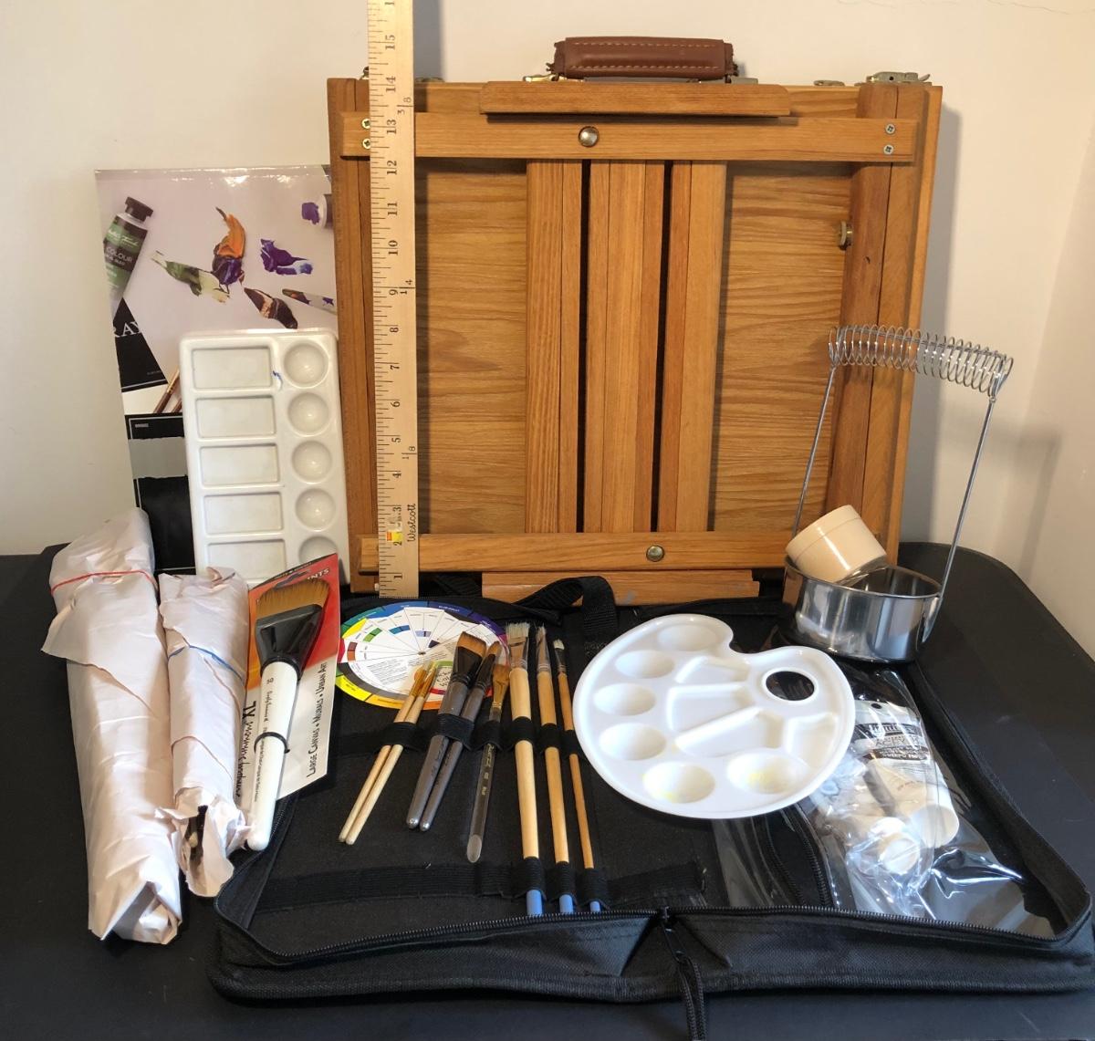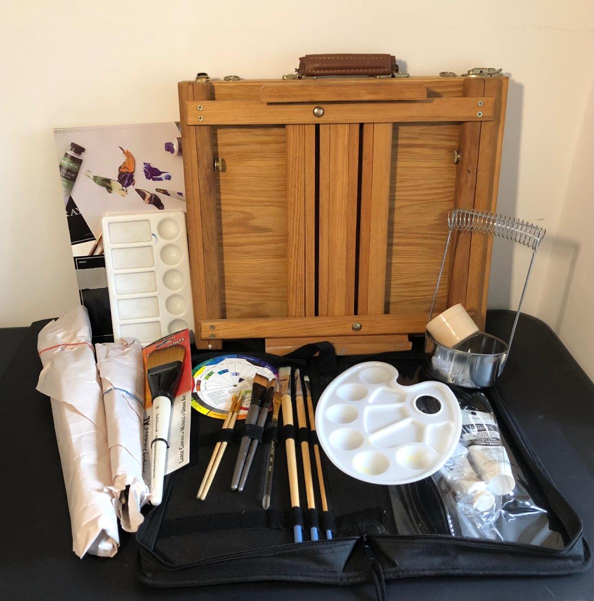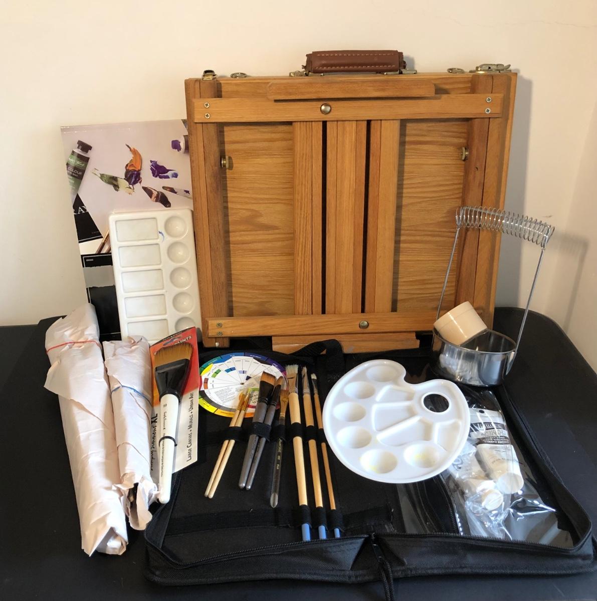 One foldable easel with a drawer. Includes various paint brushes, palettes, palette knives, and a brush cleaning tool.