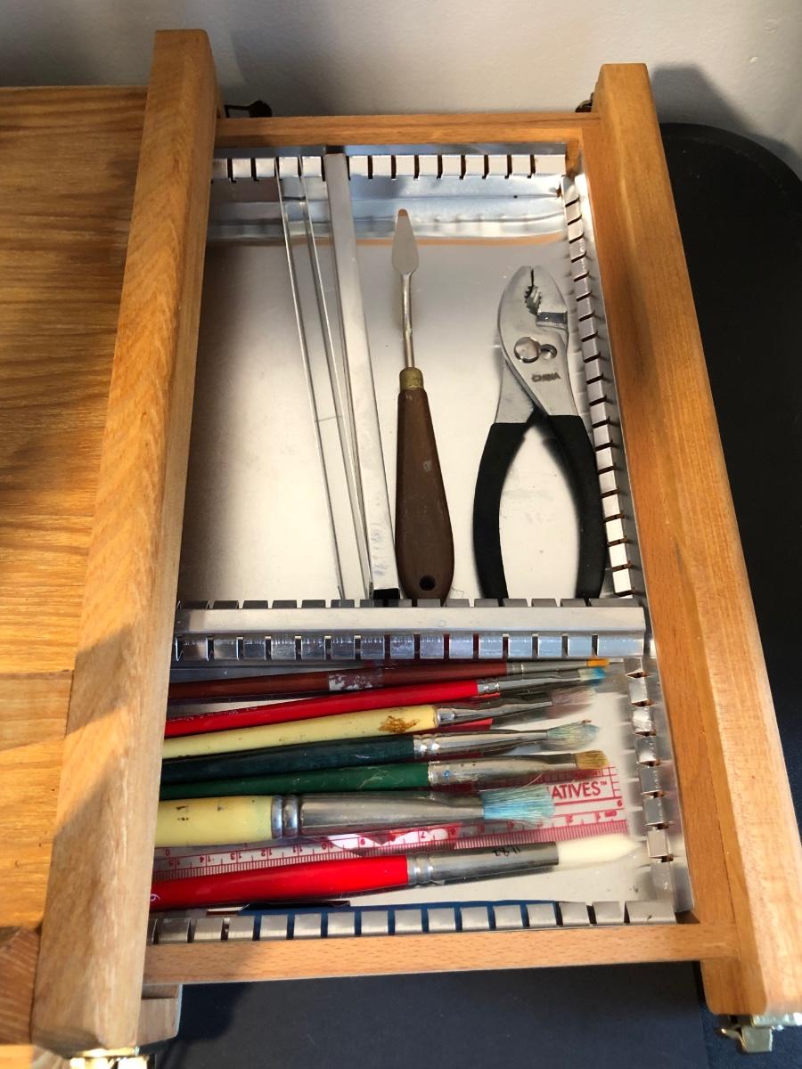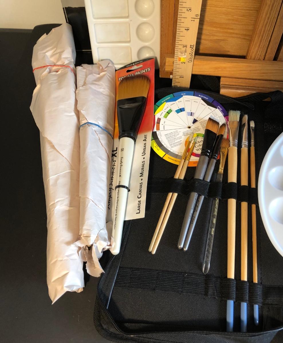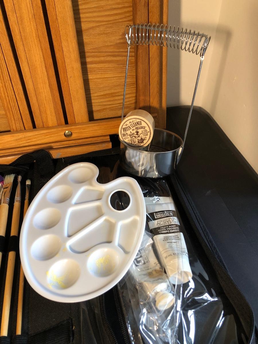 One foldable easel with a drawer. Includes various paint brushes, palettes, palette knives, and a brush cleaning tool.