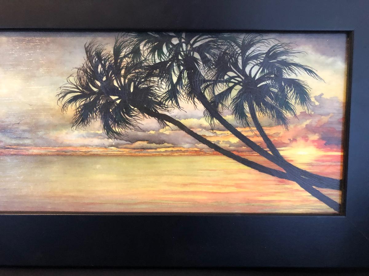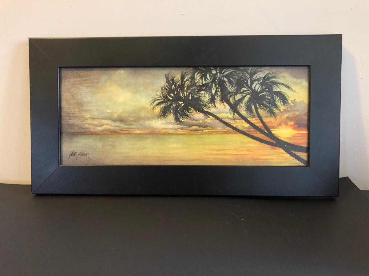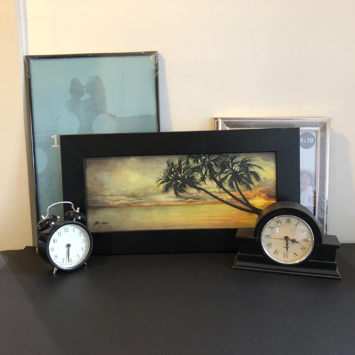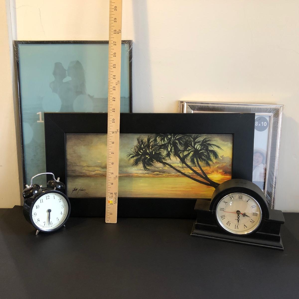 Includes a signed print of palm trees in a sunset, two photo frames (11 x 17 and 8 x 10), and two clocks.