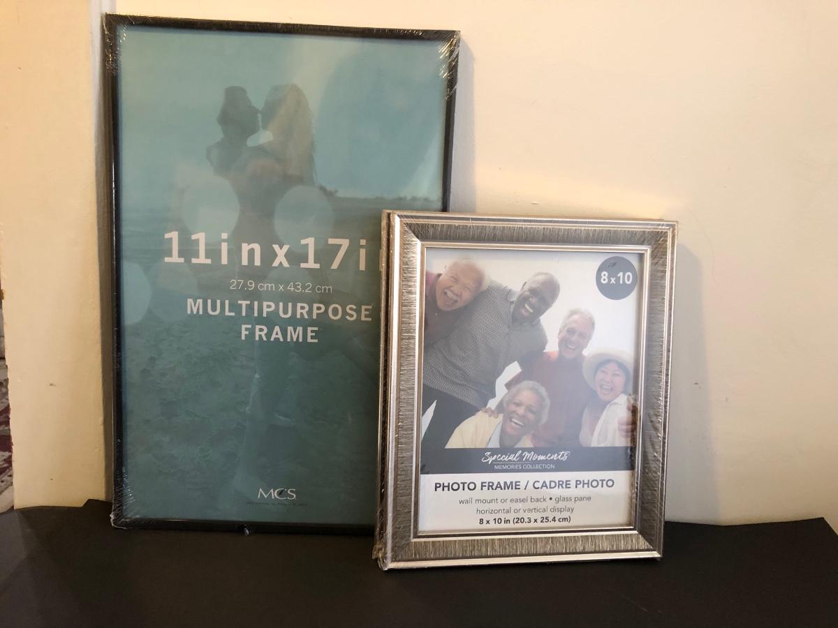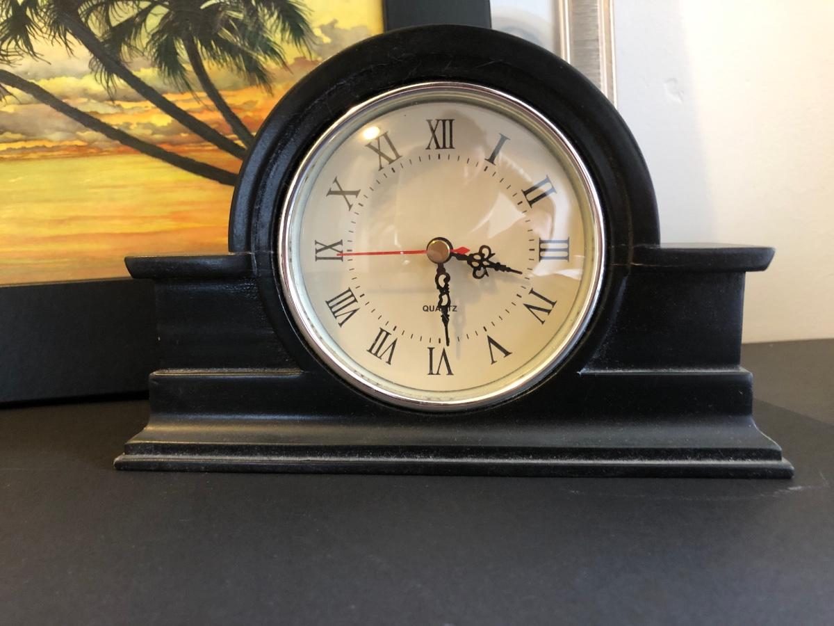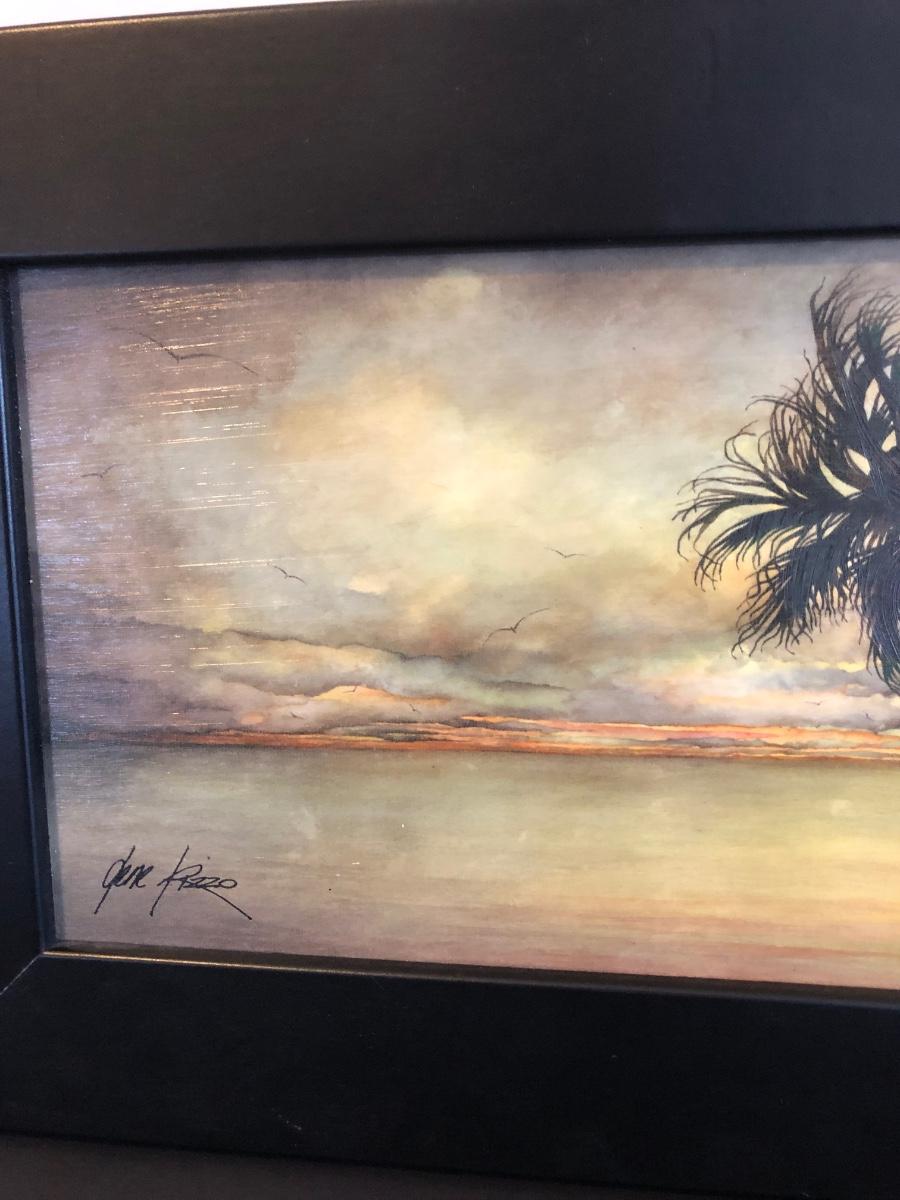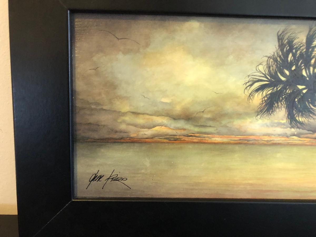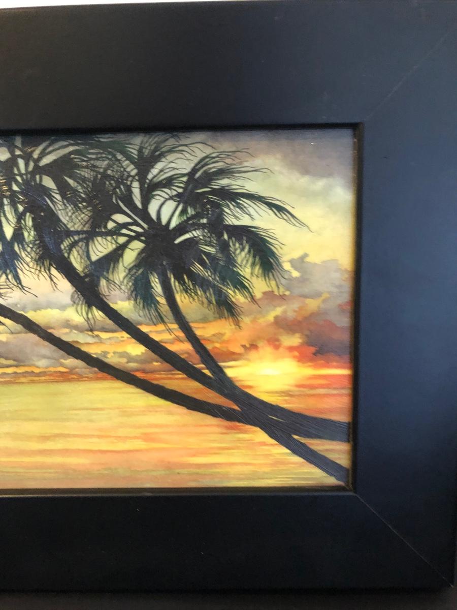 Includes a signed print of palm trees in a sunset, two photo frames (11 x 17 and 8 x 10), and two clocks.