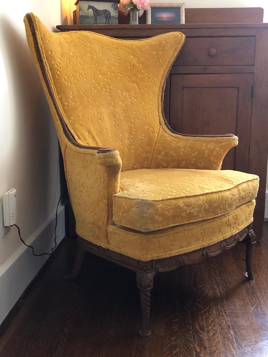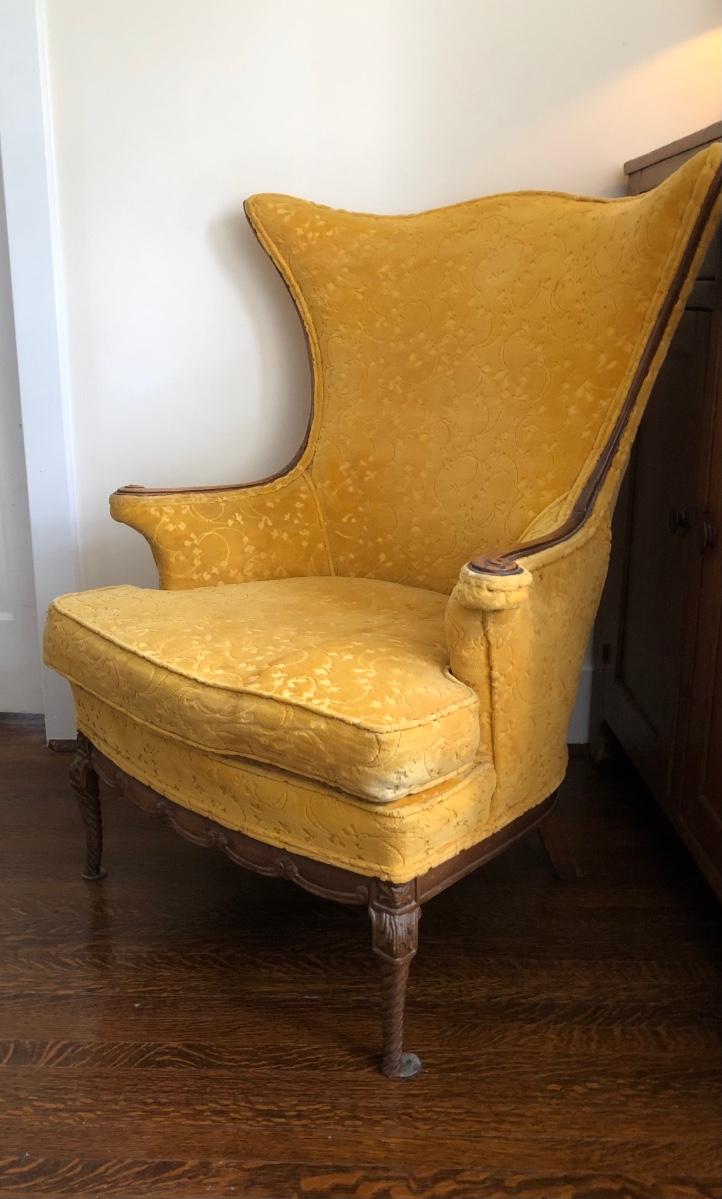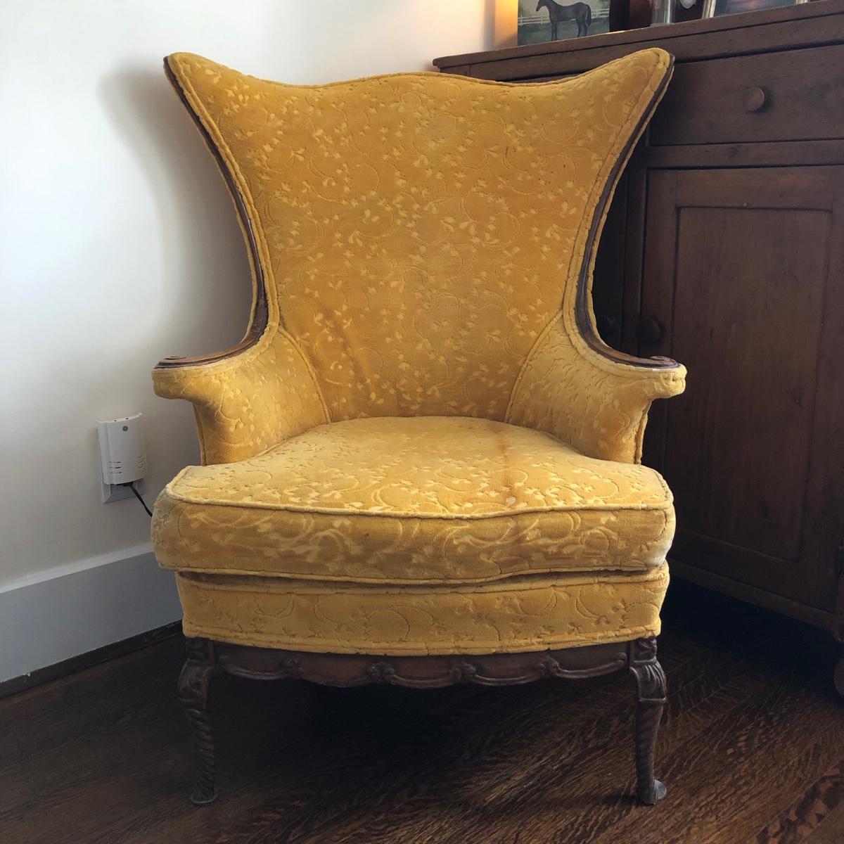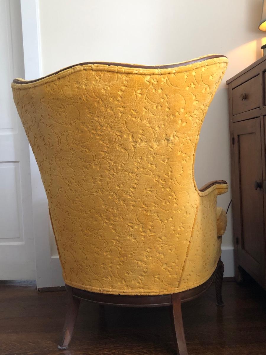 Accent chair in used condition. Yellow fabric with floral pattern and wooden base. Measures 33W x 29D x 42H.