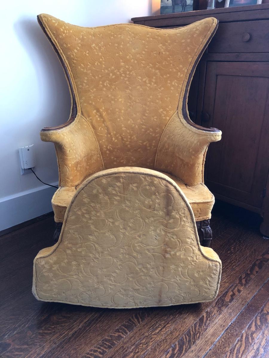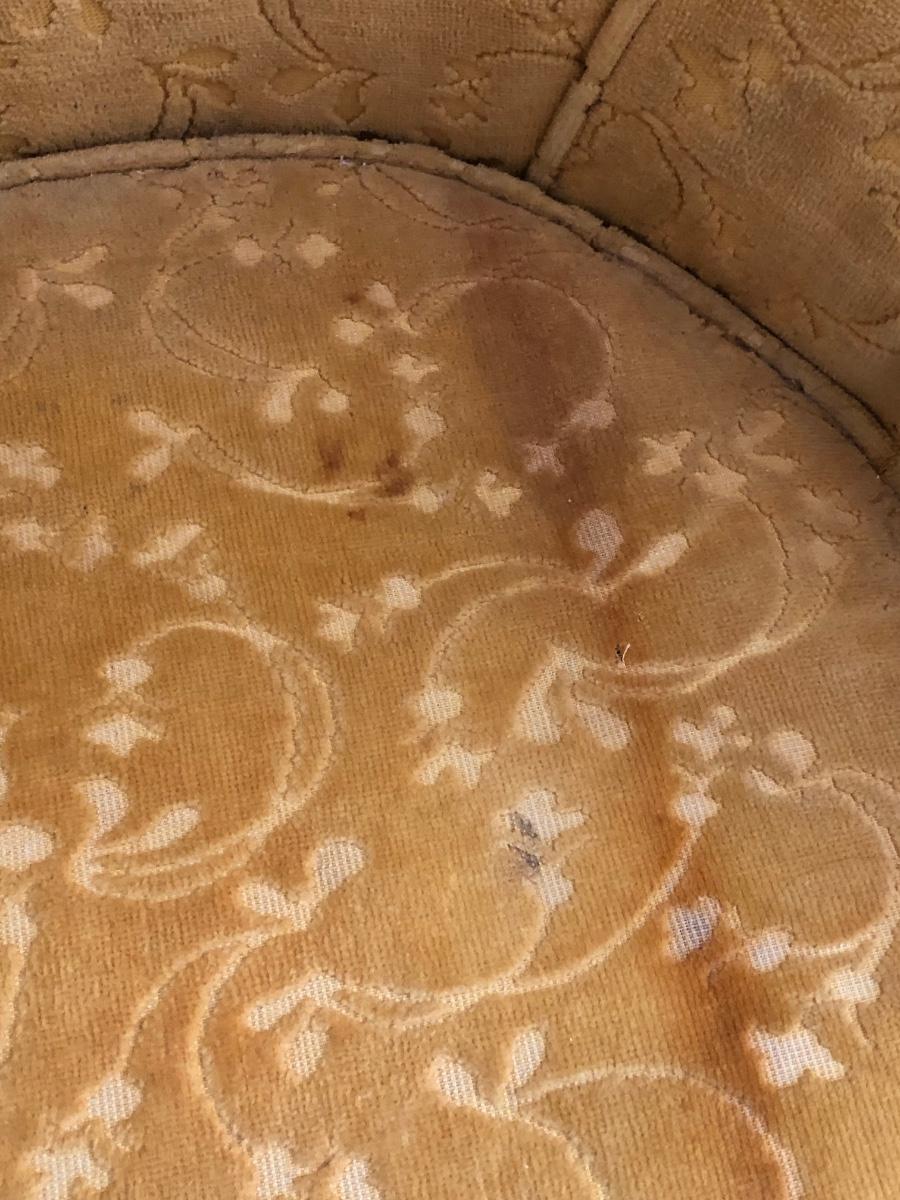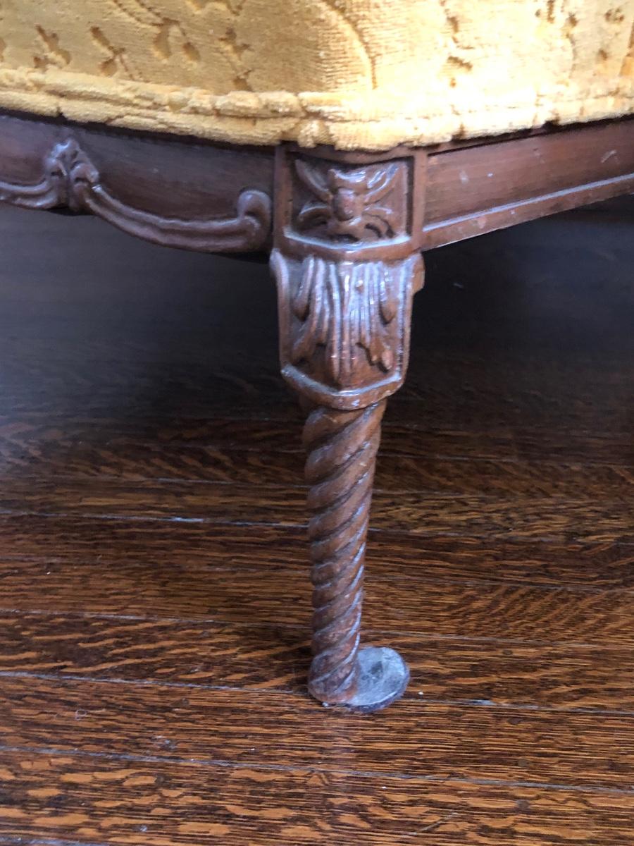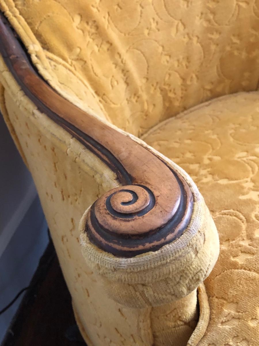 Accent chair in used condition. Yellow fabric with floral pattern and wooden base. Measures 33W x 29D x 42H.