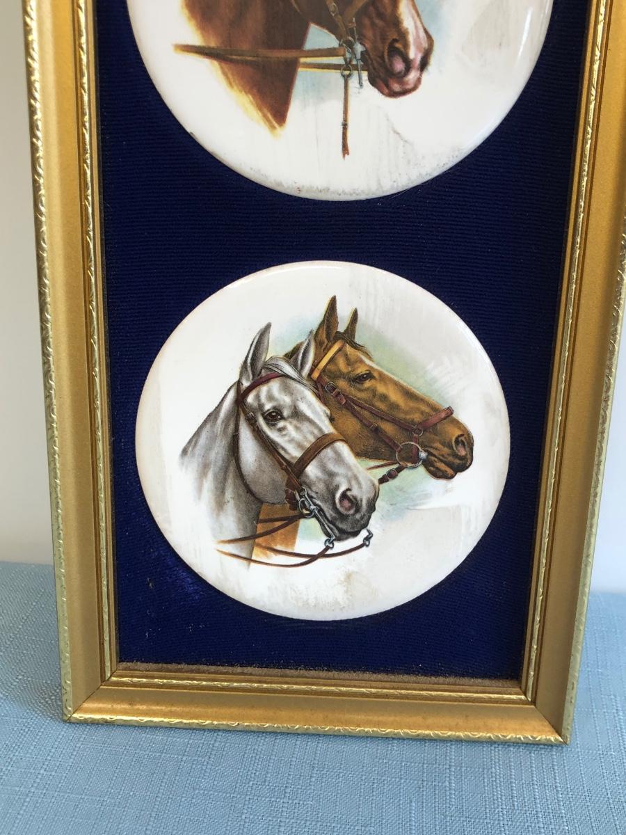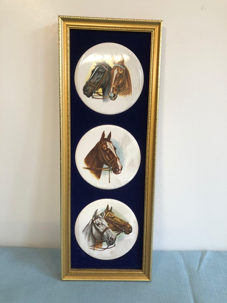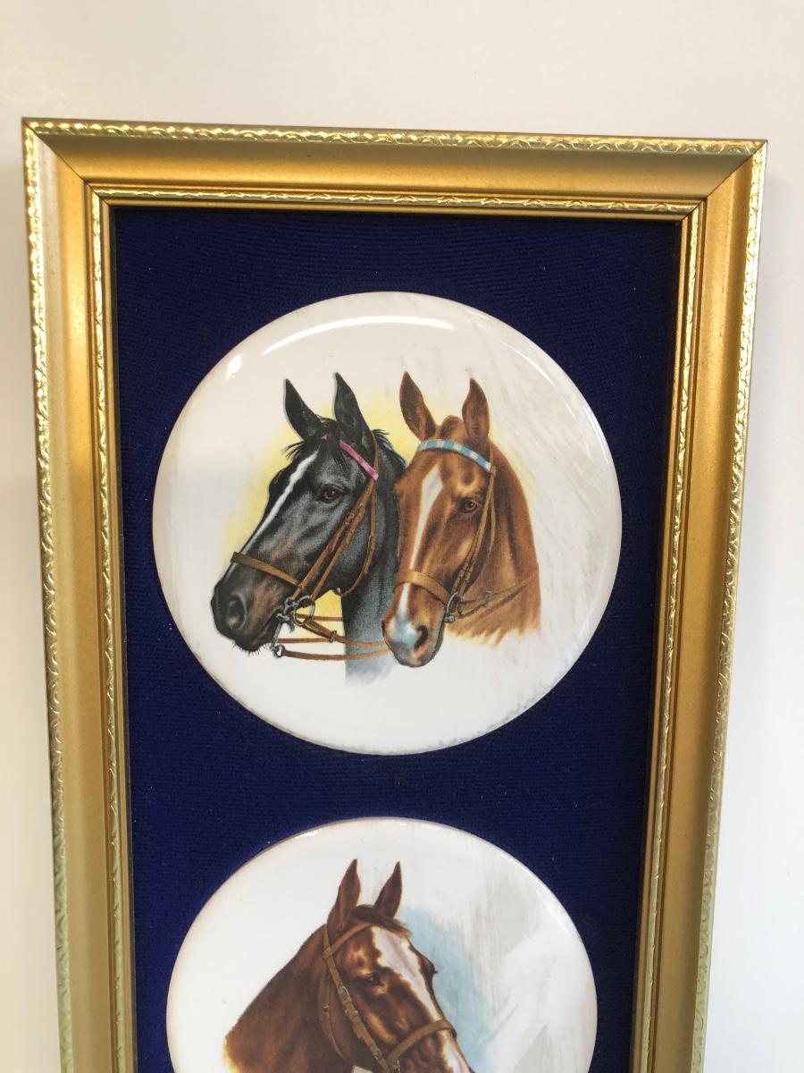 LOT 51M: Harleigh China Company Framed Ceramic Horses, Chesapeake Reproductions Bronze Horse Jockey Statue, Decorative Brass Hunting French Horns & Candle Holders