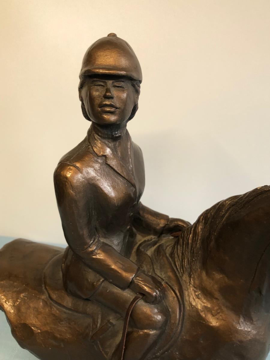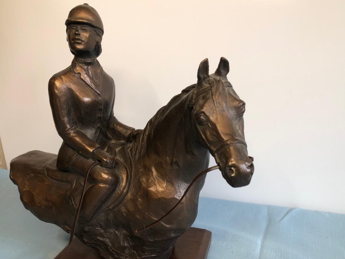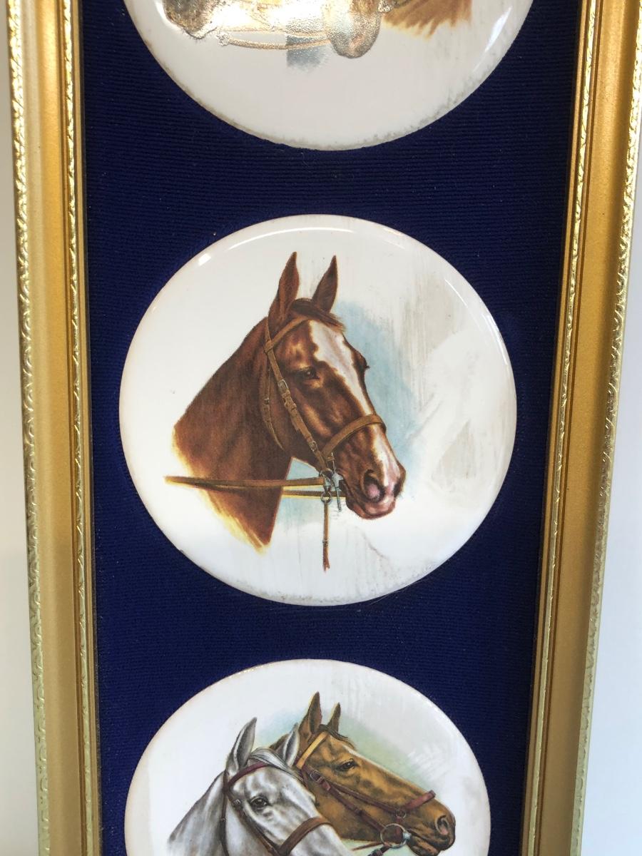 LOT 51M: Harleigh China Company Framed Ceramic Horses, Chesapeake Reproductions Bronze Horse Jockey Statue, Decorative Brass Hunting French Horns & Candle Holders