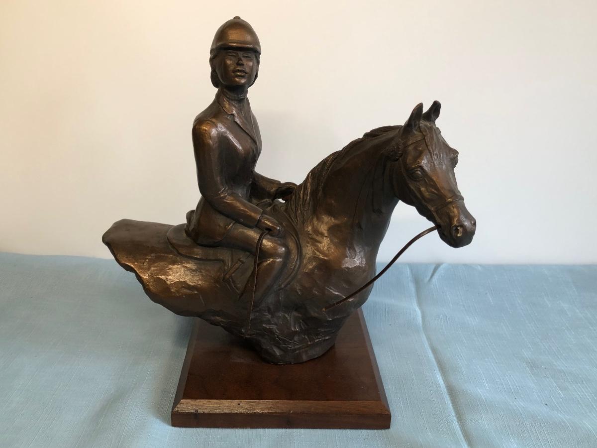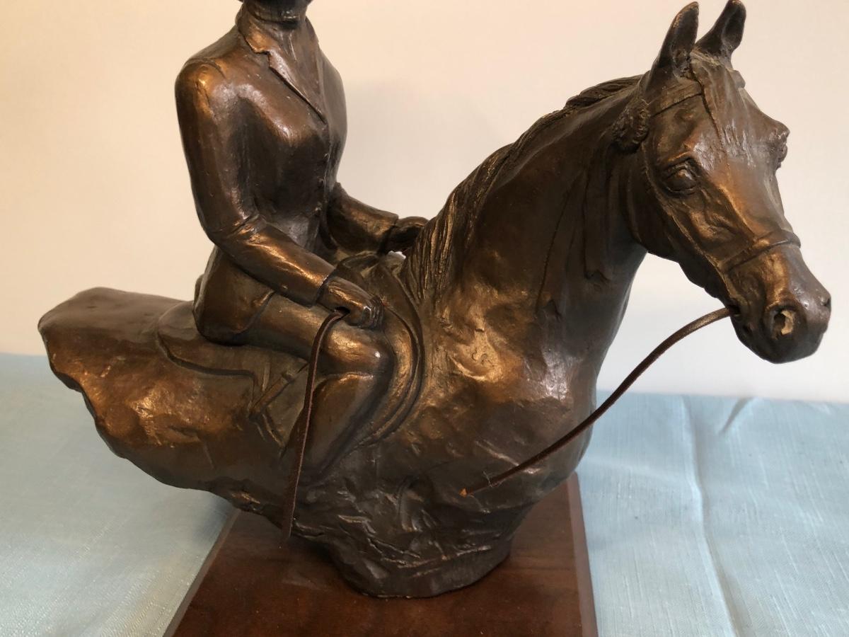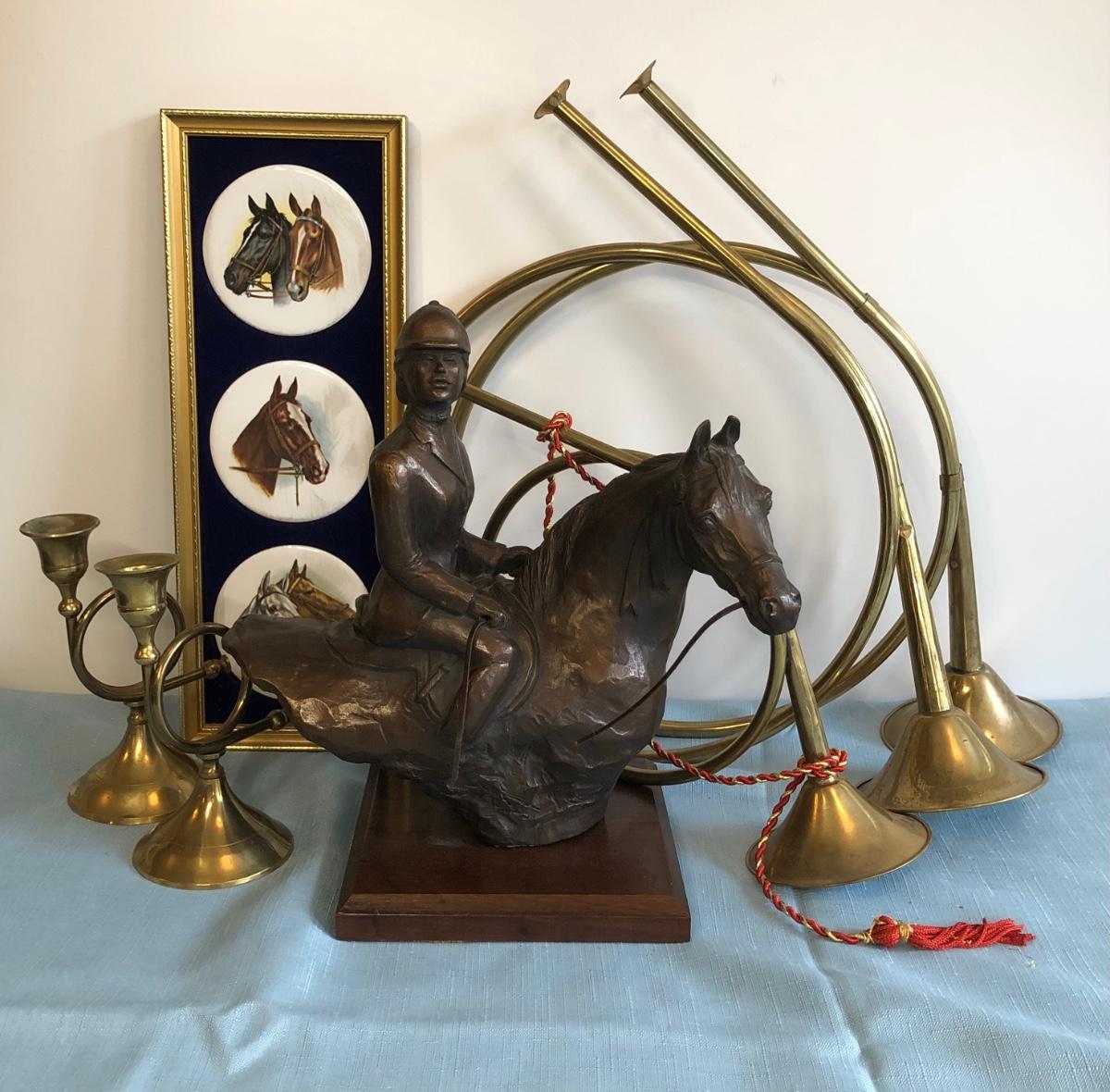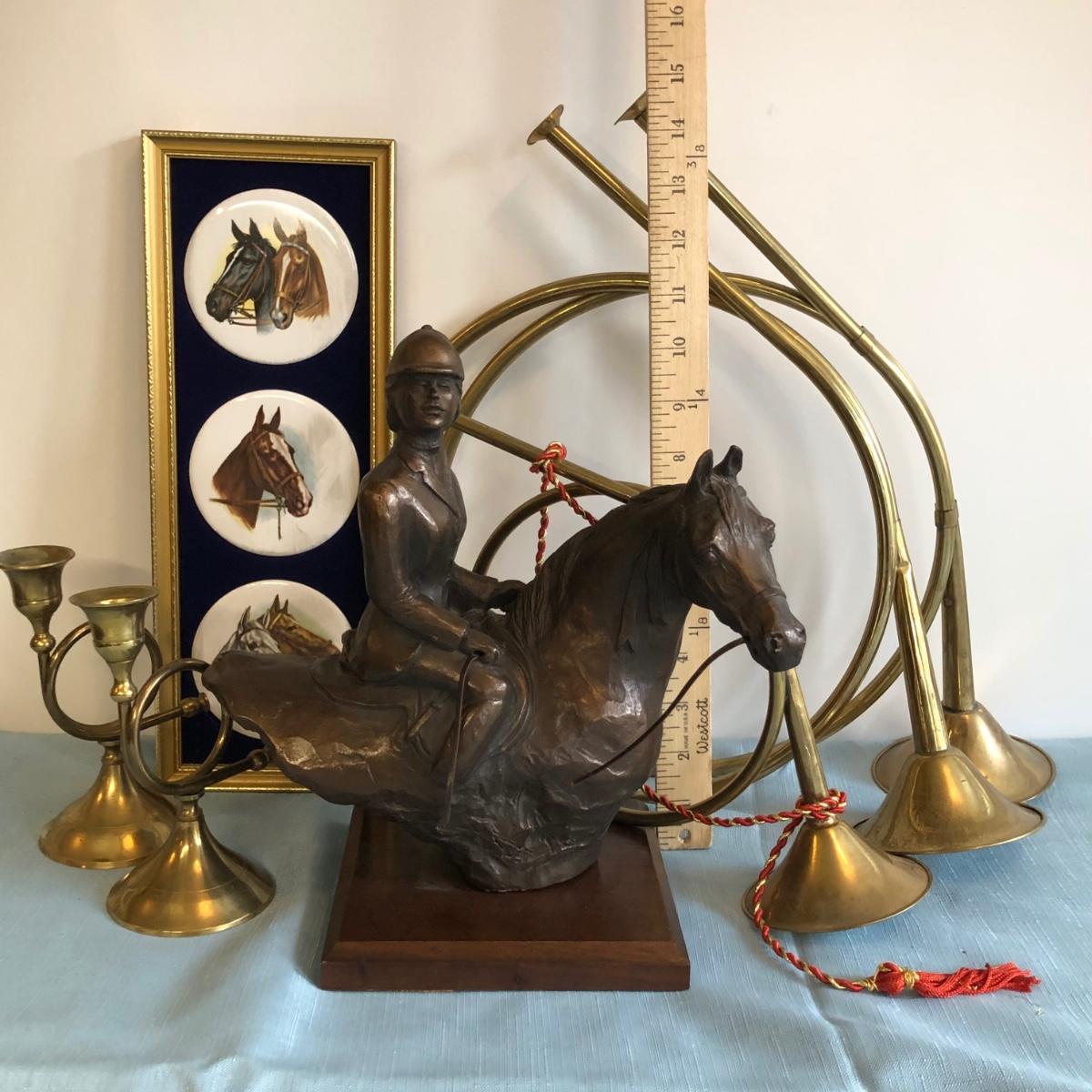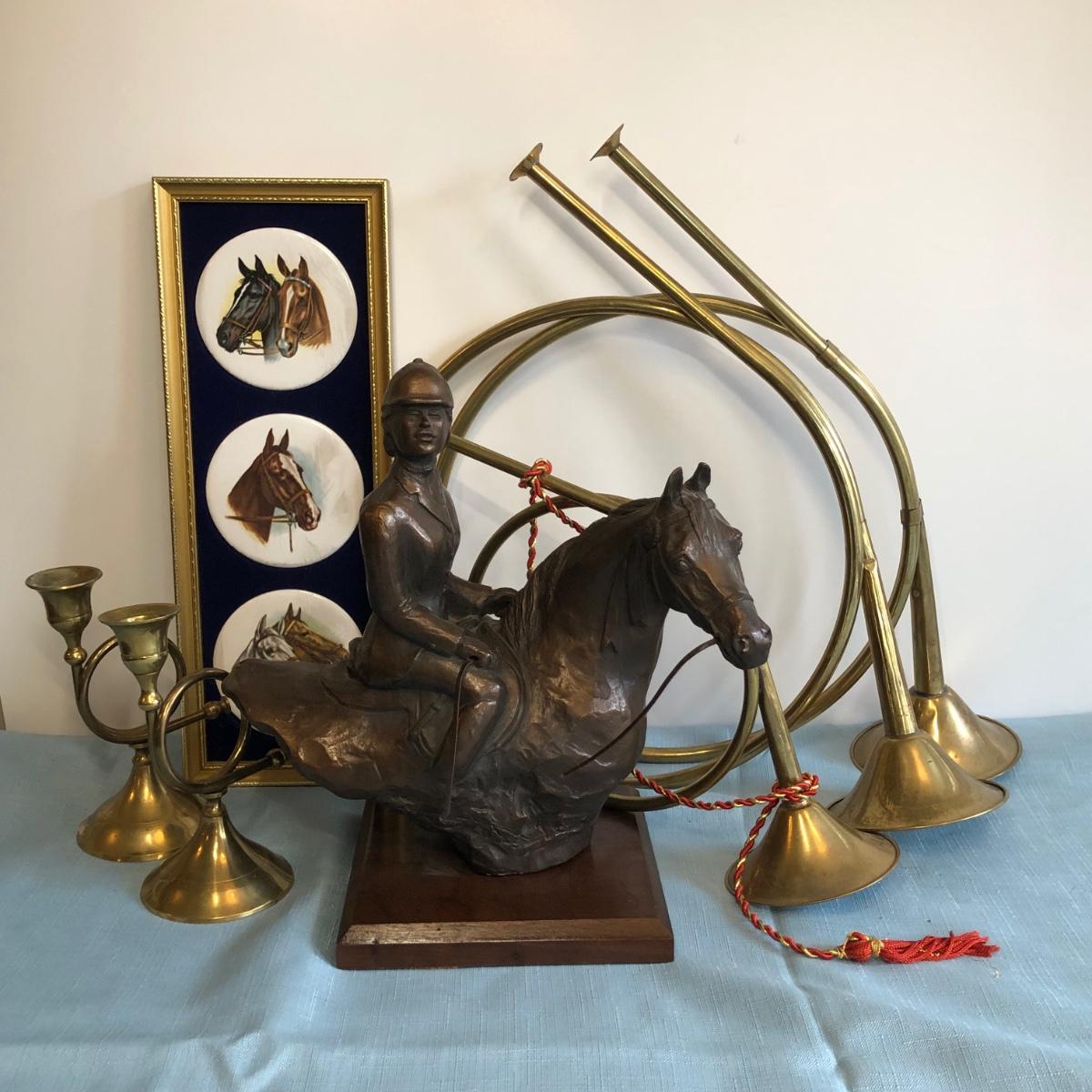 Includes Harleigh China Company's genuine Staffordshire ceramics wall hanging with three small ceramic discs, three decorative French hunting horns, a bronze reproduction statue of a horse jockey, and two French horn candle holders.