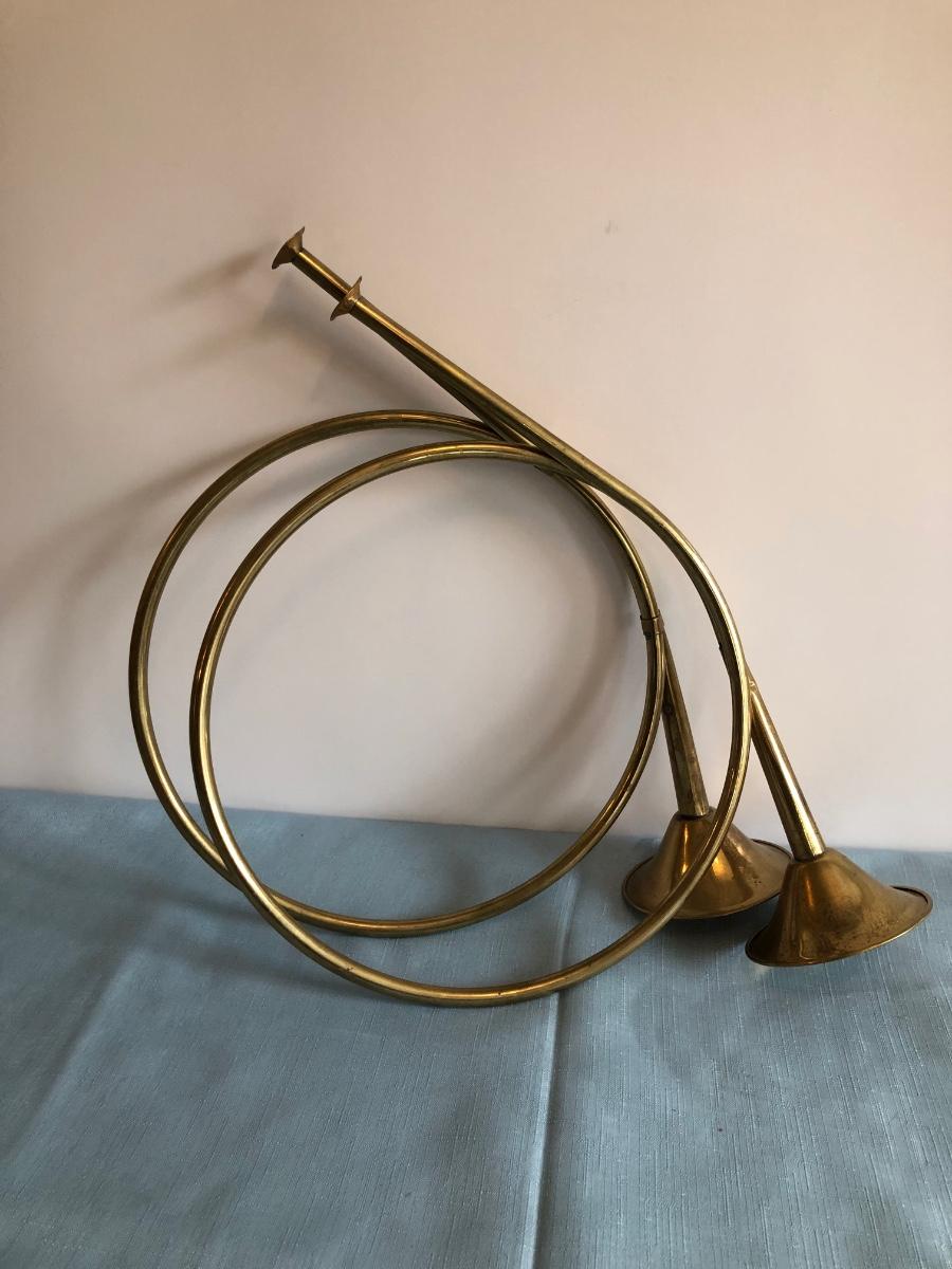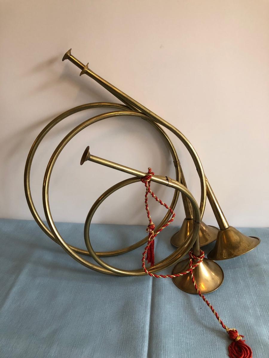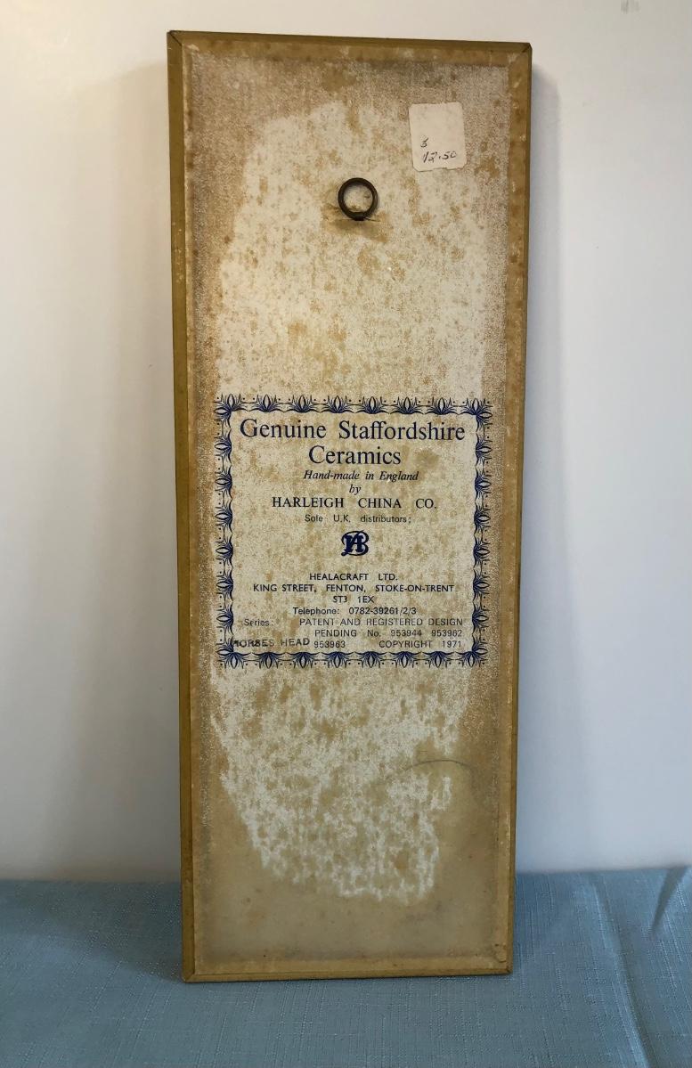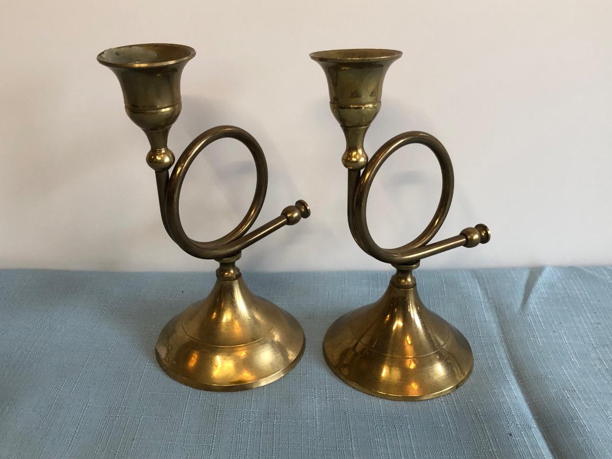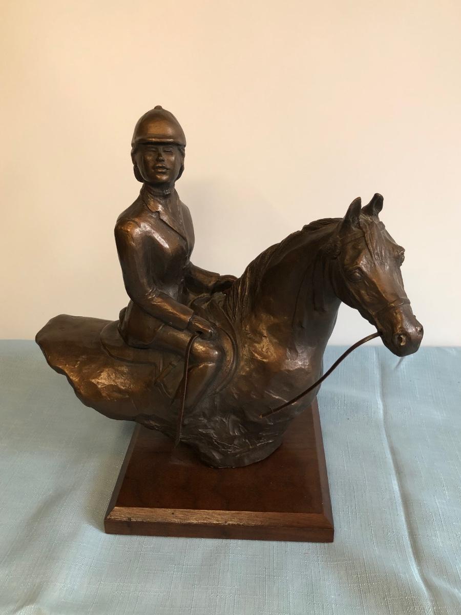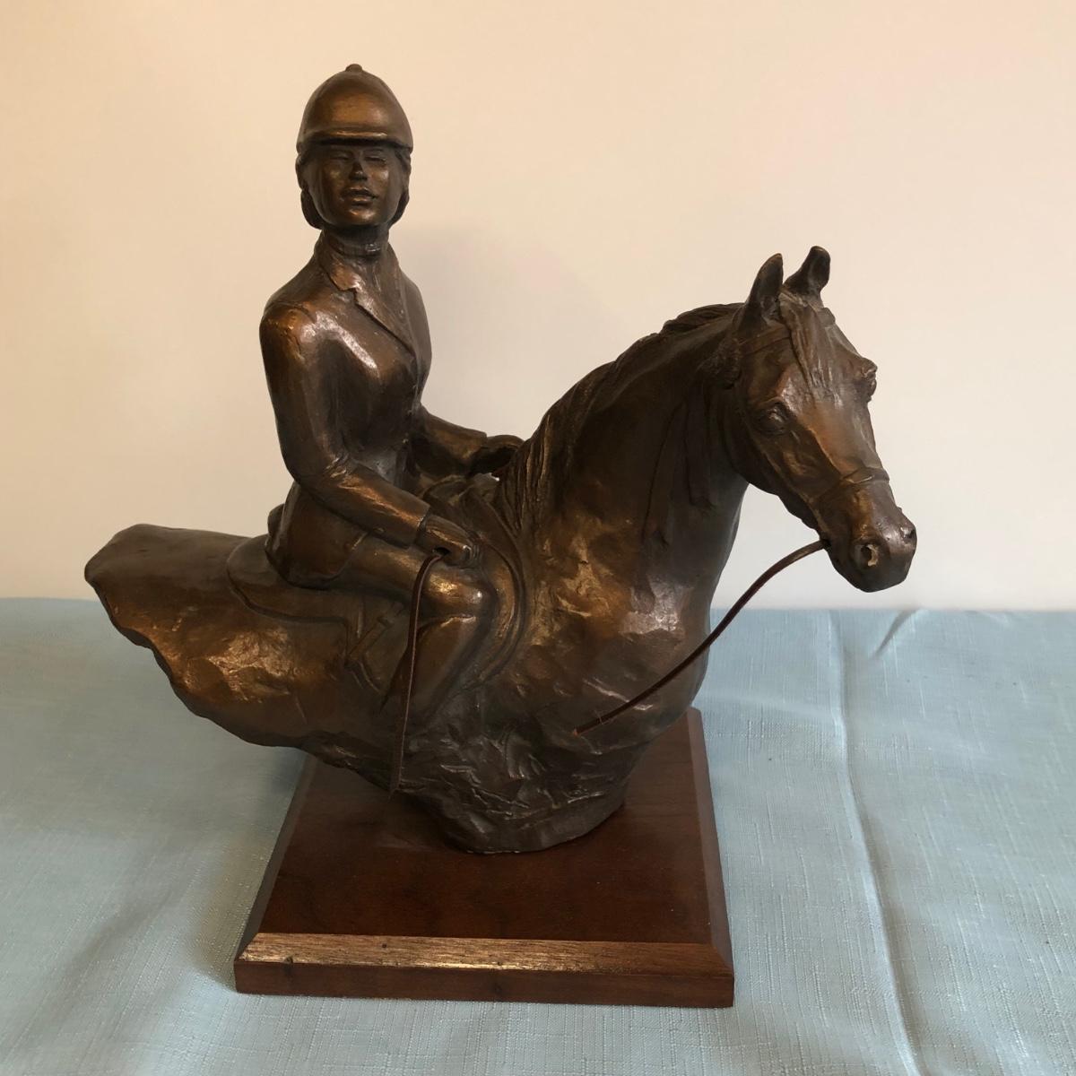 Includes Harleigh China Company's genuine Staffordshire ceramics wall hanging with three small ceramic discs, three decorative French hunting horns, a bronze reproduction statue of a horse jockey, and two French horn candle holders.