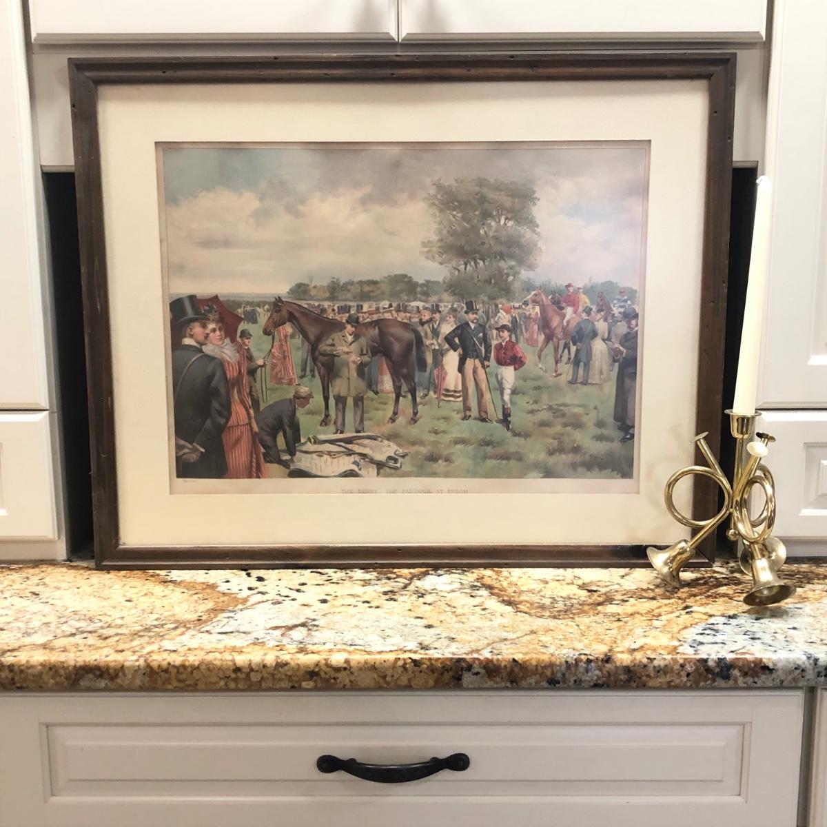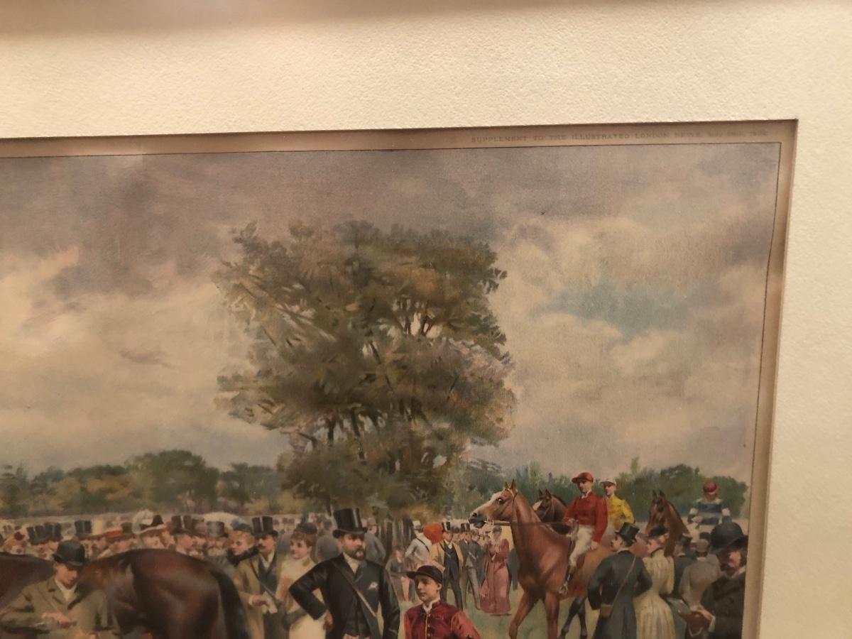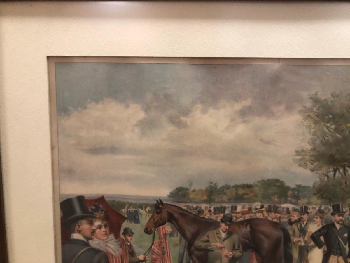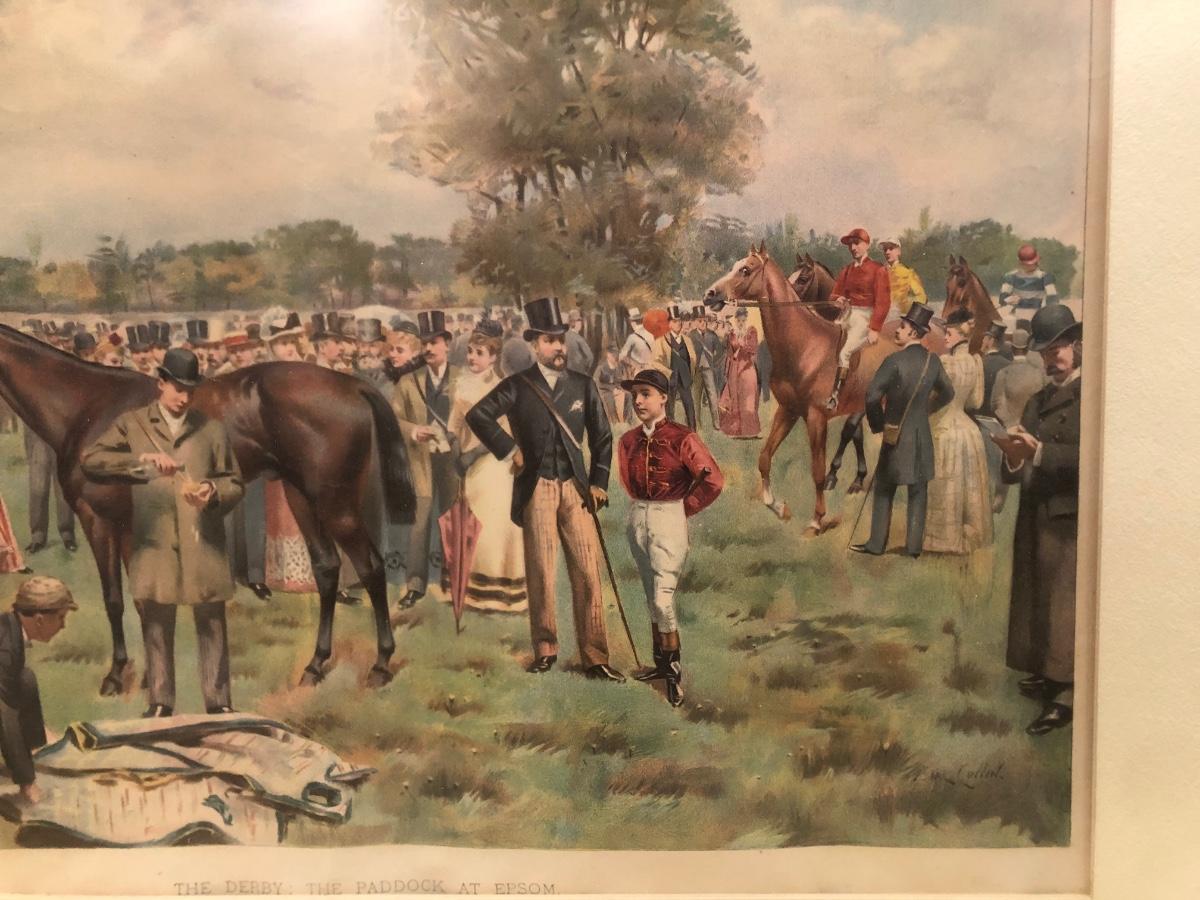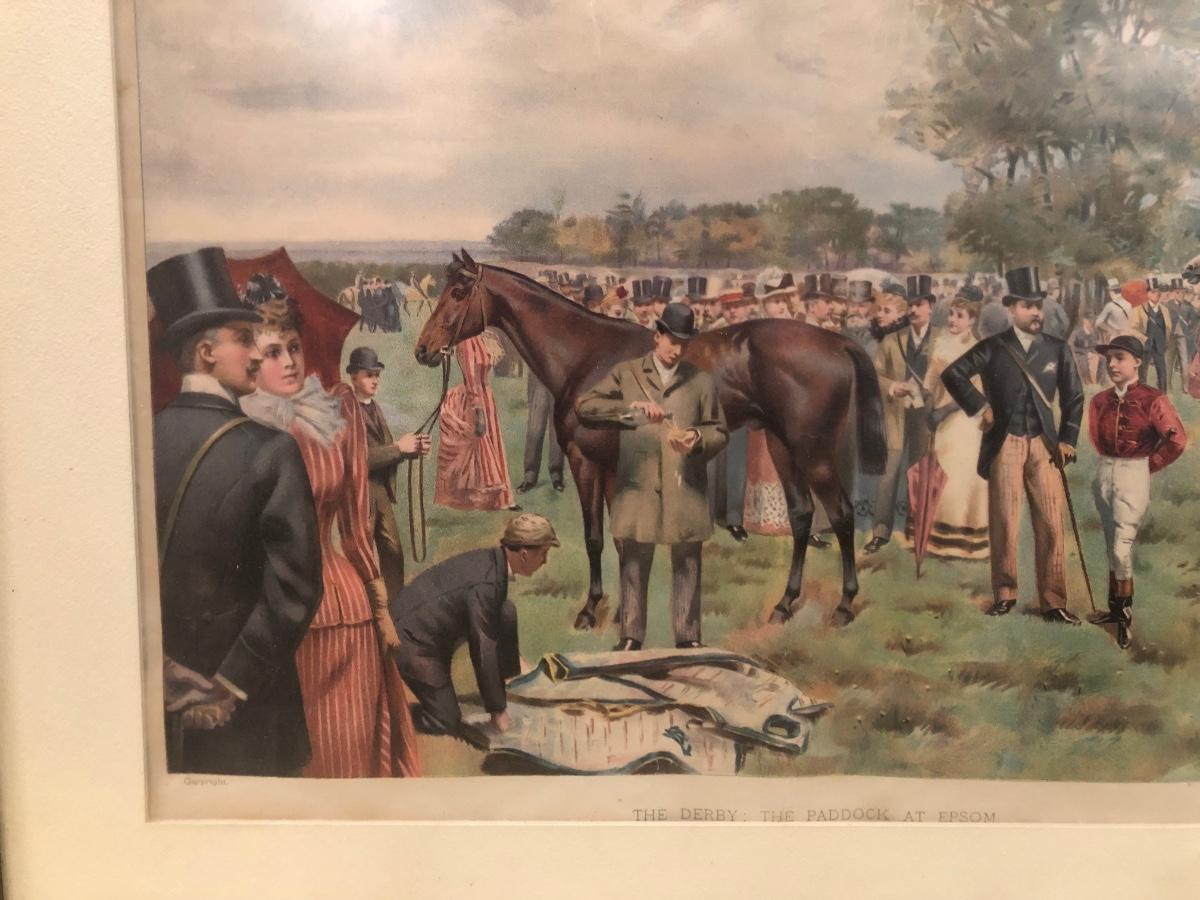 LOT 53M: Framed "The Derby: Paddock at Epsom" Print & French Horn Candle Holder
