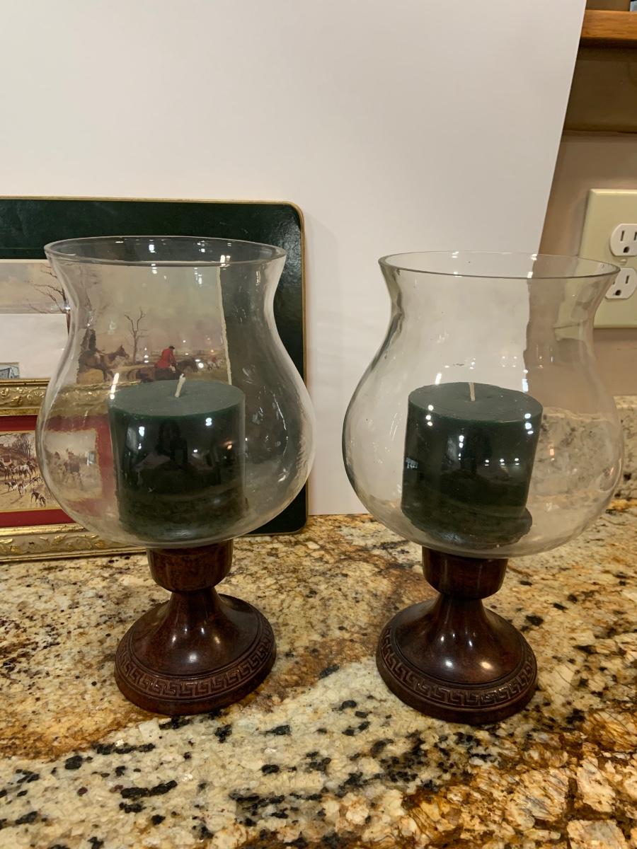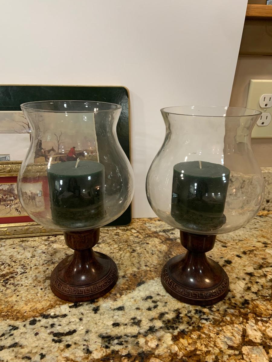LOT:70G: Rustic Decor with Royal Staffordshire Bowl, Wood and Hurricane Glass Candle Holders  Cooper Pot Wall Art & More