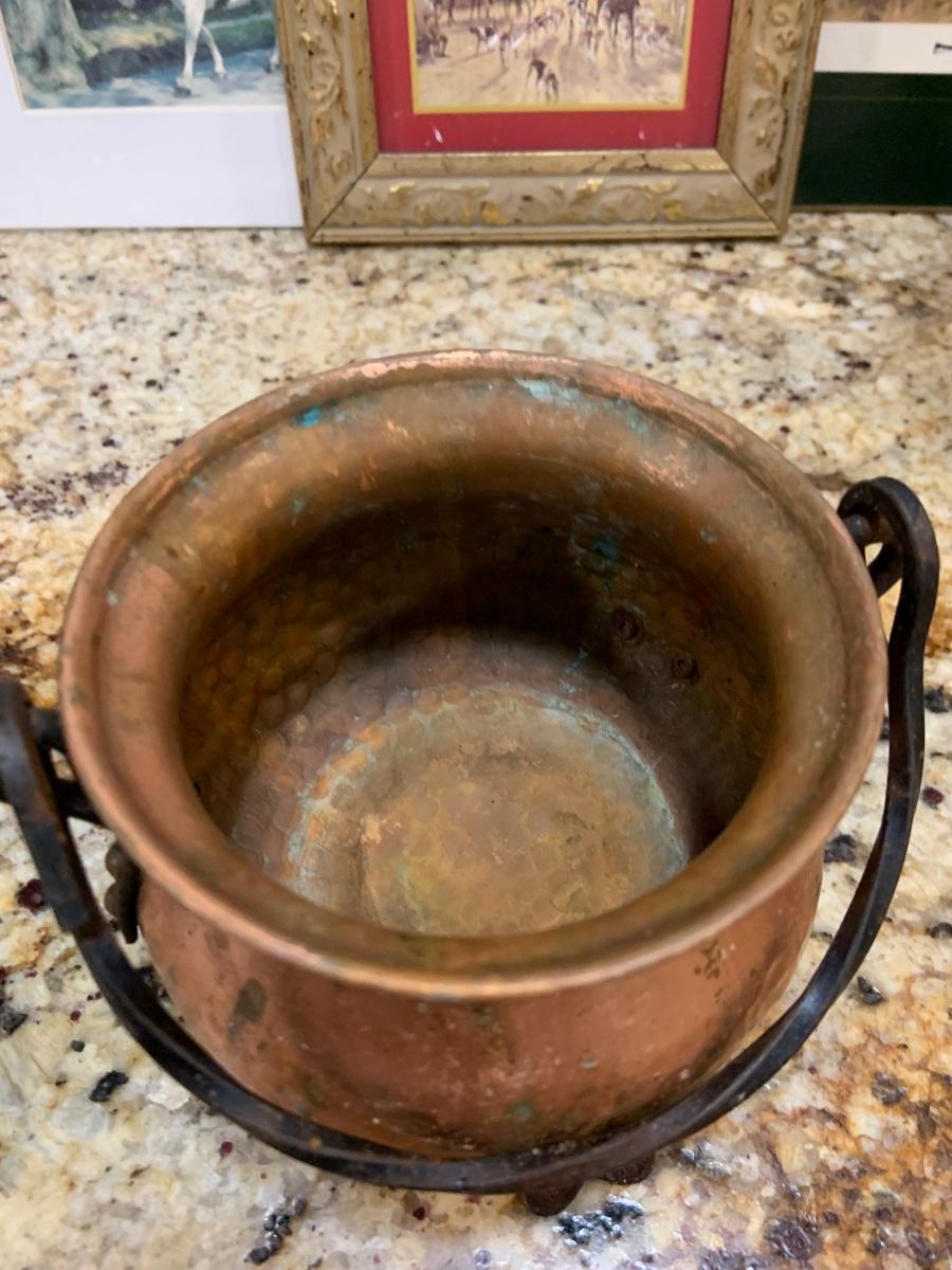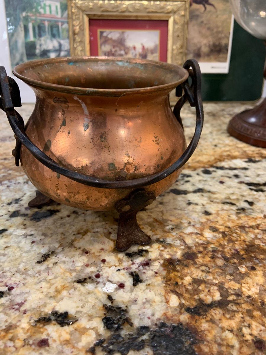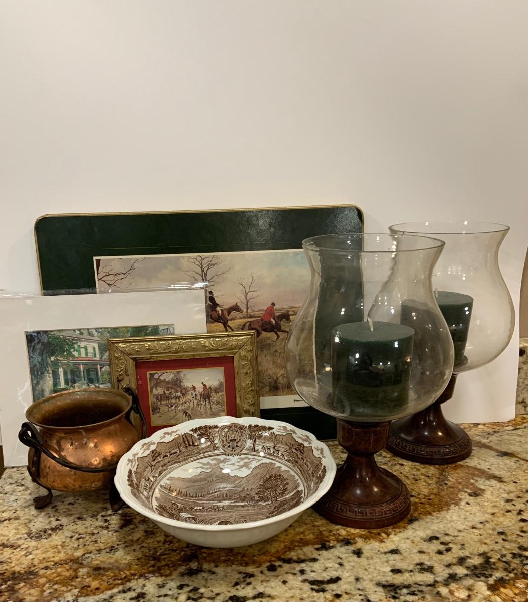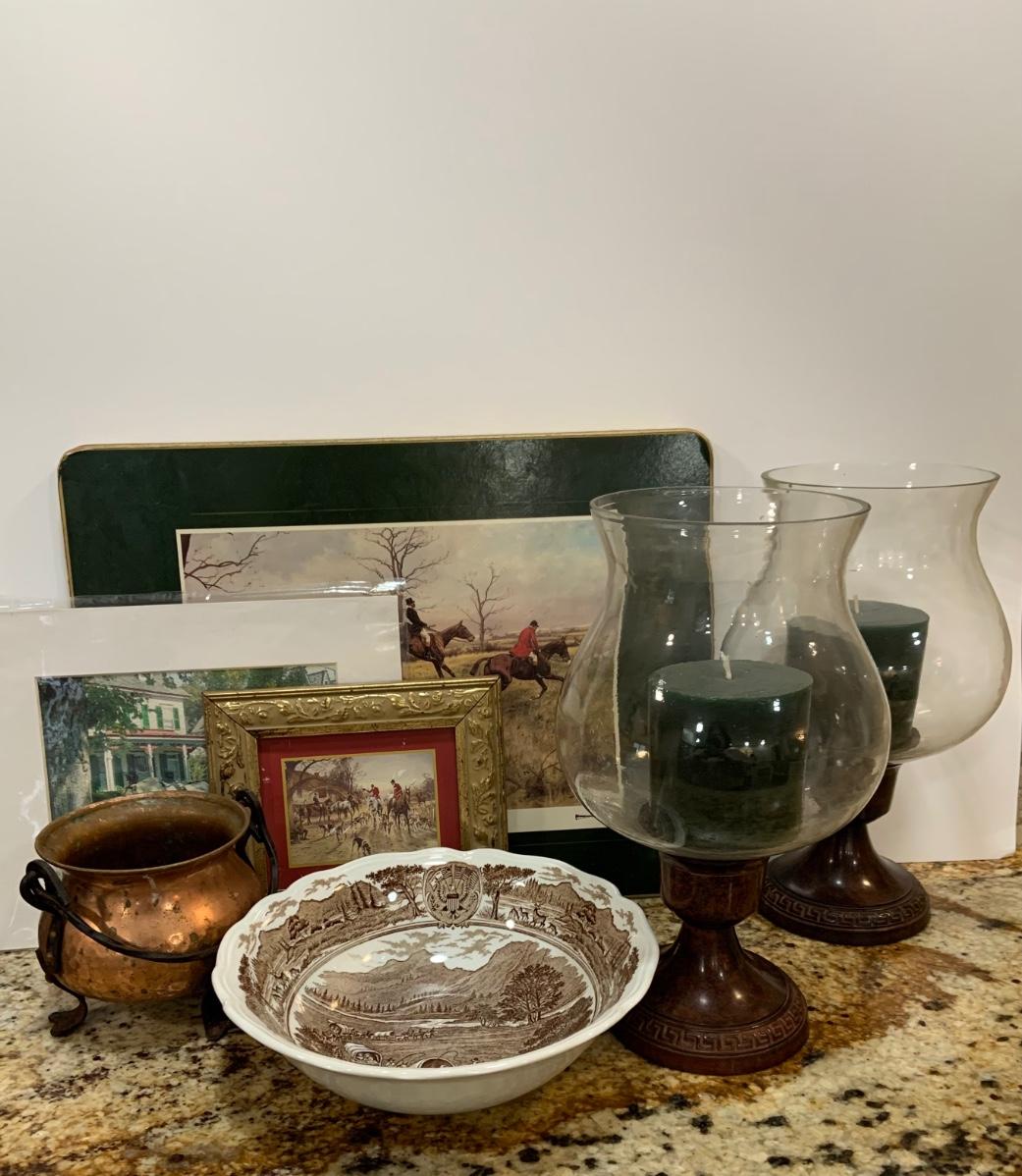 LOT:70G: Rustic Decor with Royal Staffordshire Bowl, Wood and Hurricane Glass Candle Holders Cooper Pot Wall Art & More