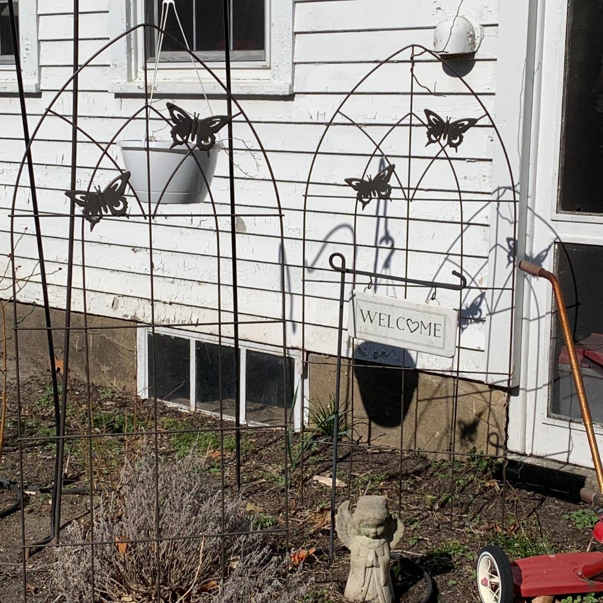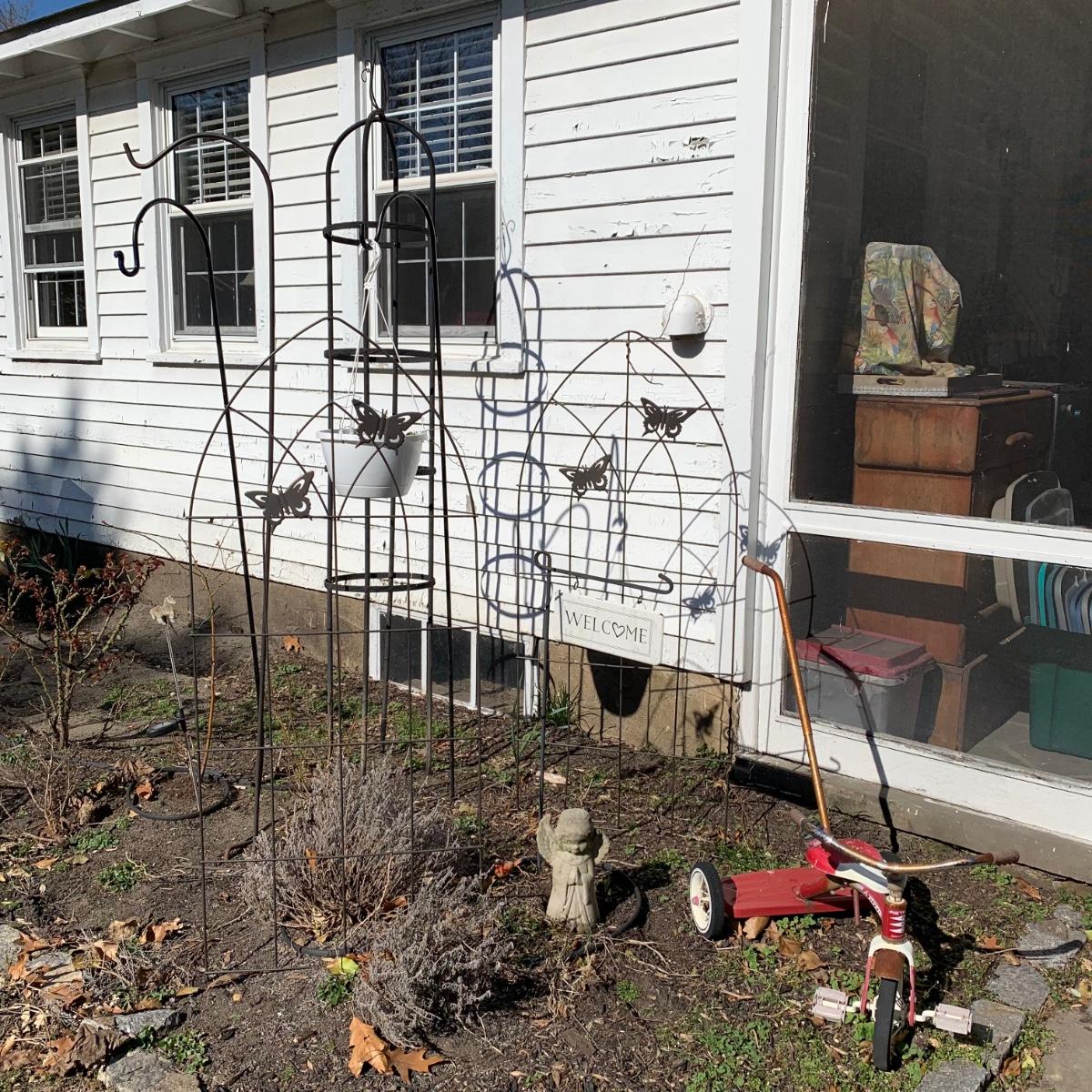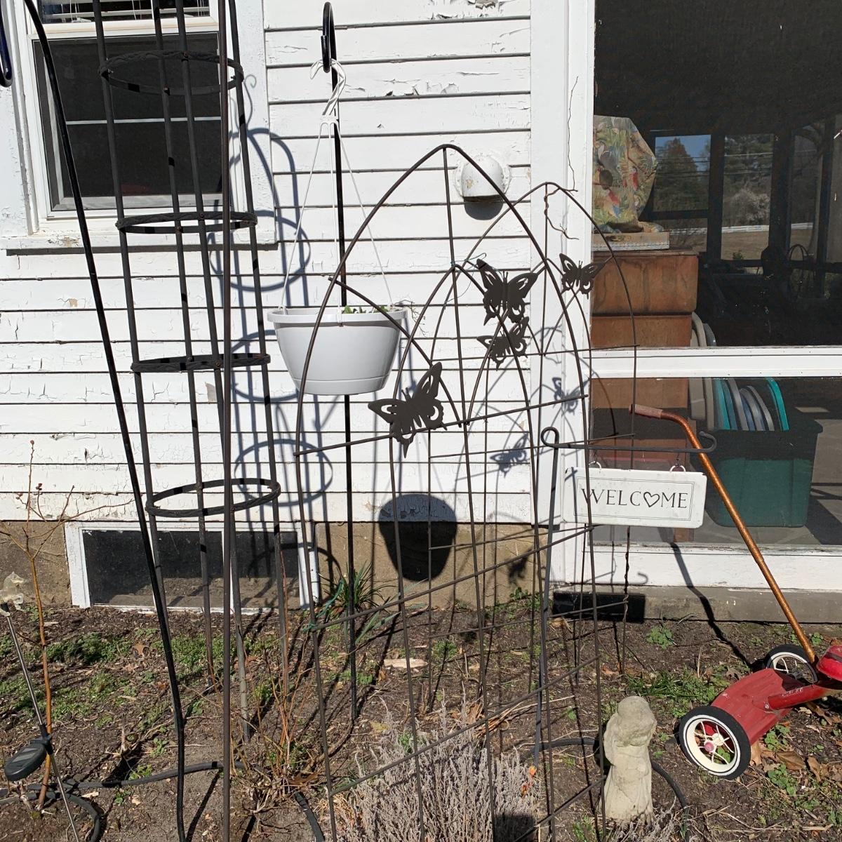 LOT 87R: Garden Decor: Trellis's, Shepherd 's Hooks, Tricycle, Welcome Sign