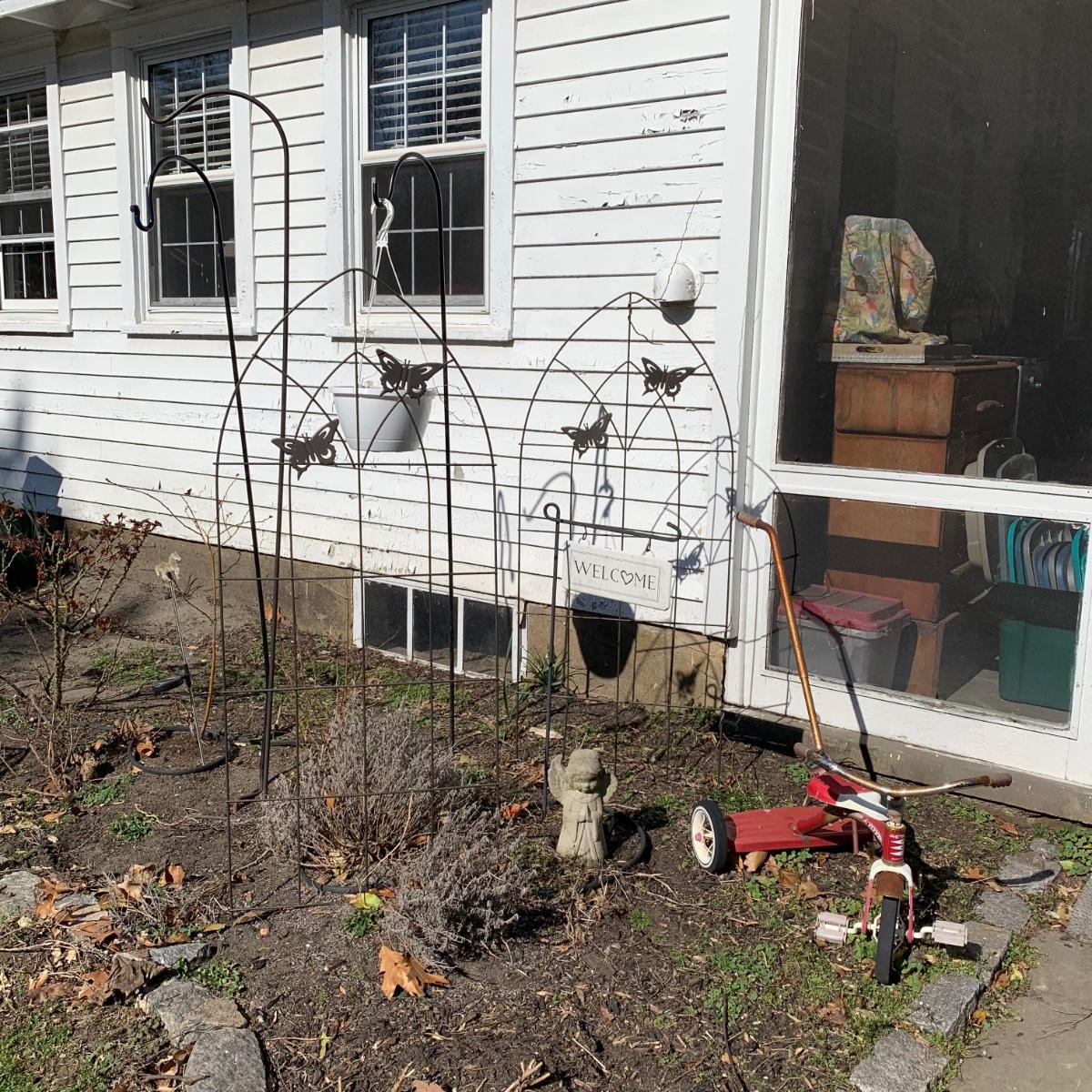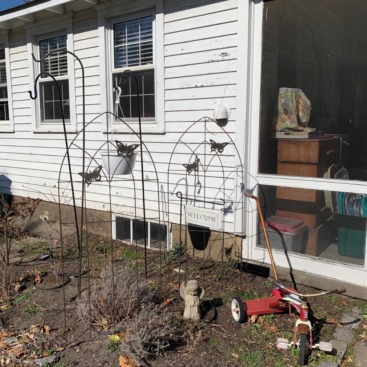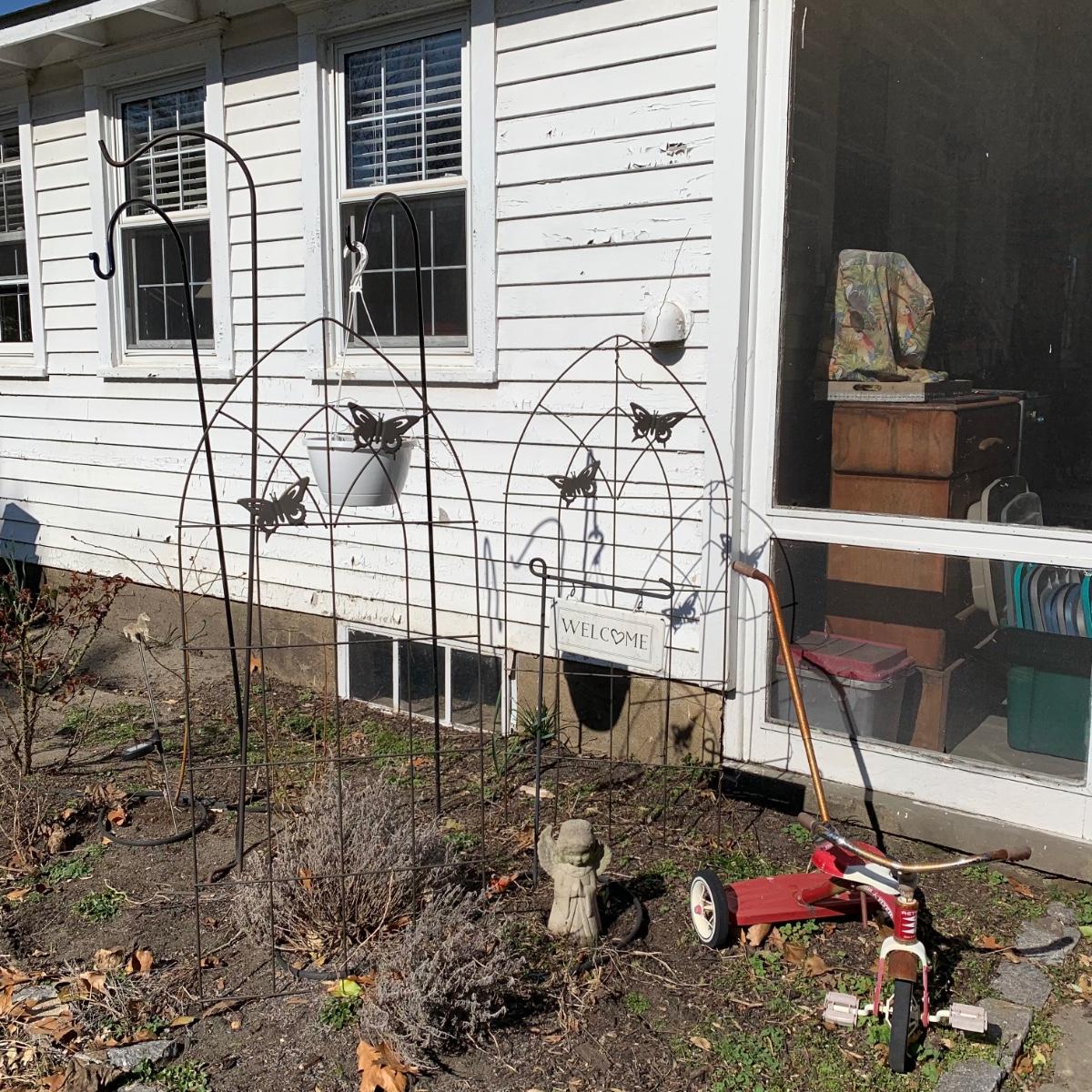 LOT 87R: Garden Decor: Trellis's, Shepherd 's Hooks, Tricycle, Welcome Sign